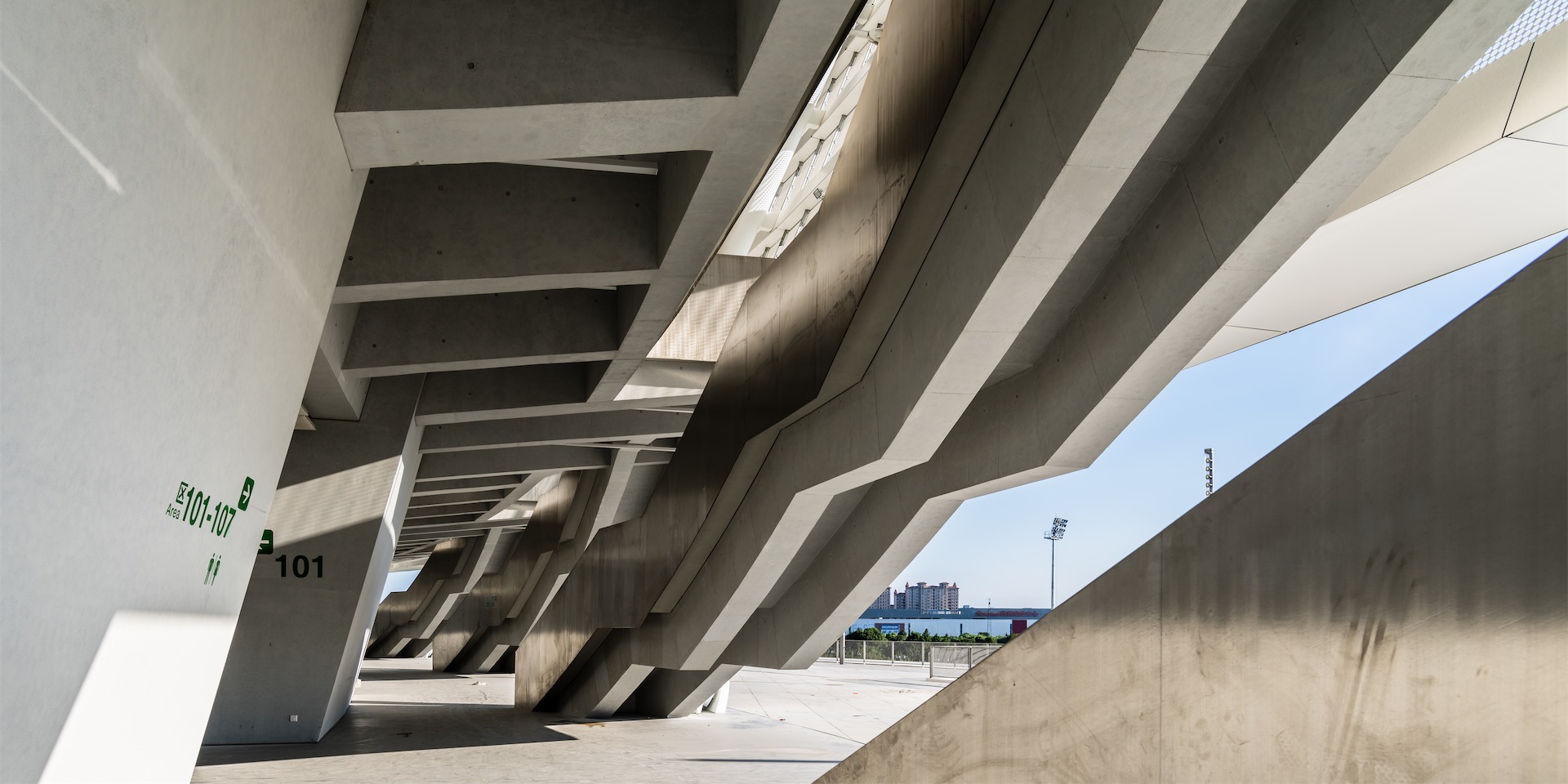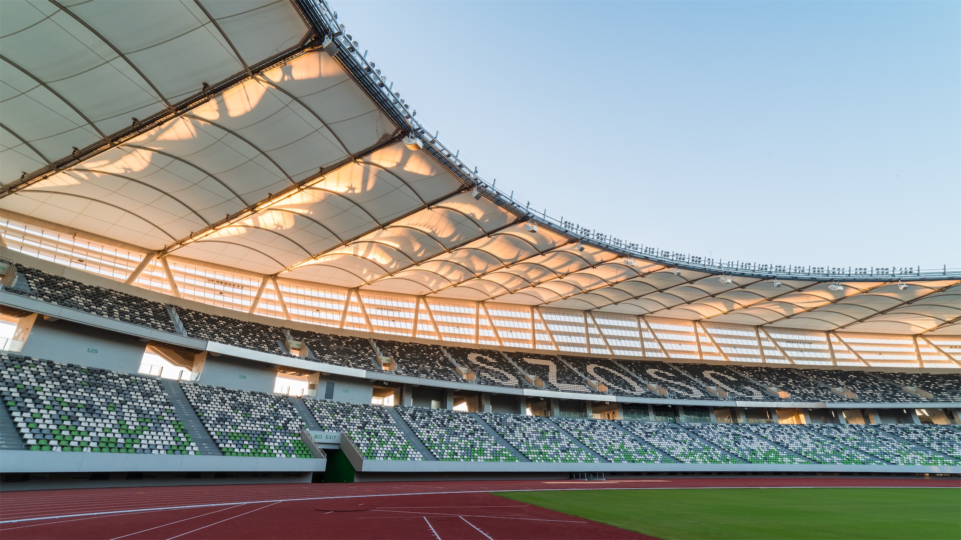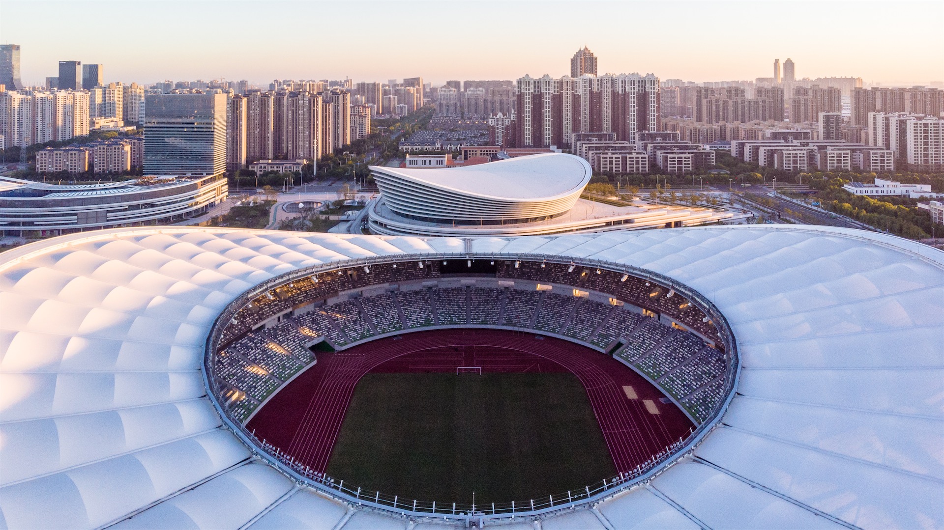 单体设计运用统一的建筑语言。三个体育场馆顶部根据结构的受力要求呈马鞍形,立面已水平线条形成优雅的起伏,建筑造型典雅新颖,如三座美丽的皇冠升起在平台基座之上,具有鲜明的地标性。