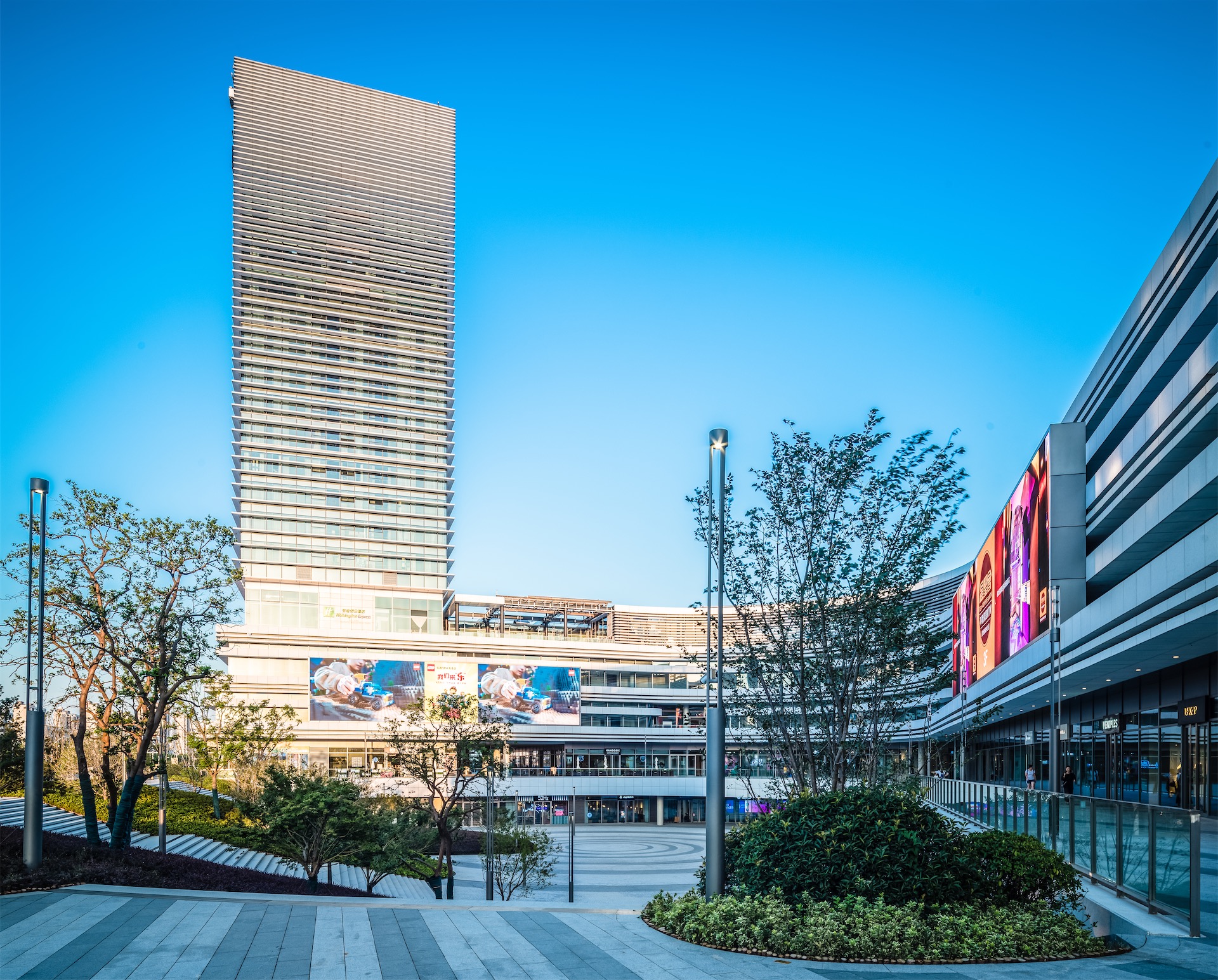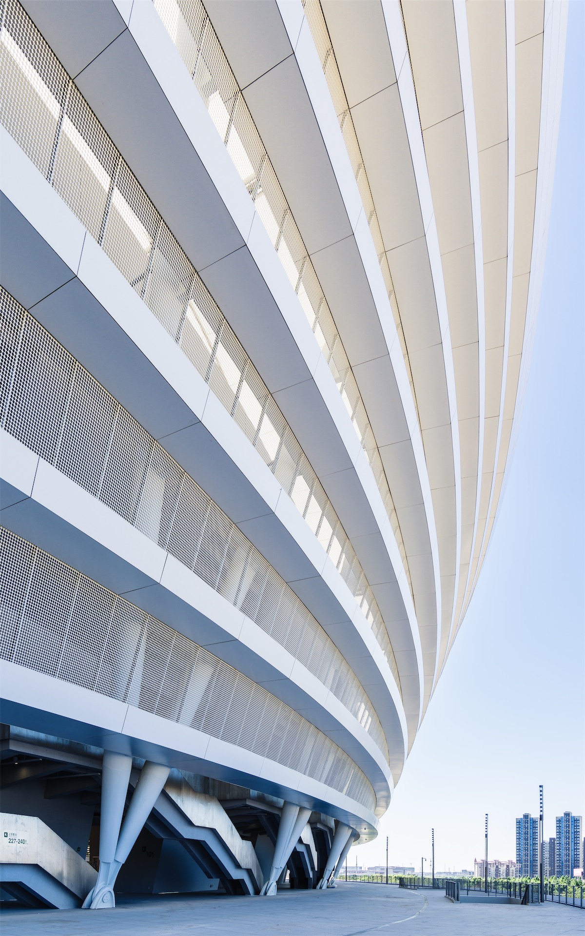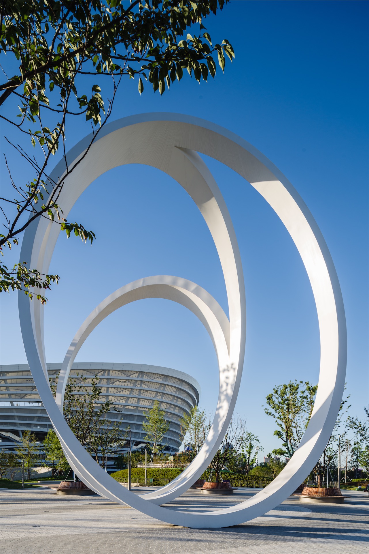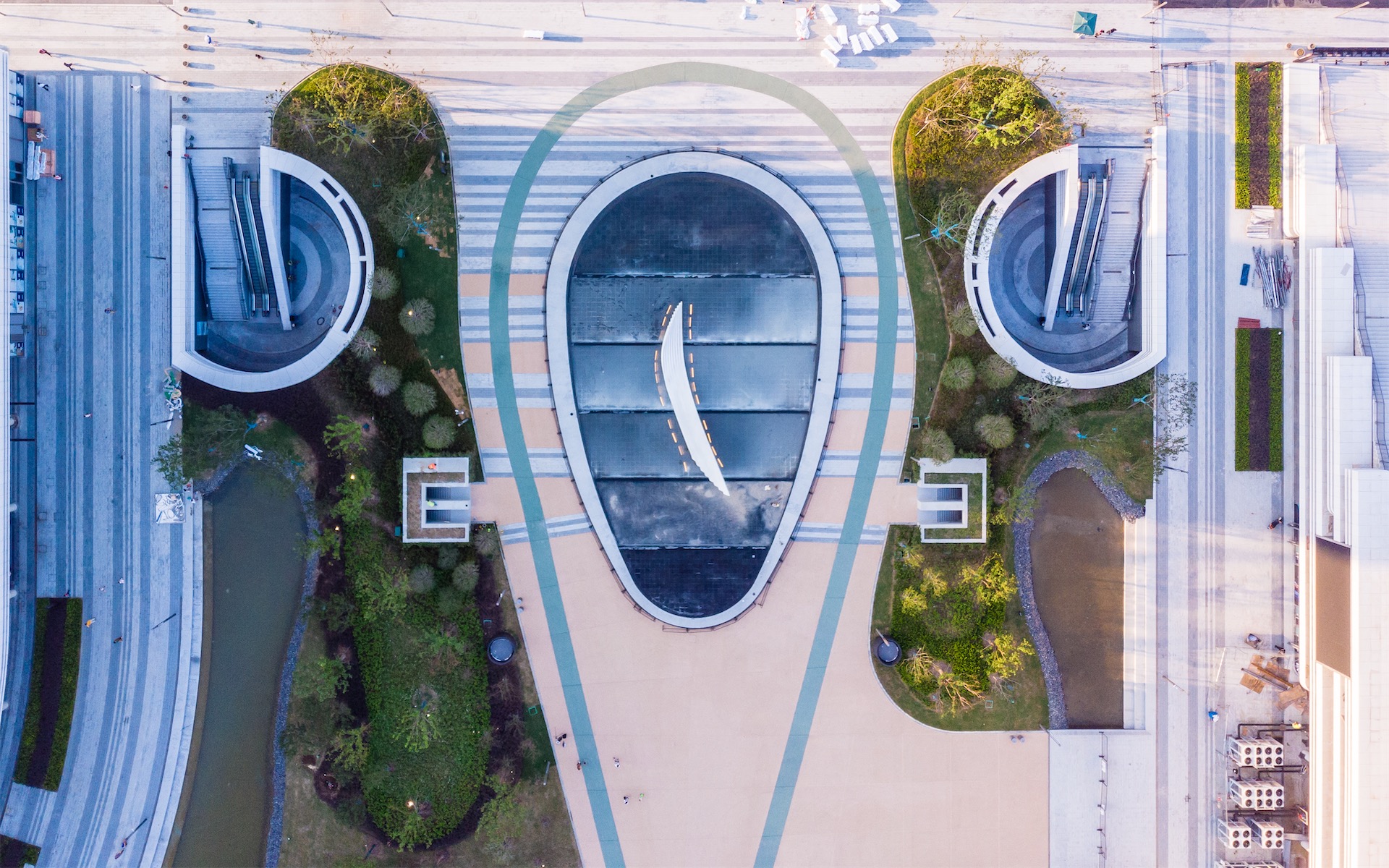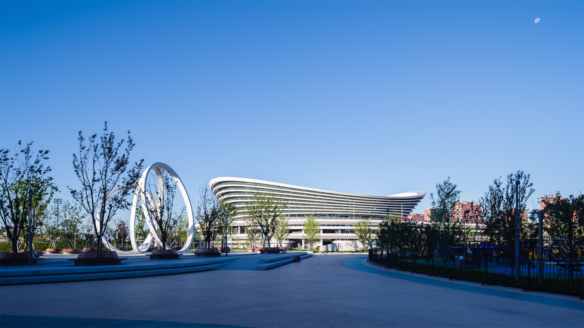 项目总体设计采取自由曲线的布局,提供丰富多样的动线,犹如徜徉在园林之间。建筑裙房如山丘升起,体育场馆犹如坐落在池水山石上的亭榭,轻盈优雅。各项体育、休闲和商业设施如水边的叠石,舒缓工巧。