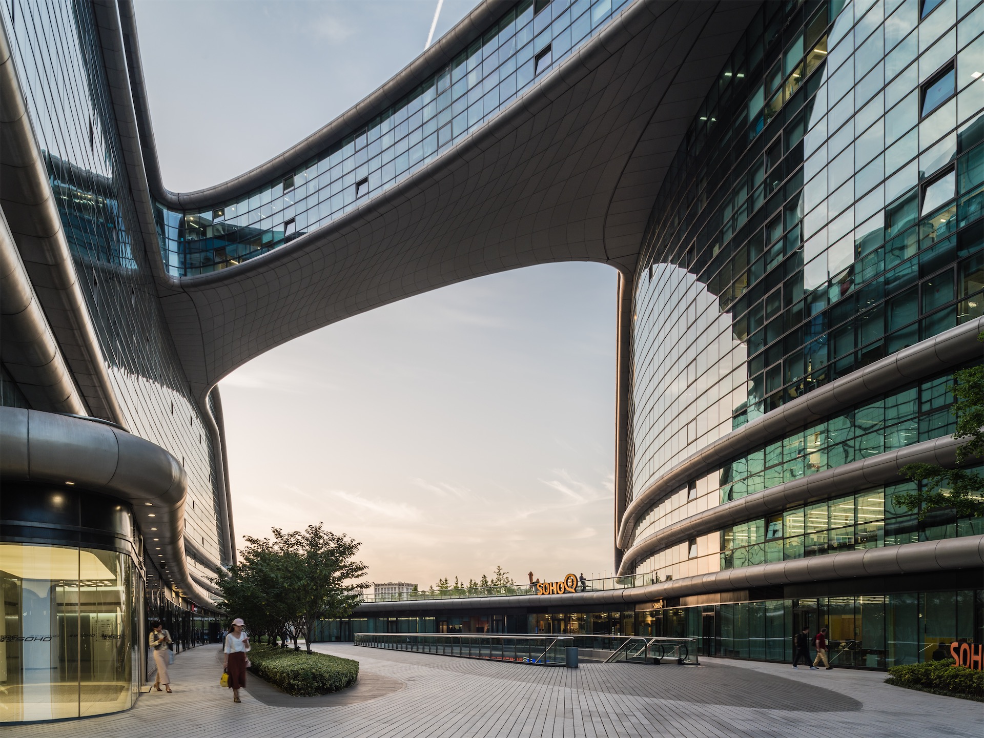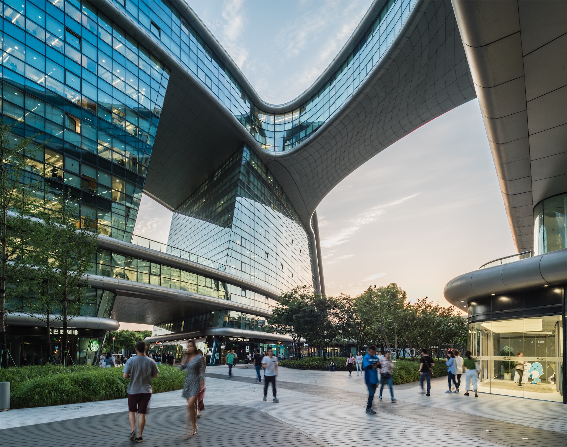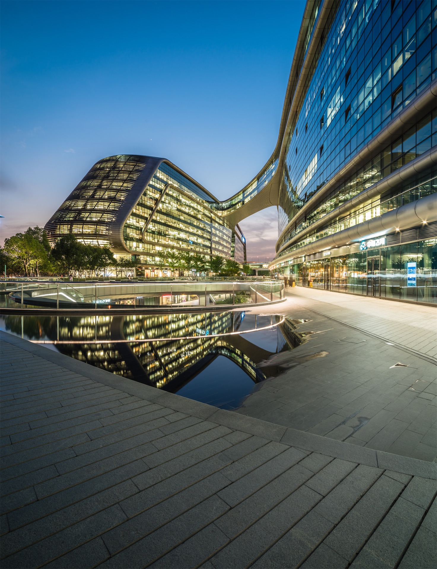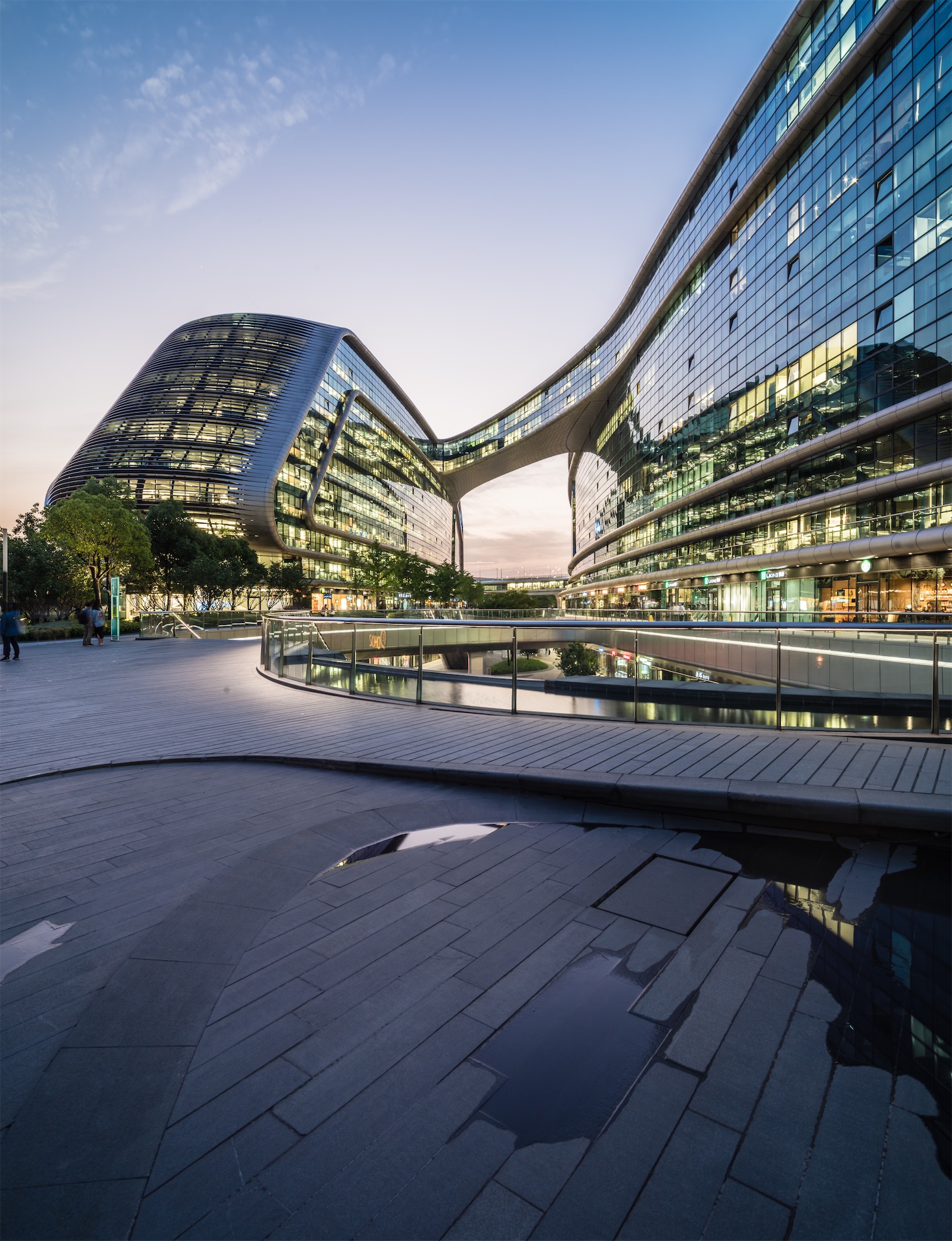设计采用了”化整为零,有机联结”的规划原理。在简洁的4条流线型建筑之间设置了6座不同标高的天桥,使所有的建筑和空间都不再孤立而是互相流通。而这些有着优美弧线的天桥,隐喻了中国传统”结”的概念,并在功能上提供了共享交流的平台。