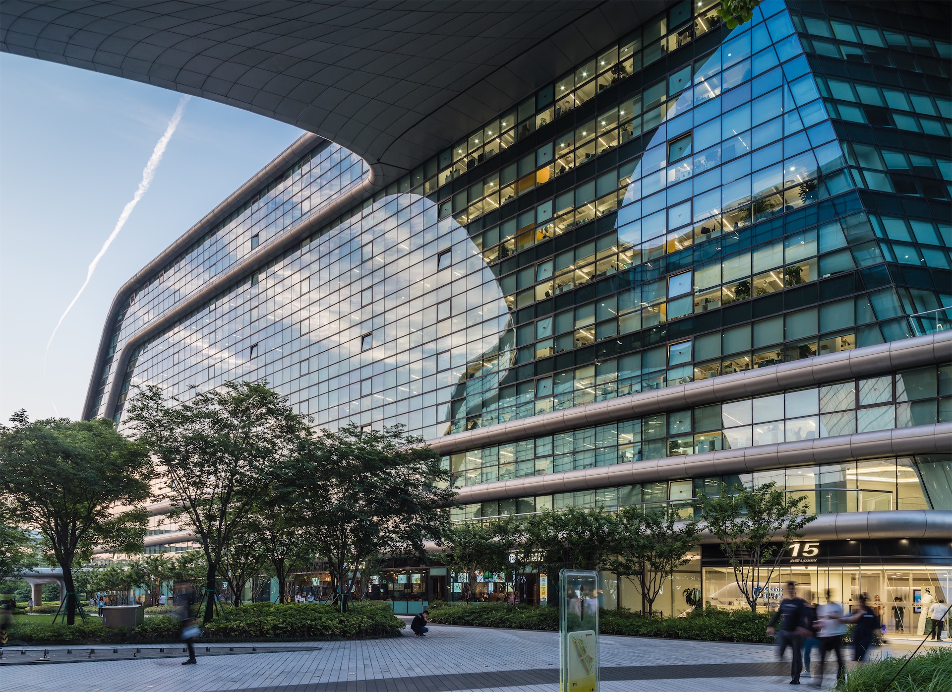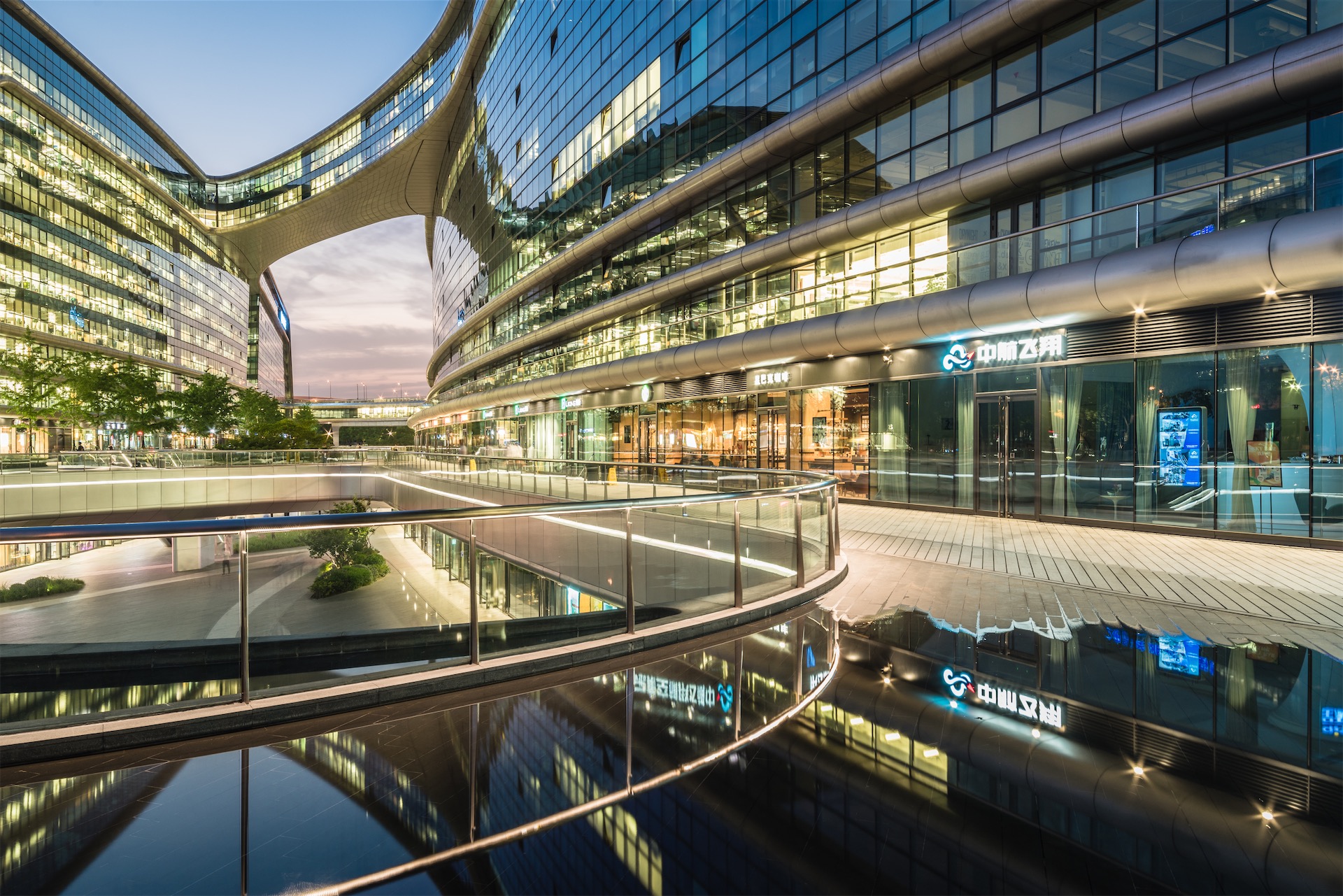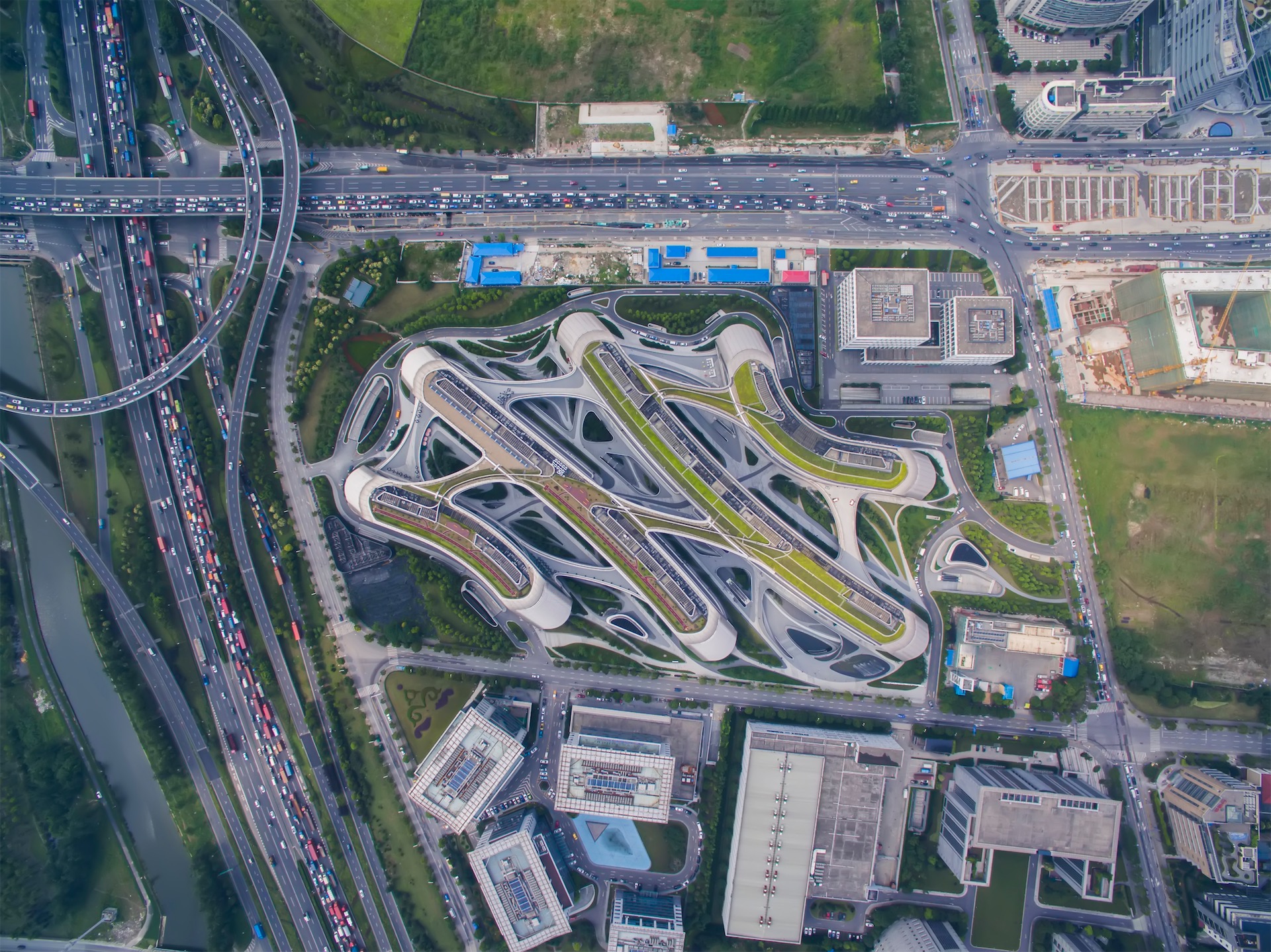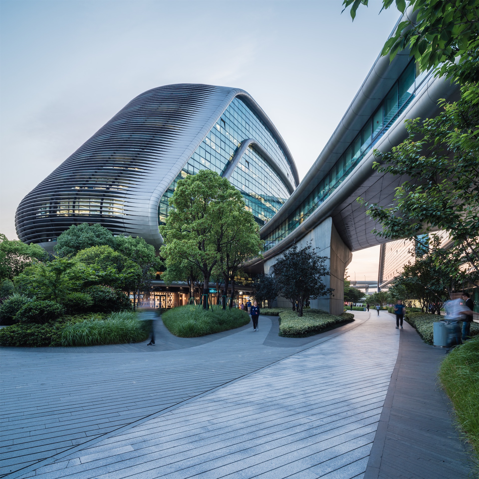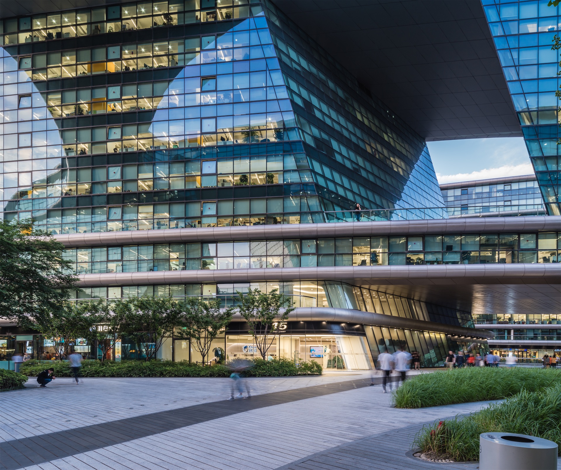 设计采用了”化整为零,有机联结”的规划原理。在简洁的4条流线型建筑之间设置了6座不同标高的天桥,使所有的建筑和空间都不再孤立而是互相流通。而这些有着优美弧线的天桥,隐喻了中国传统”结”的概念,并在功能上提供了共享交流的平台。