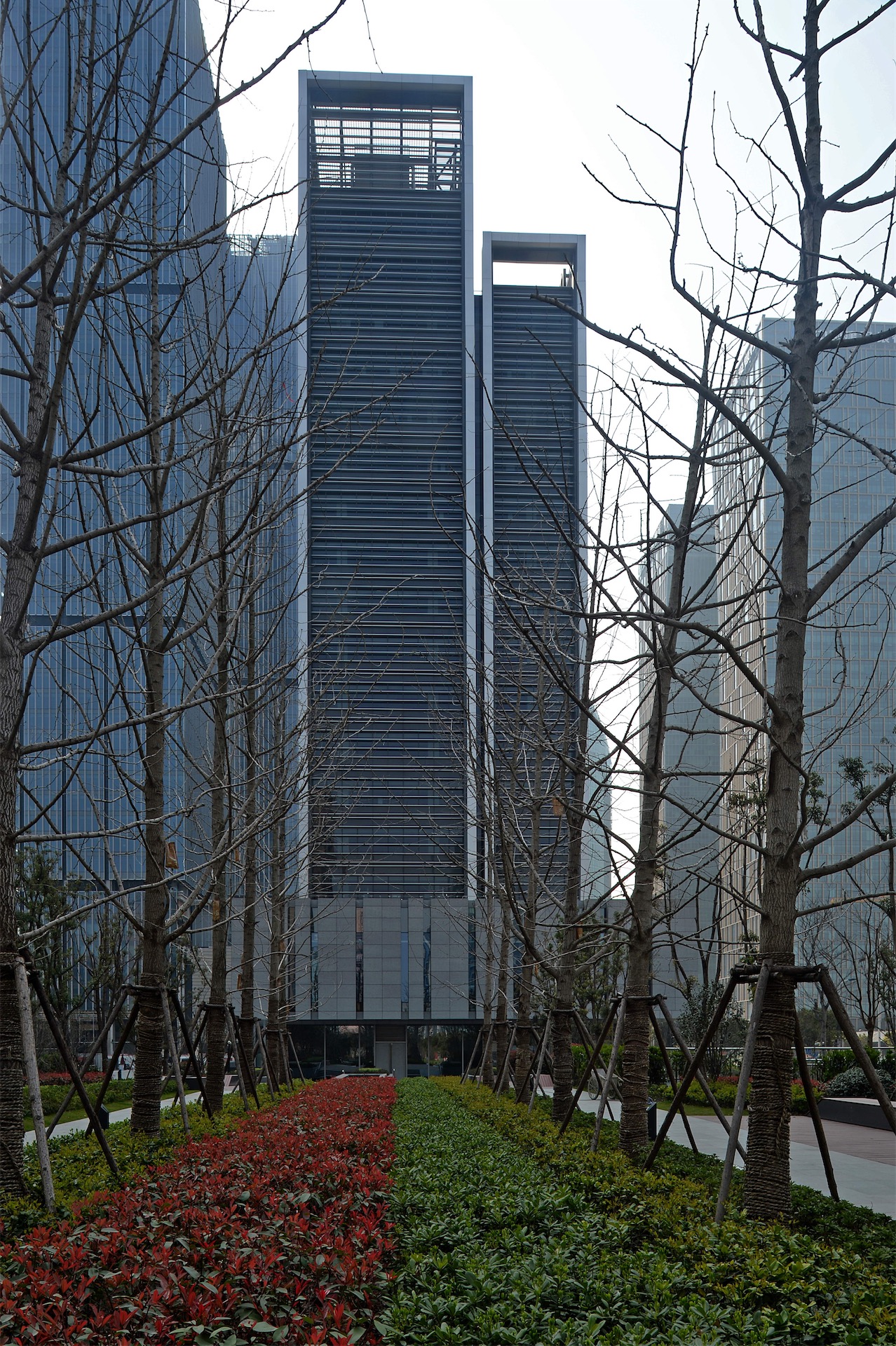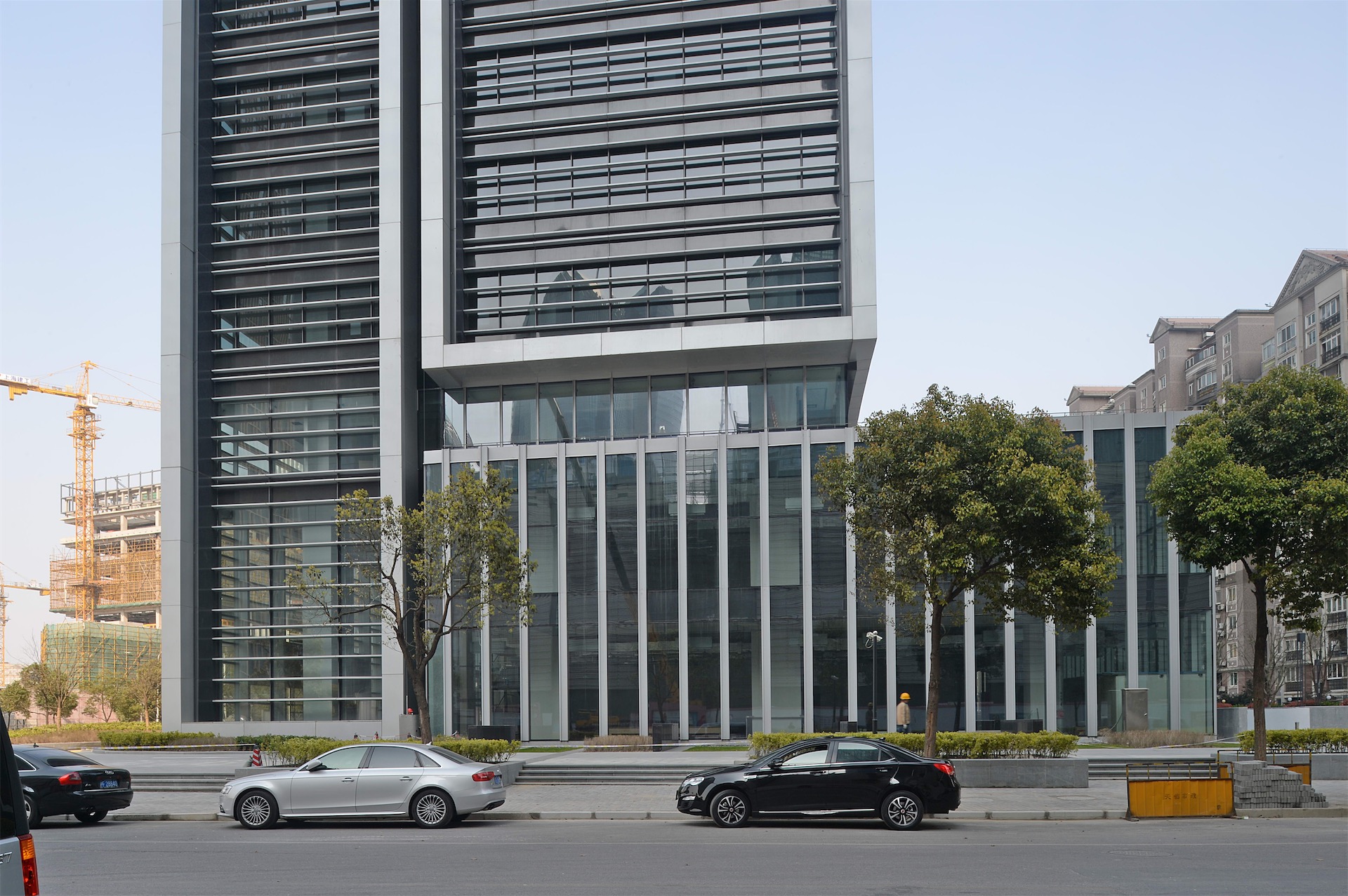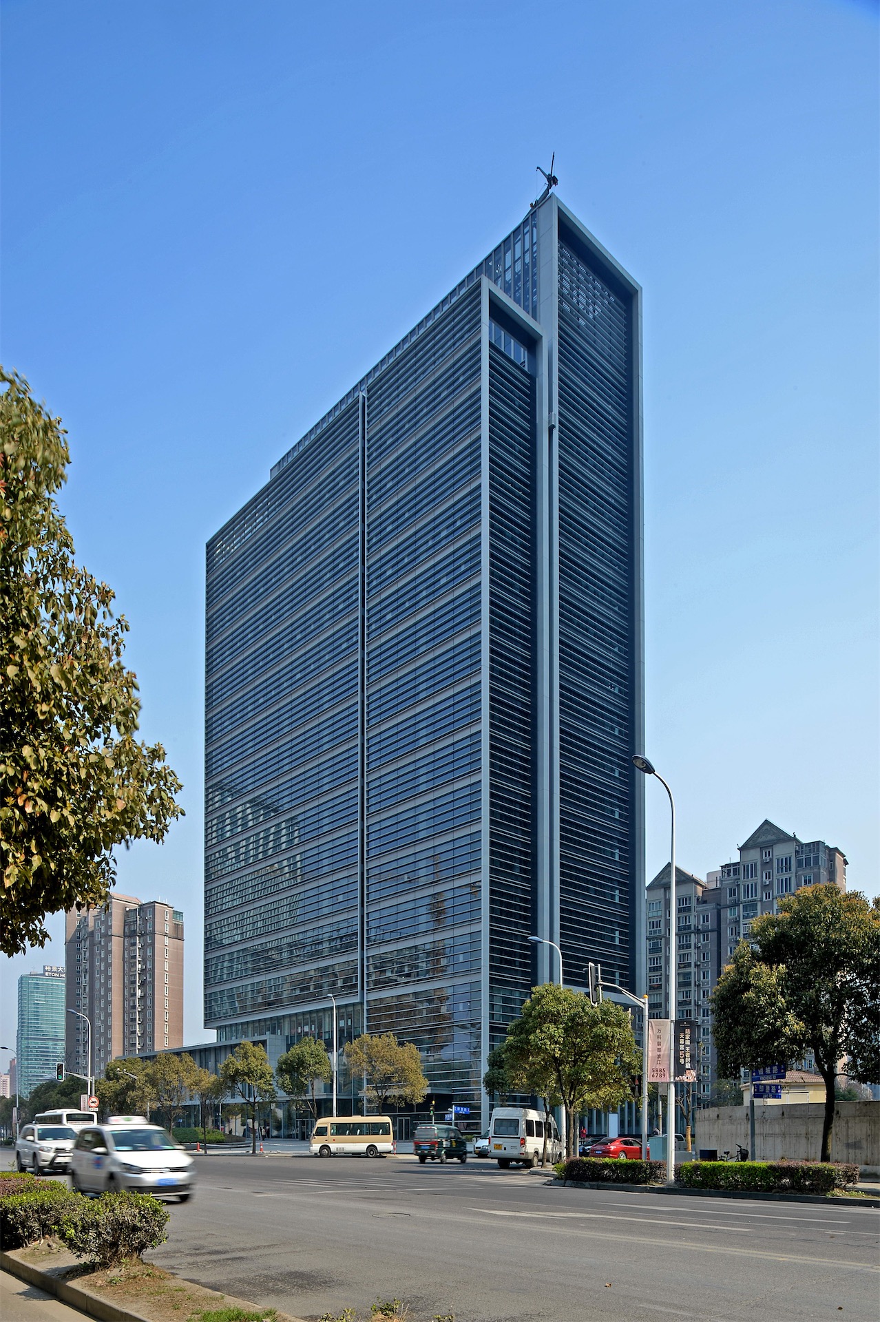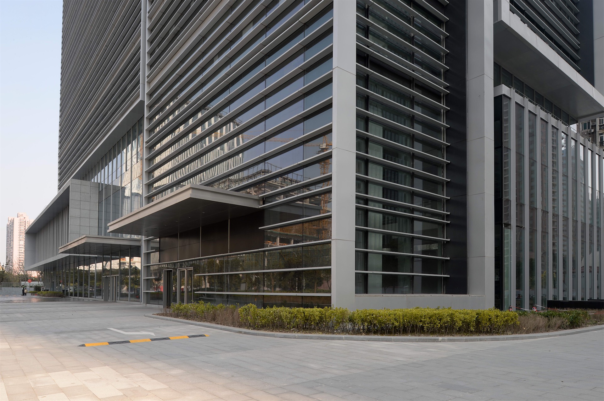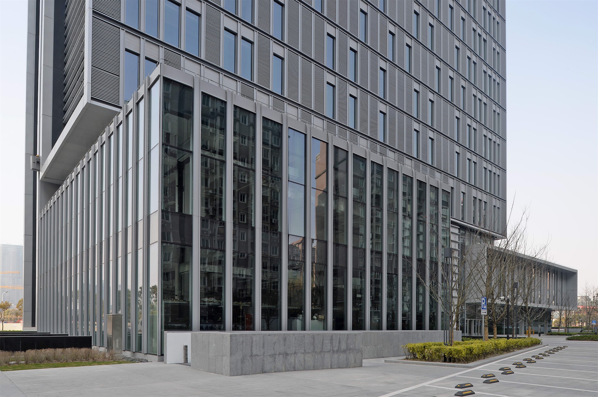 项目出于与周边建筑环境及滨江面视线的关系考虑,以及未来客户对办公空间使用的需求,采用长方形的建筑体型。立面设计简洁精致,引入了以横向线条为主的设计理念,并借助竖向金属镶框形式强调挺拔感。同时因其长方形平面,可选择偏心核心筒,并将其布置在塔楼平面南侧,进一步减少玻璃幕墙对居民区可能造成的干扰。