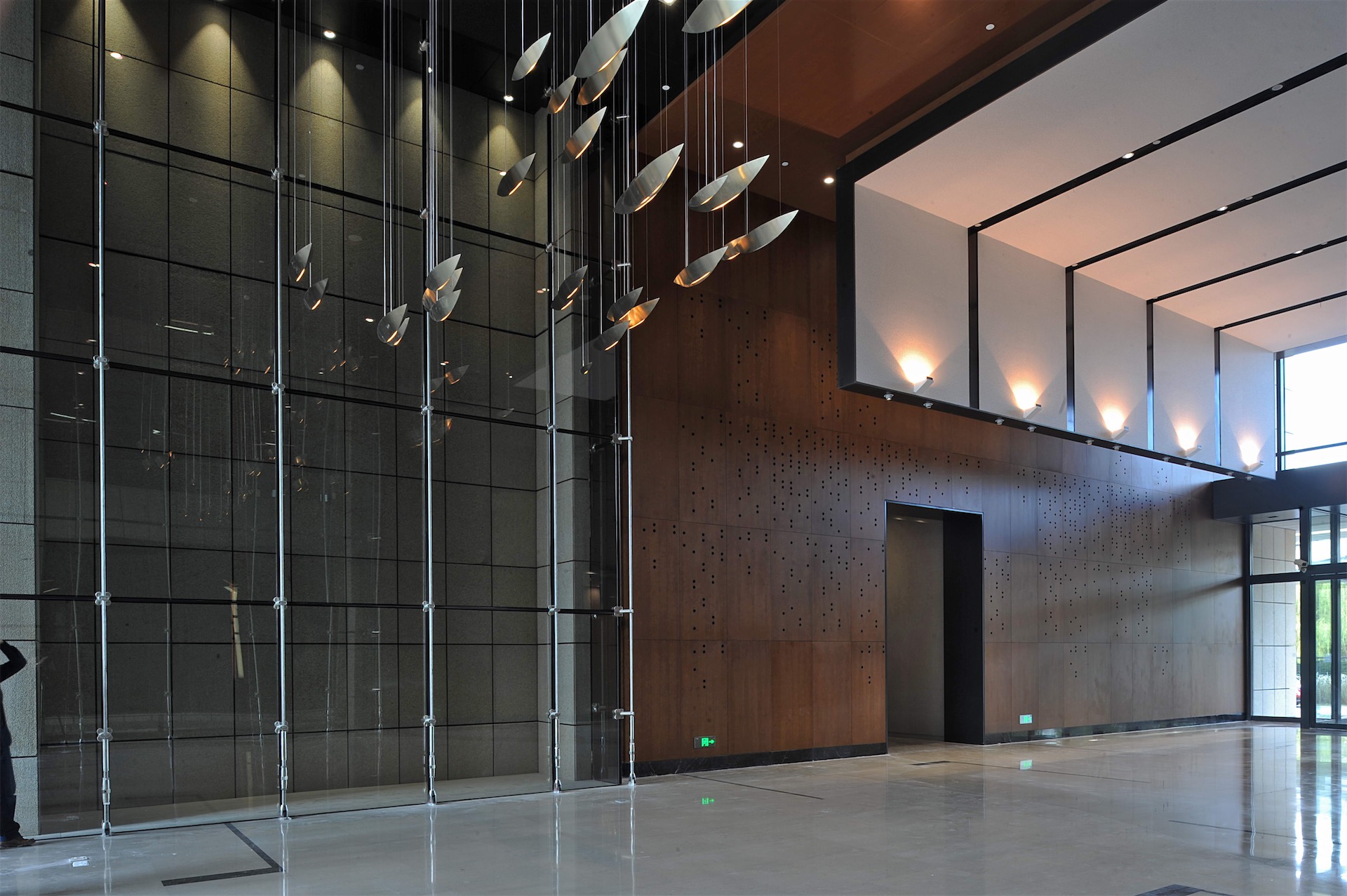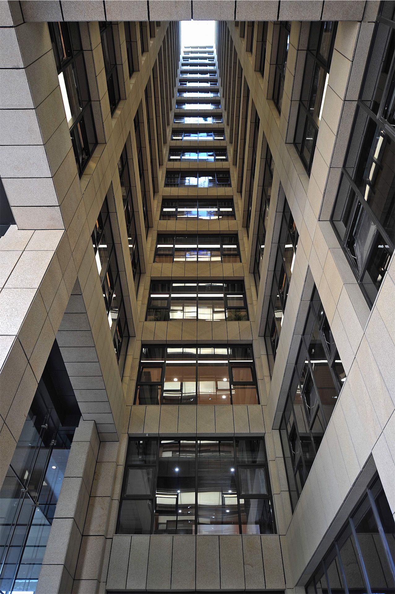 平面的凹凸,结合中庭的设计将自然采光和通风引入室内,并且中庭的设置自然的将内部空间分隔成南北向的几个条状区域,不同的条状空间南侧对应不同的幕墙形式。强调了空间的层次感。