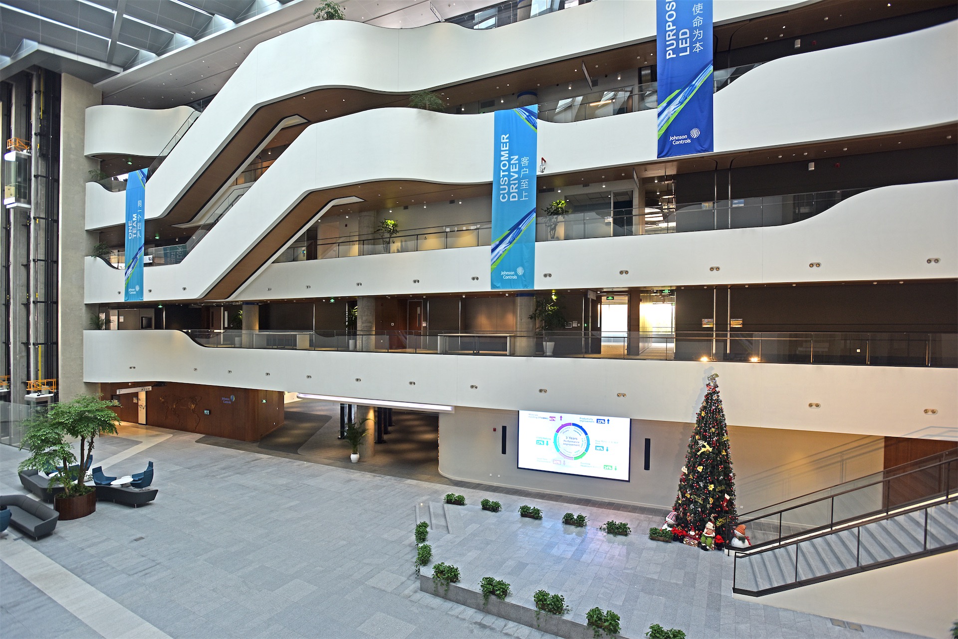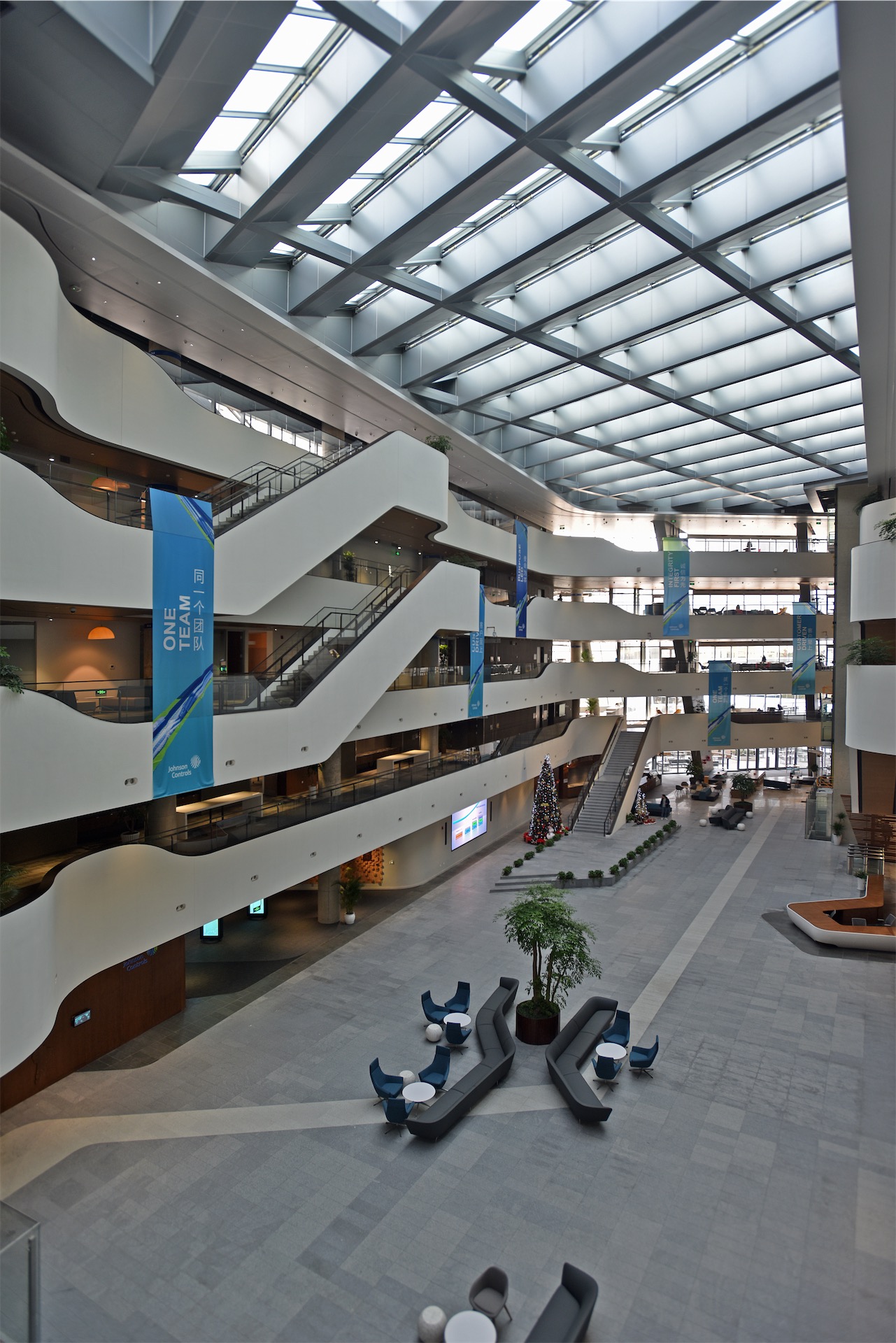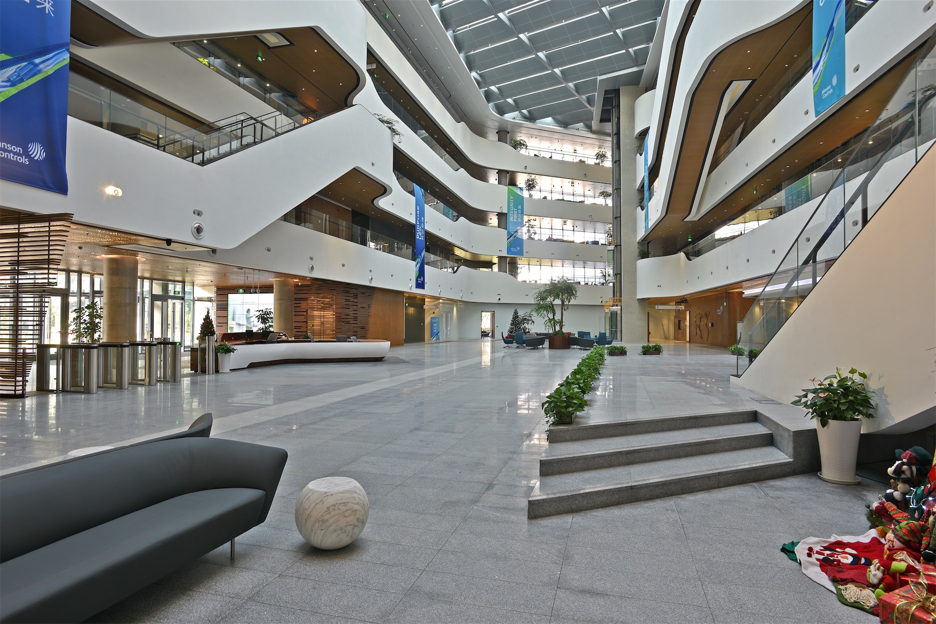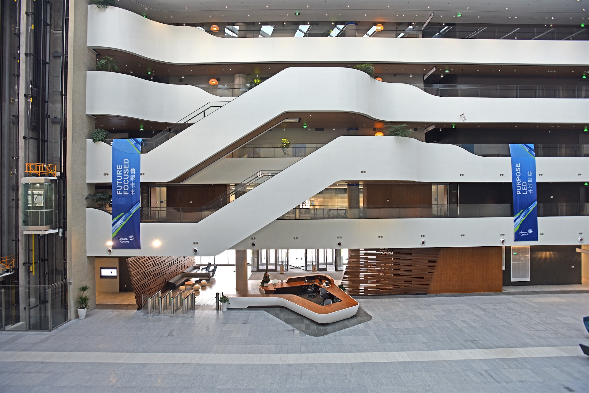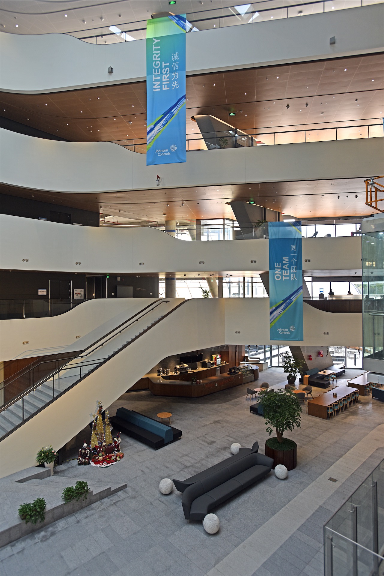 设计从最大限度的将自然景观引入建筑出发,同时确保江森自控的私密性和运营性不受影响。大楼设计为2栋狭窄的连续翼楼,中间为大型中庭。两座翼楼弯曲,最大限度地增加南北曝光面,使大楼产生一种双臂环拥的感觉,拥抱中心处社区枢纽中庭。