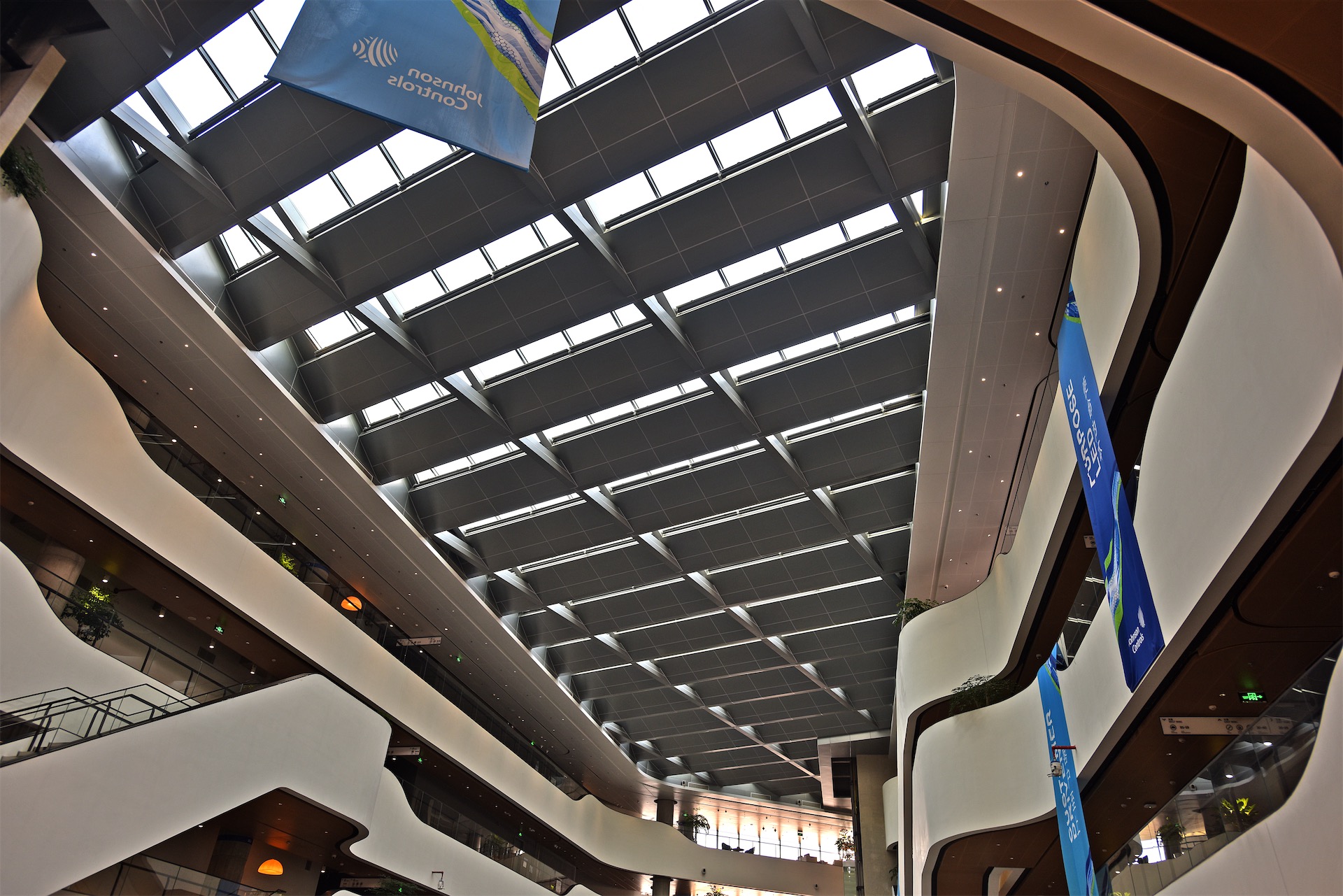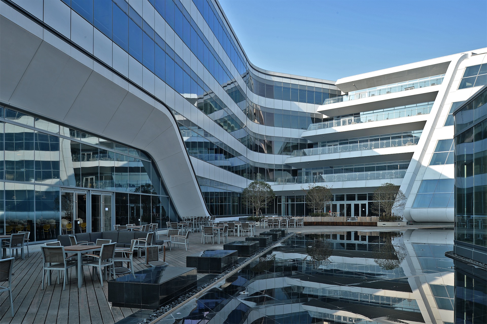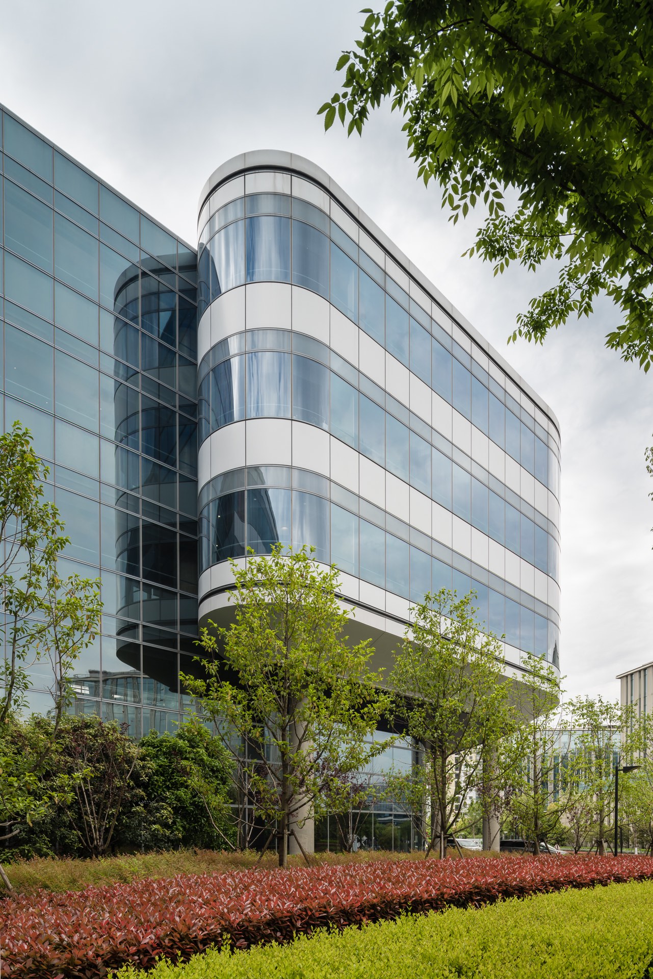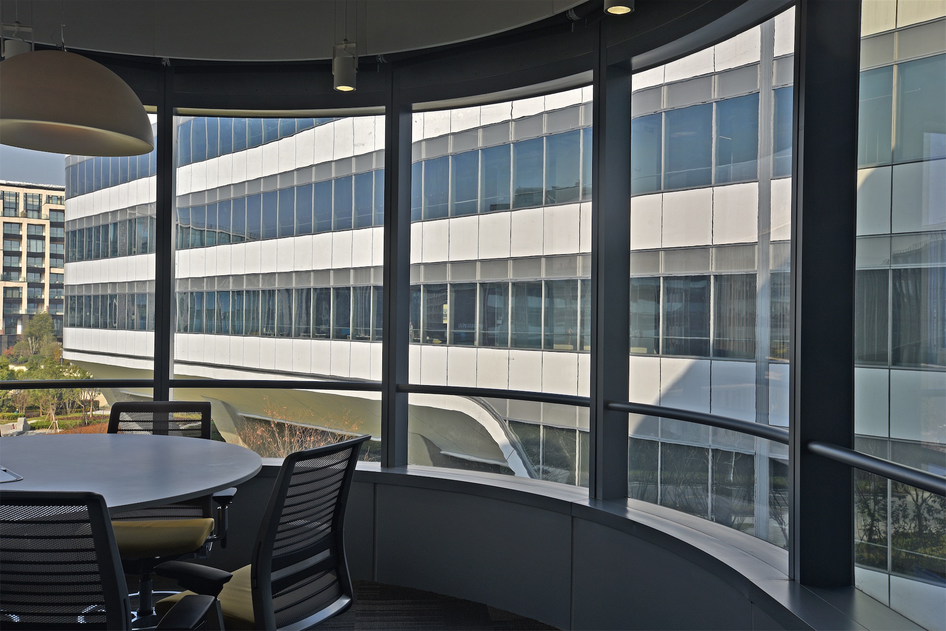 设计从最大限度的将自然景观引入建筑出发,同时确保江森自控的私密性和运营性不受影响。大楼设计为2栋狭窄的连续翼楼,中间为大型中庭。两座翼楼弯曲,最大限度地增加南北曝光面,使大楼产生一种双臂环拥的感觉,拥抱中心处社区枢纽中庭。
