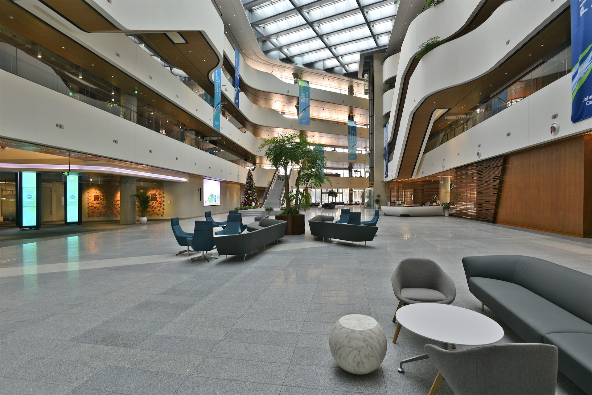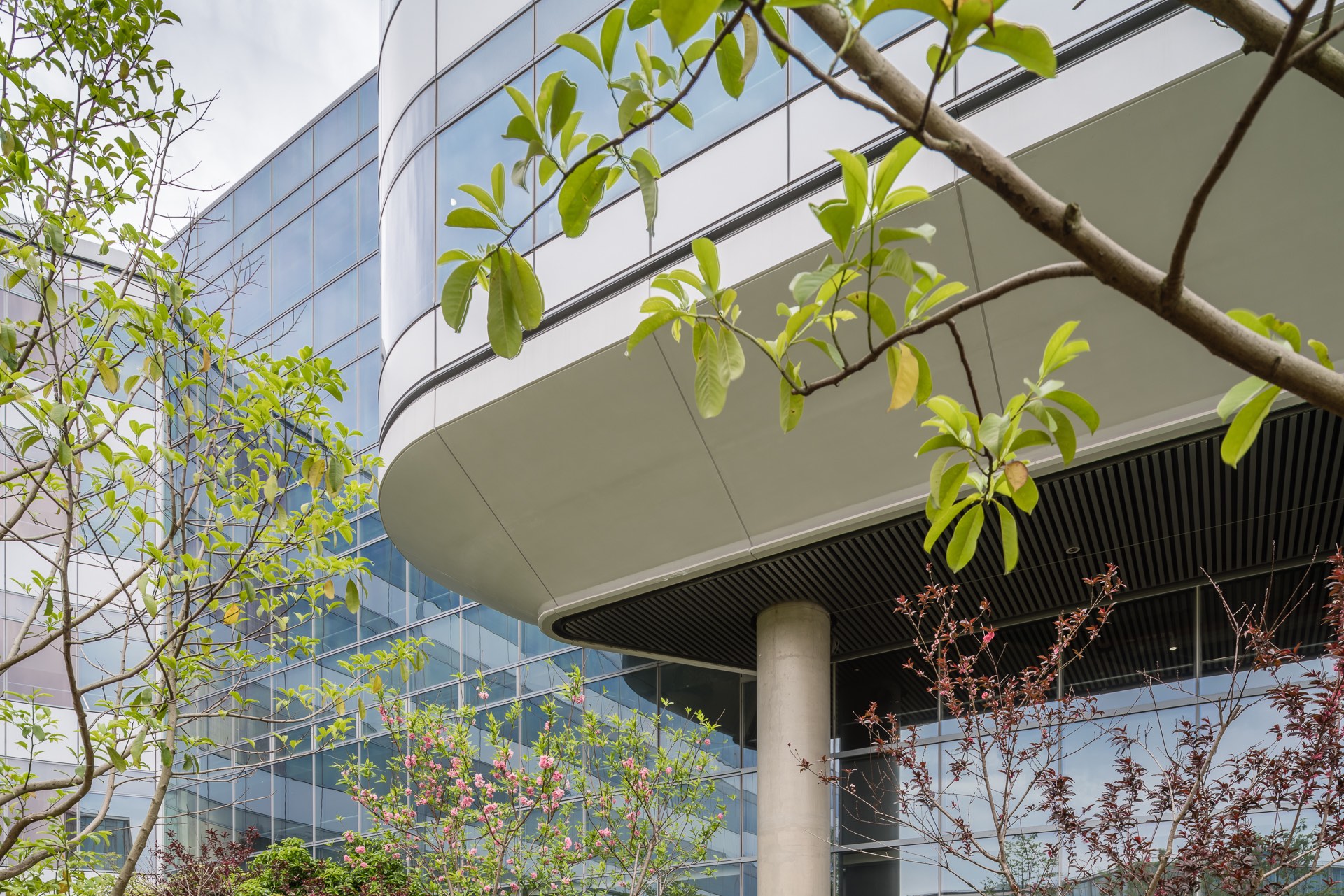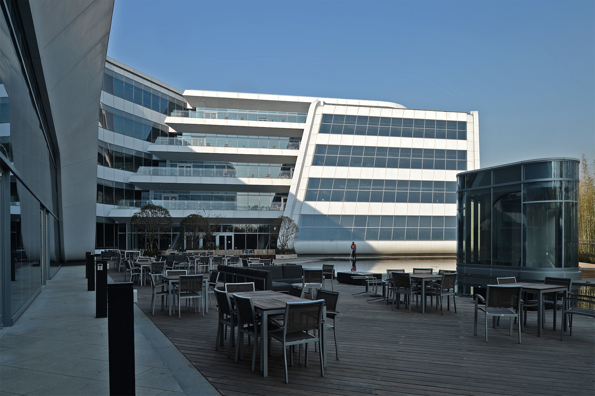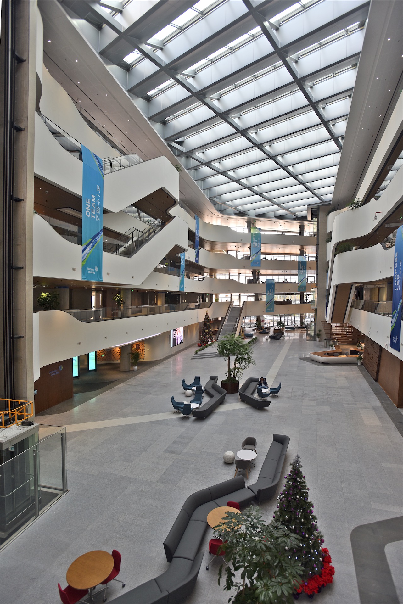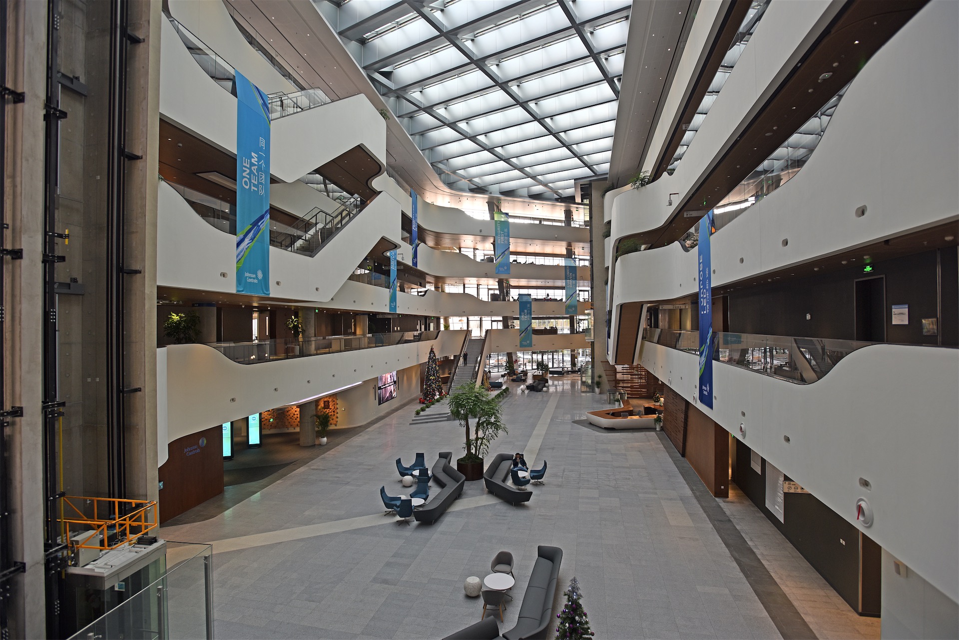 设计从最大限度的将自然景观引入建筑出发,同时确保江森自控的私密性和运营性不受影响。大楼设计为2栋狭窄的连续翼楼,中间为大型中庭。两座翼楼弯曲,最大限度地增加南北曝光面,使大楼产生一种双臂环拥的感觉,拥抱中心处社区枢纽中庭。