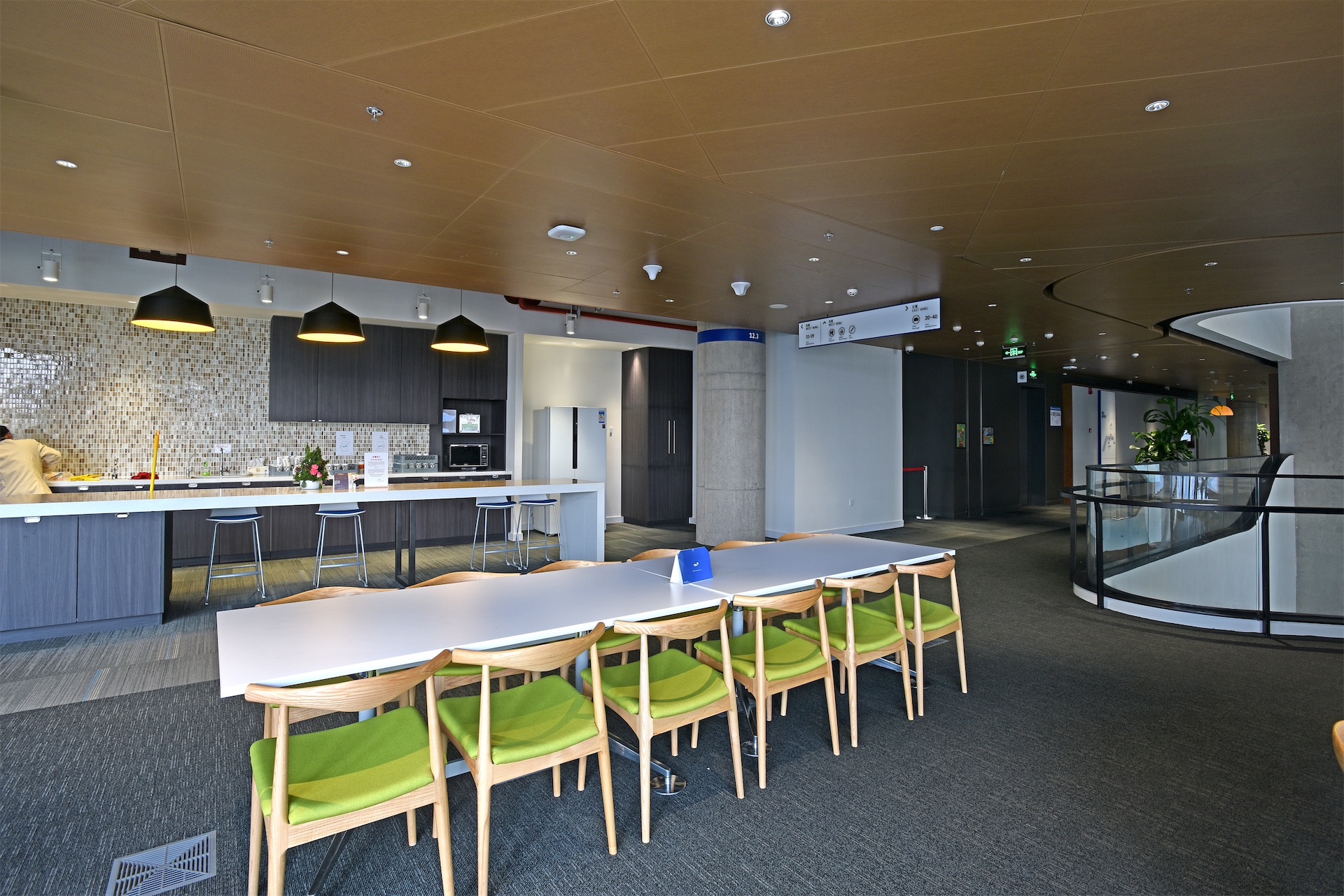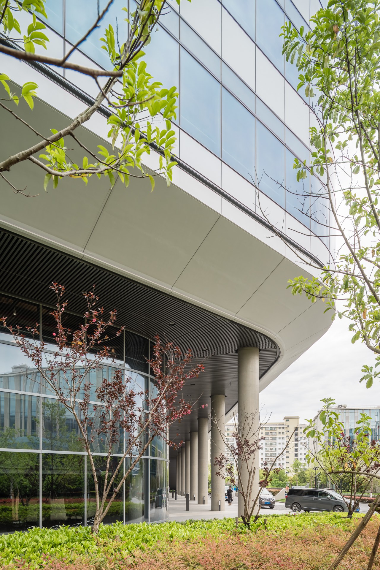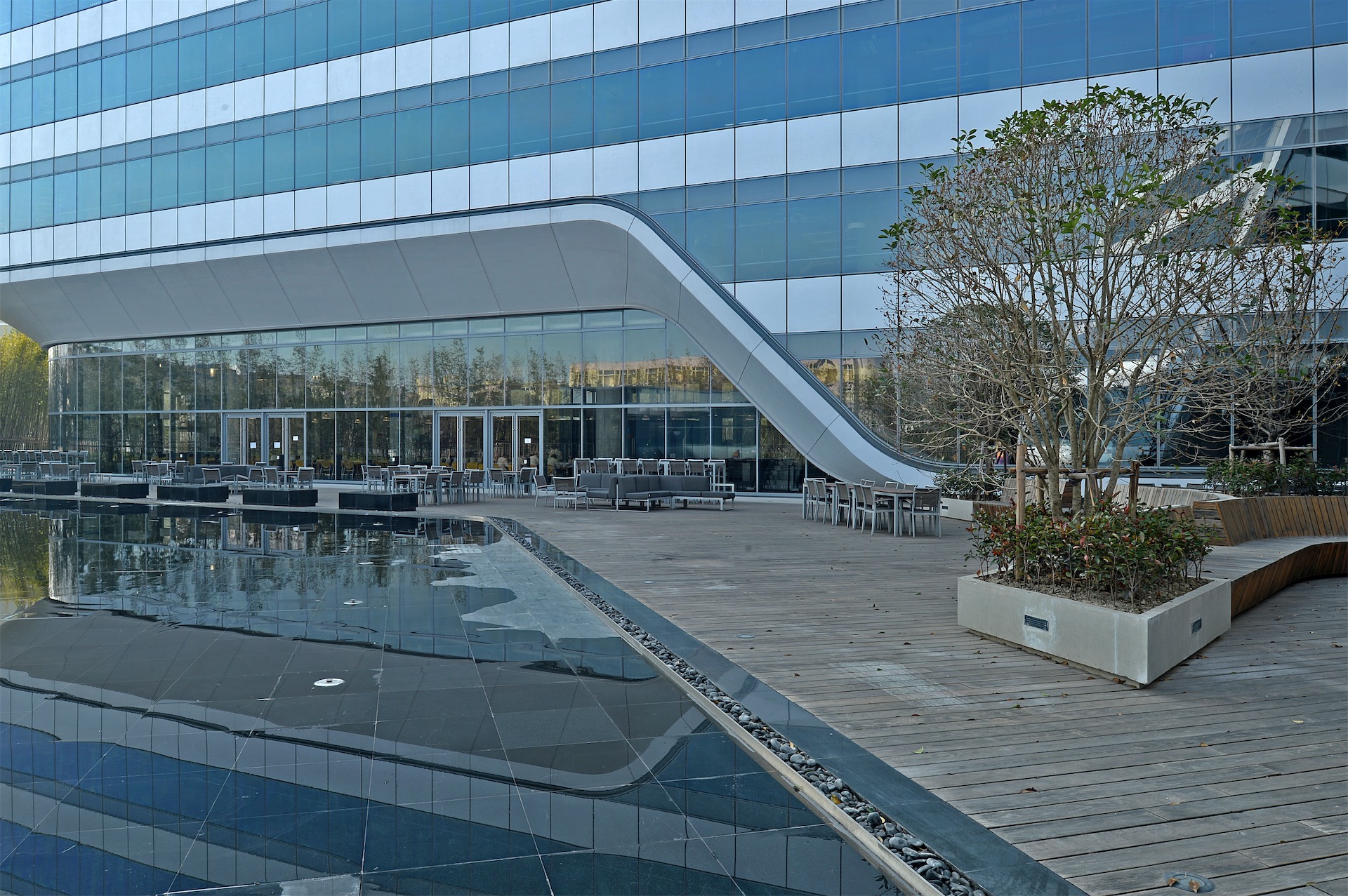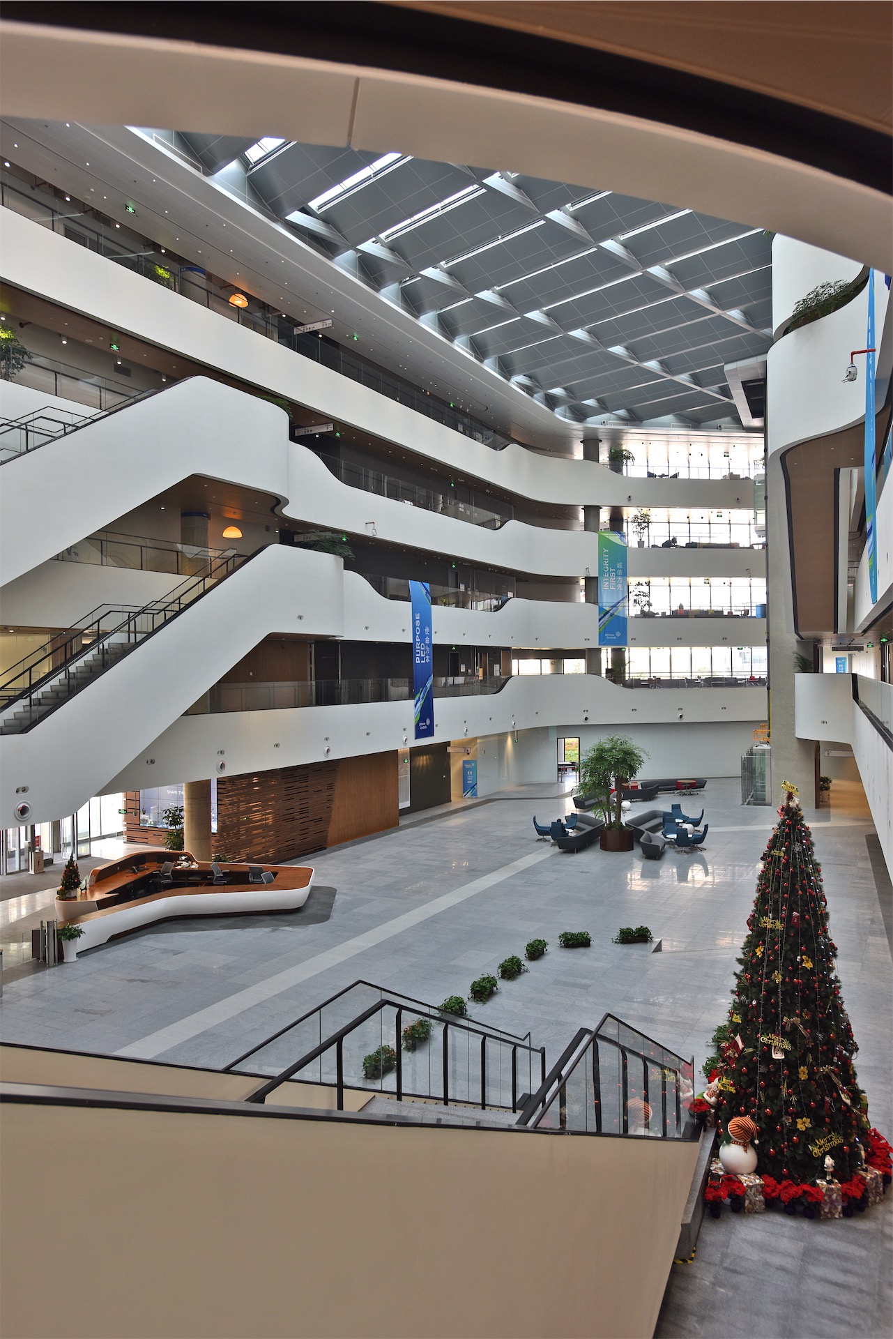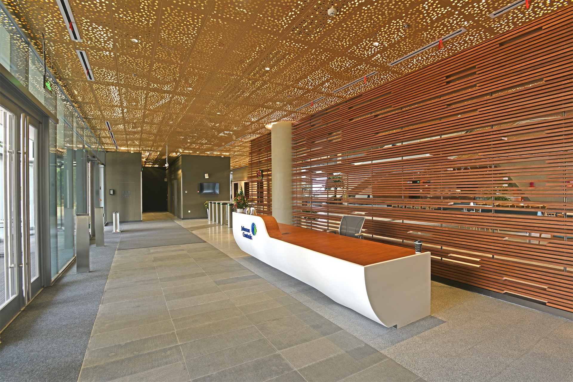 设计从最大限度的将自然景观引入建筑出发,同时确保江森自控的私密性和运营性不受影响。大楼设计为2栋狭窄的连续翼楼,中间为大型中庭。两座翼楼弯曲,最大限度地增加南北曝光面,使大楼产生一种双臂环拥的感觉,拥抱中心处社区枢纽中庭。