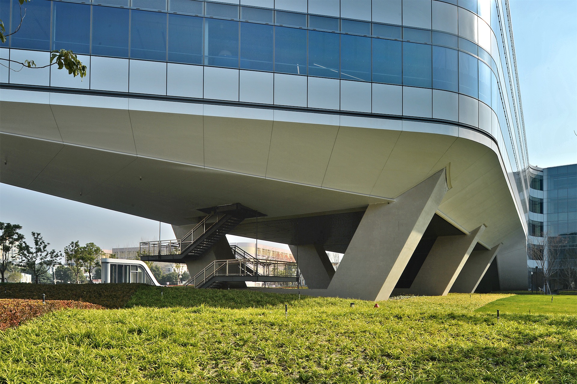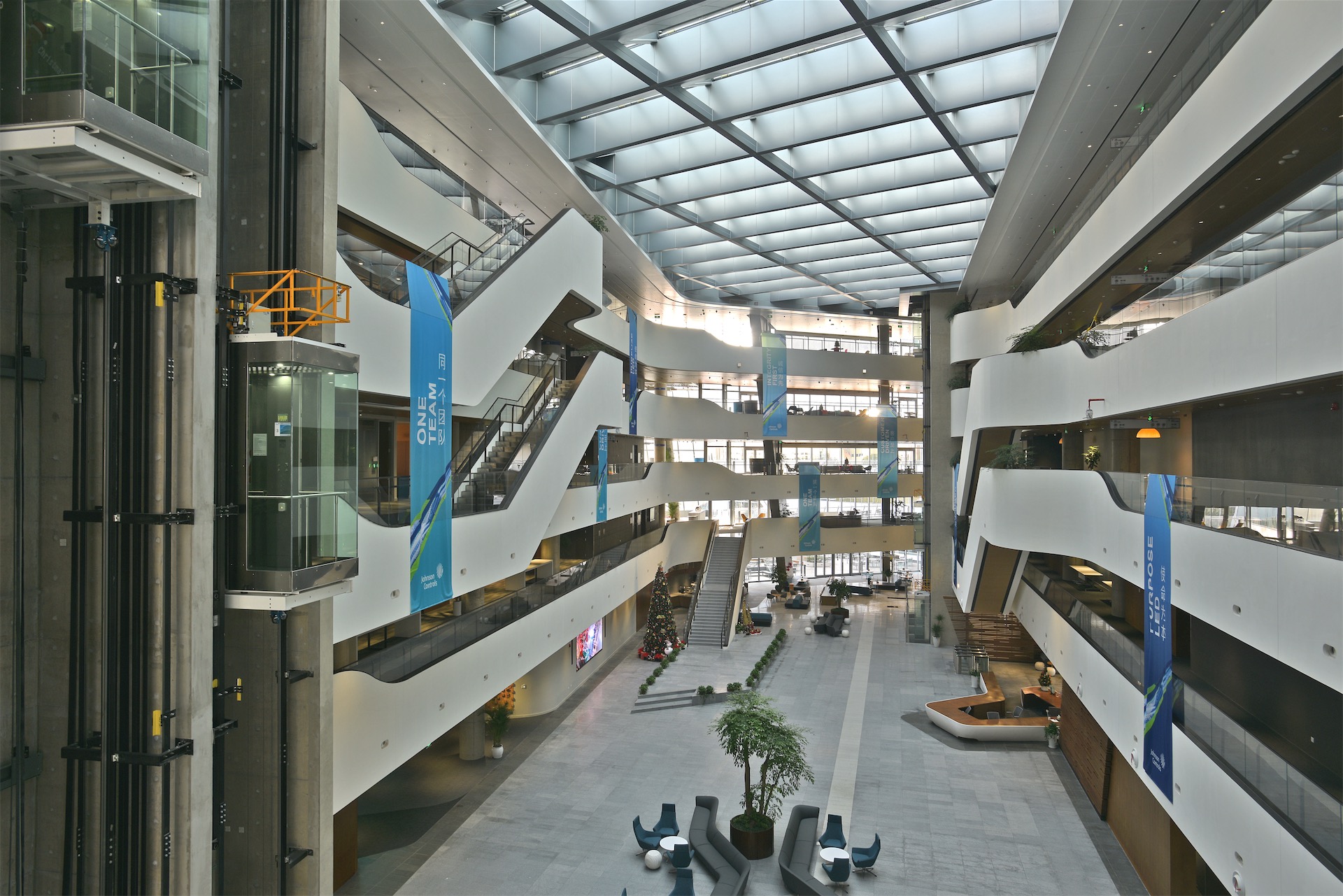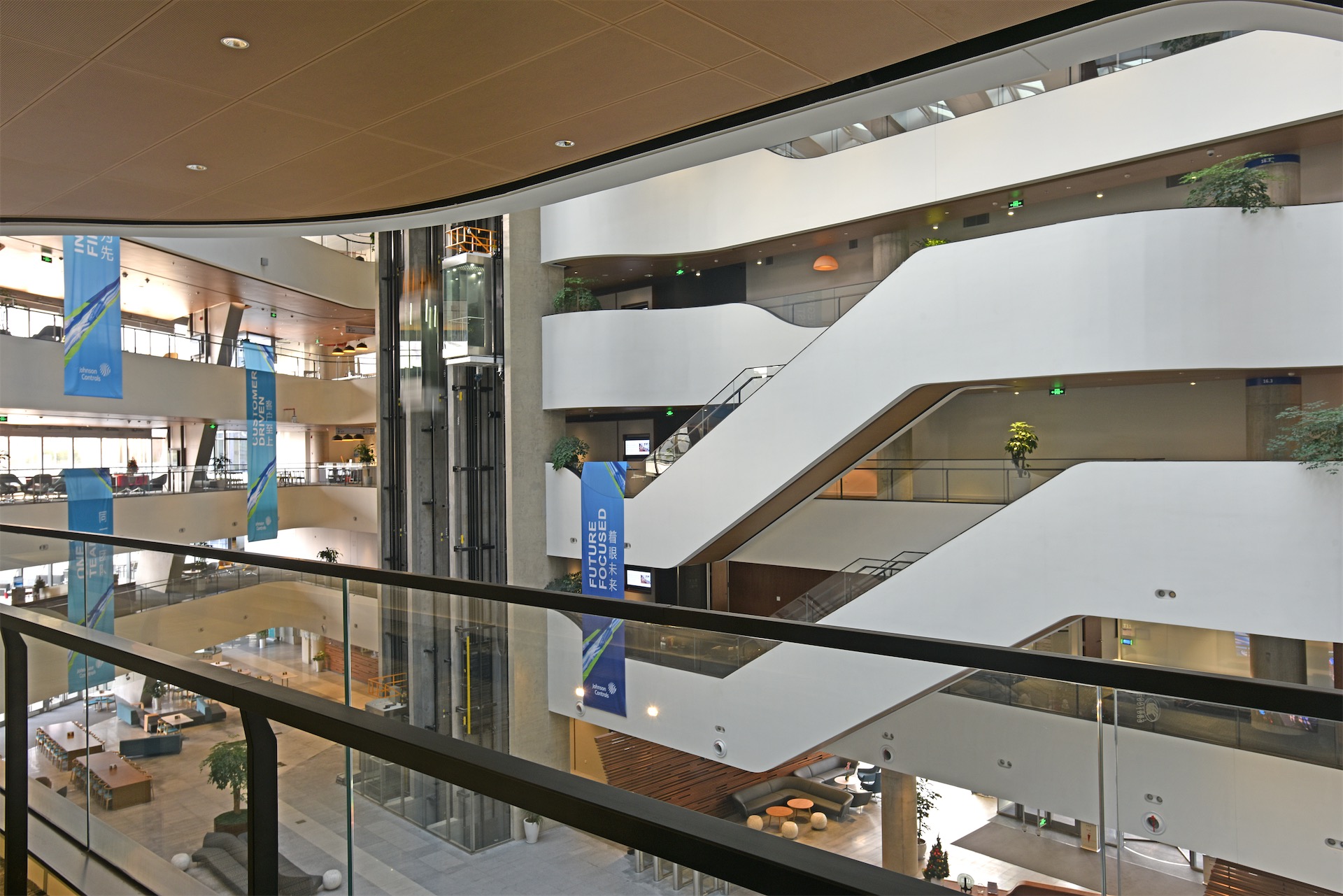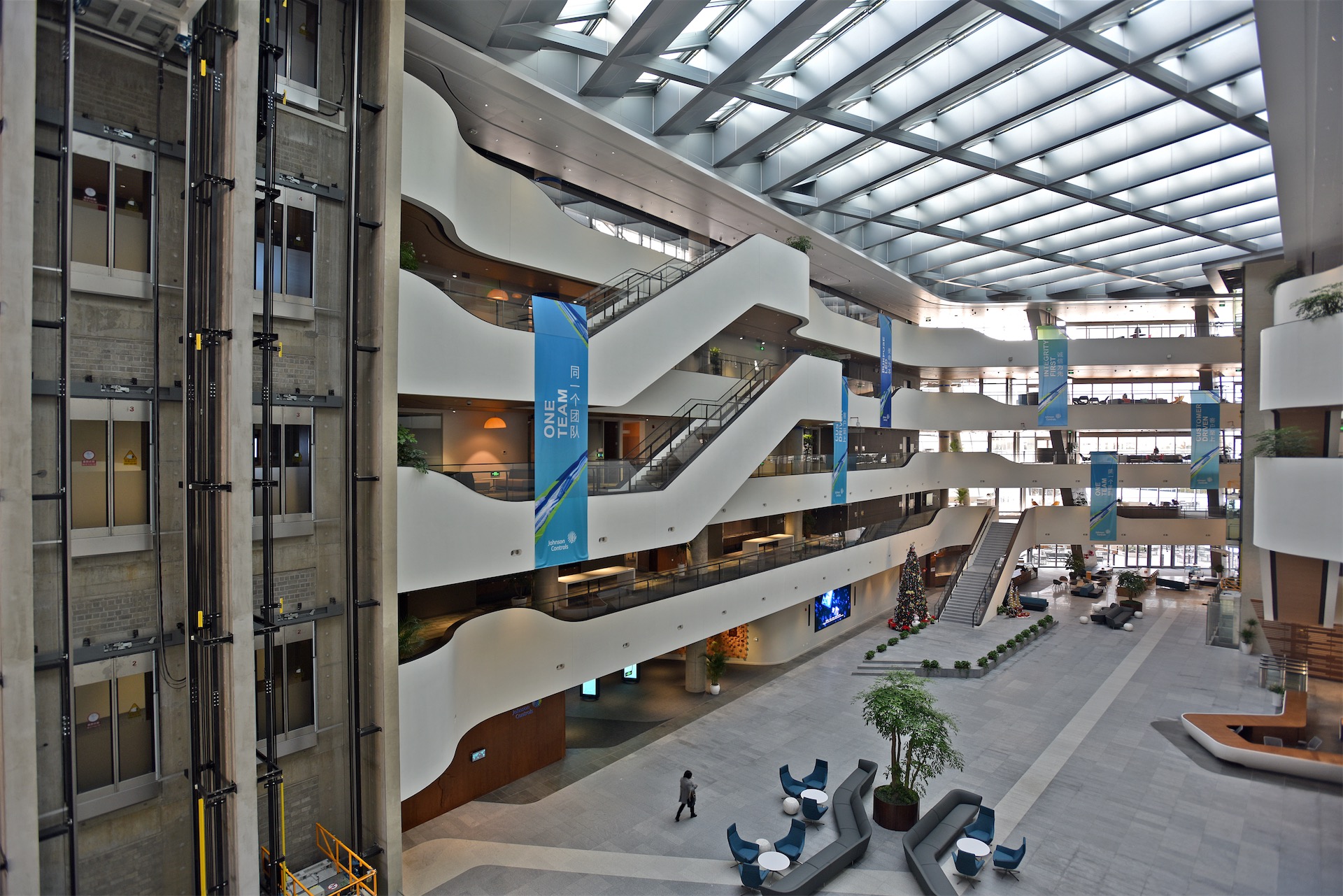 设计从最大限度的将自然景观引入建筑出发,同时确保江森自控的私密性和运营性不受影响。大楼设计为2栋狭窄的连续翼楼,中间为大型中庭。两座翼楼弯曲,最大限度地增加南北曝光面,使大楼产生一种双臂环拥的感觉,拥抱中心处社区枢纽中庭。