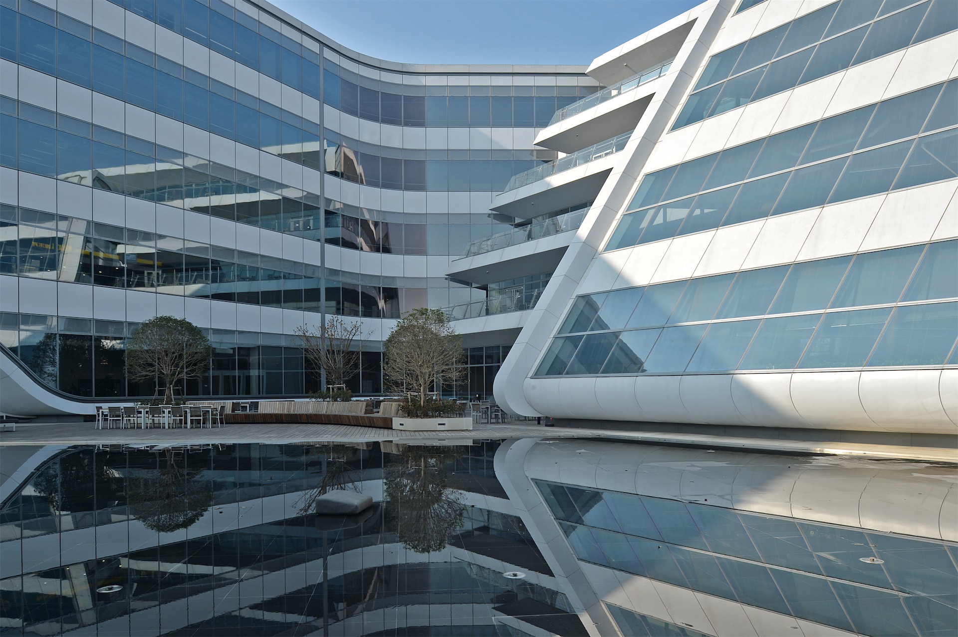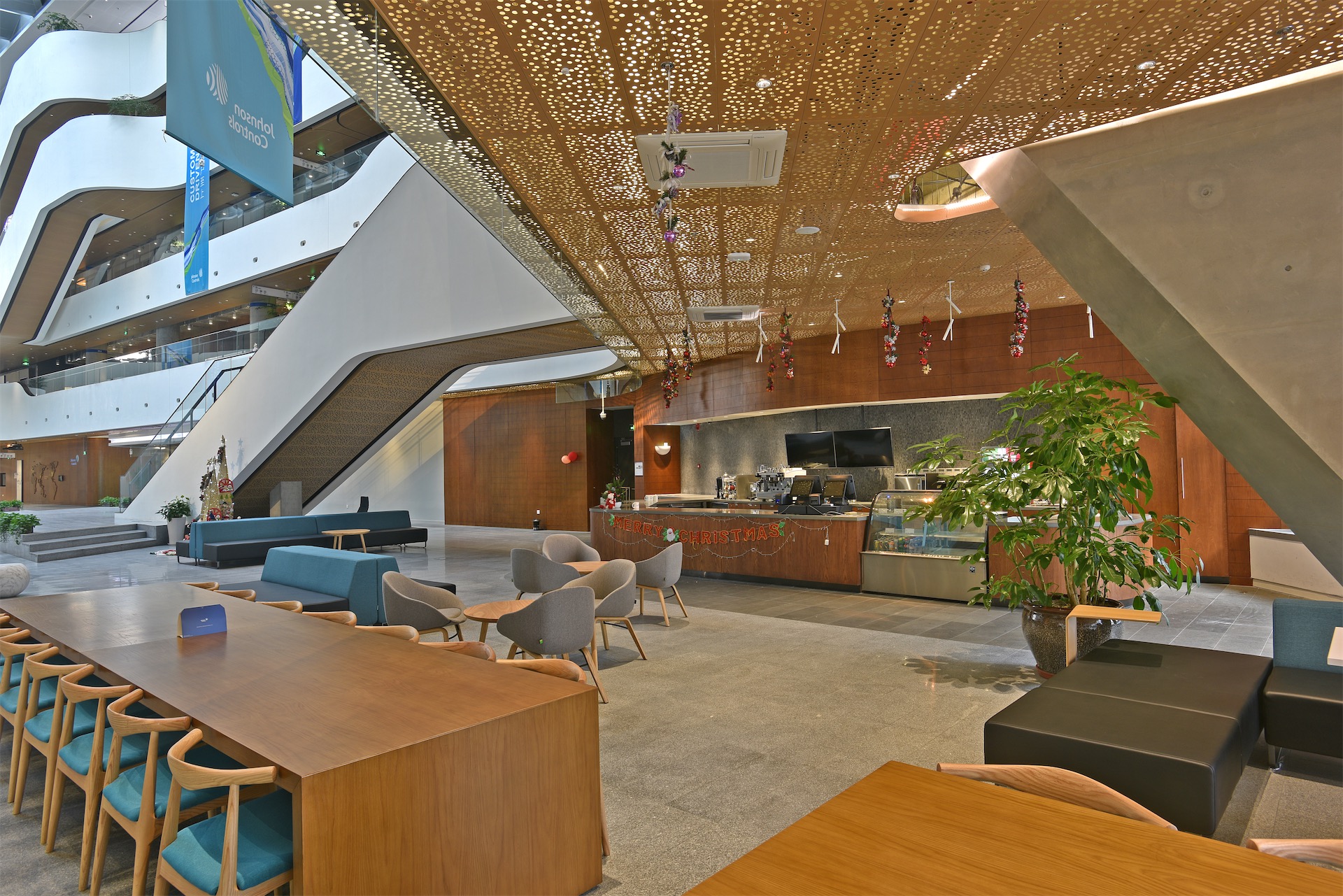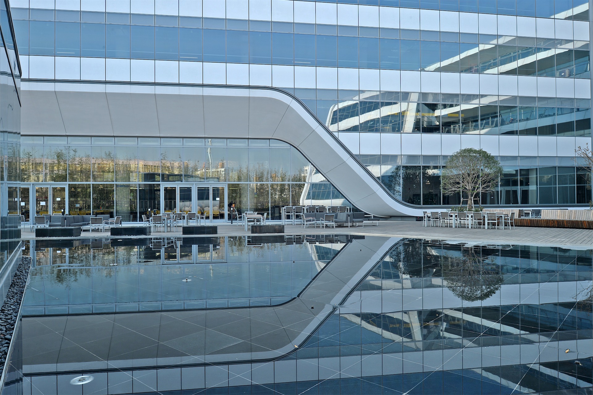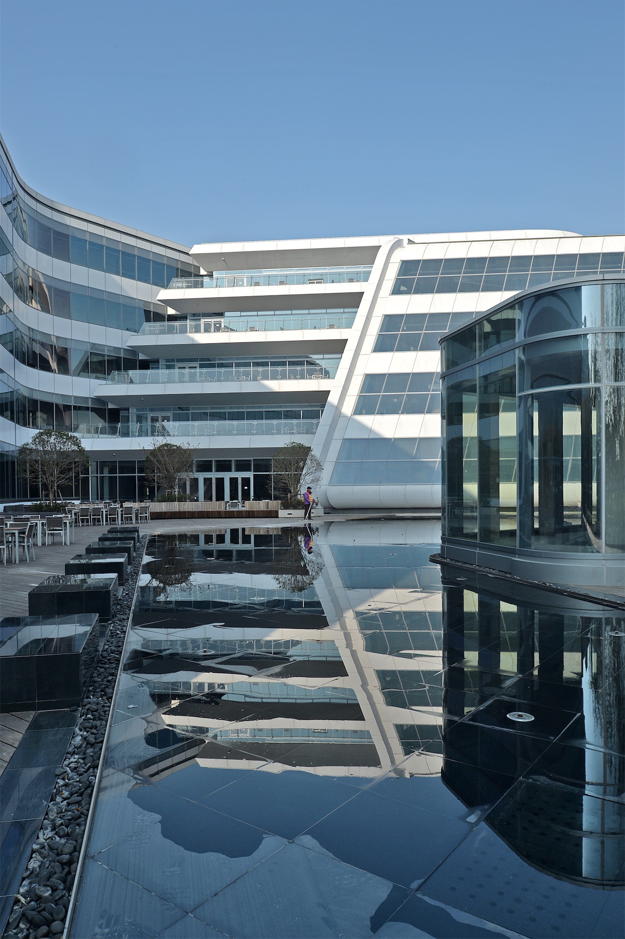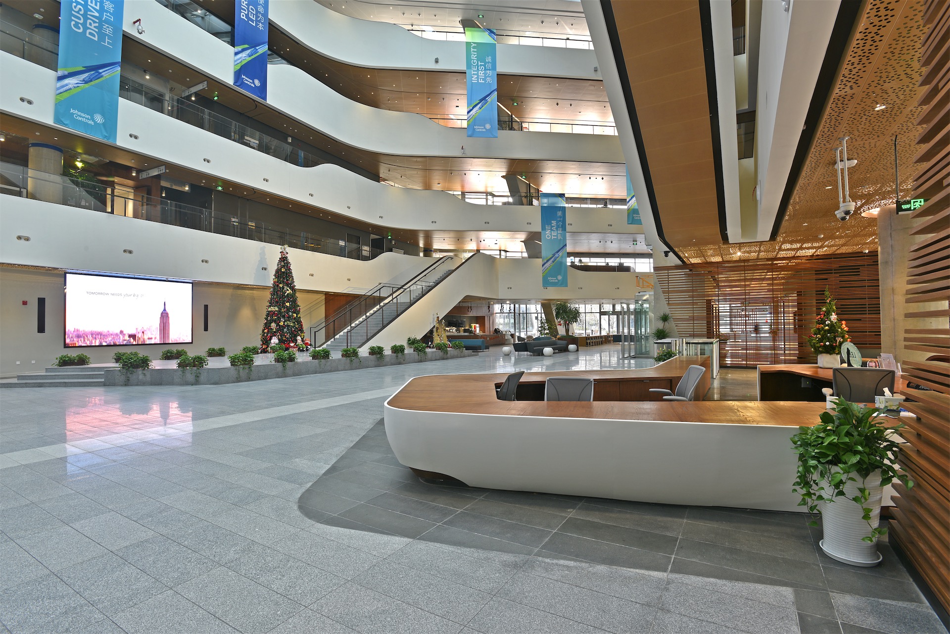 设计从最大限度的将自然景观引入建筑出发,同时确保江森自控的私密性和运营性不受影响。大楼设计为2栋狭窄的连续翼楼,中间为大型中庭。两座翼楼弯曲,最大限度地增加南北曝光面,使大楼产生一种双臂环拥的感觉,拥抱中心处社区枢纽中庭。