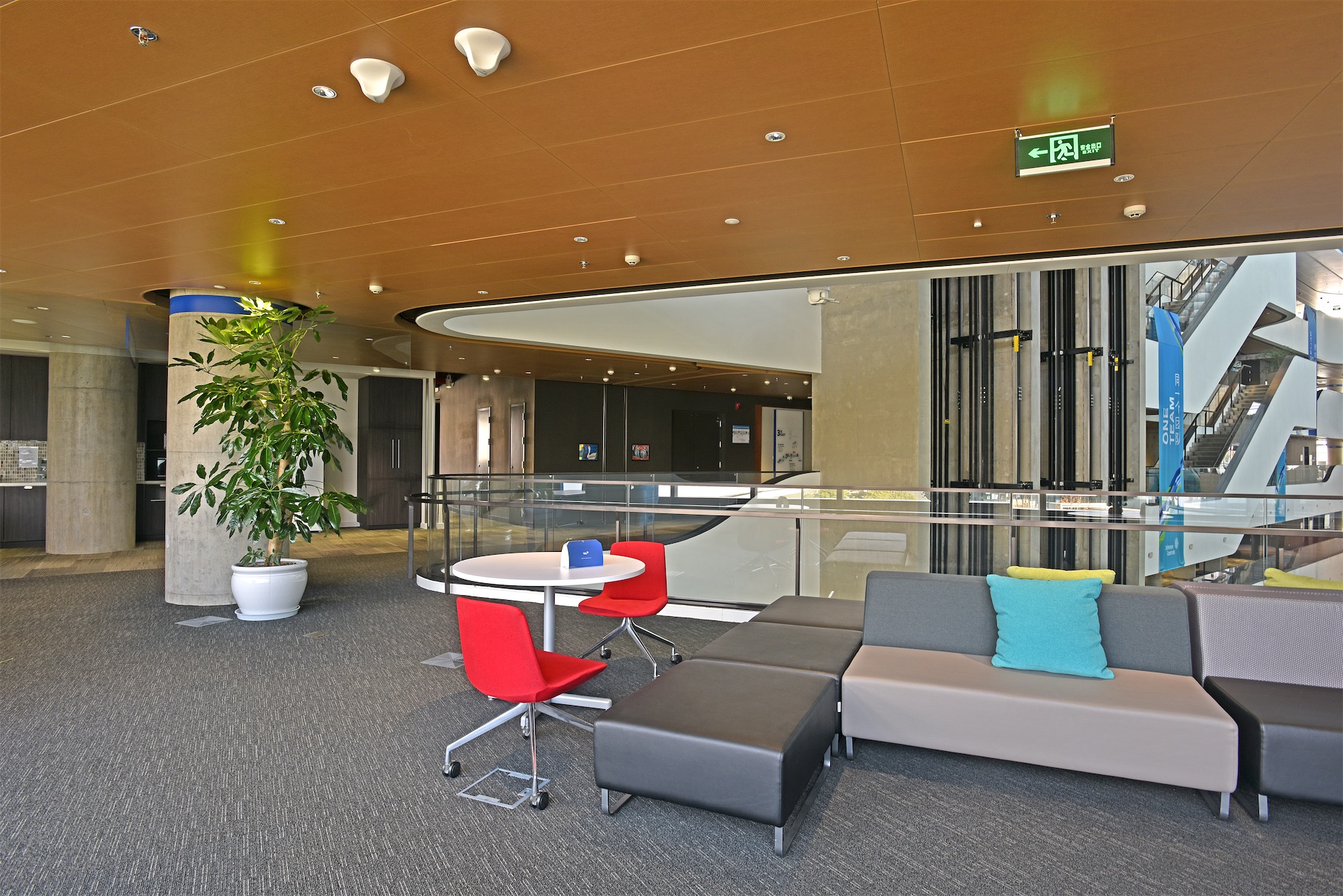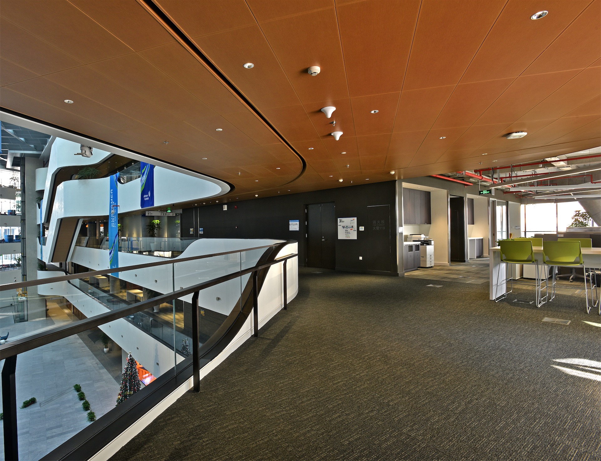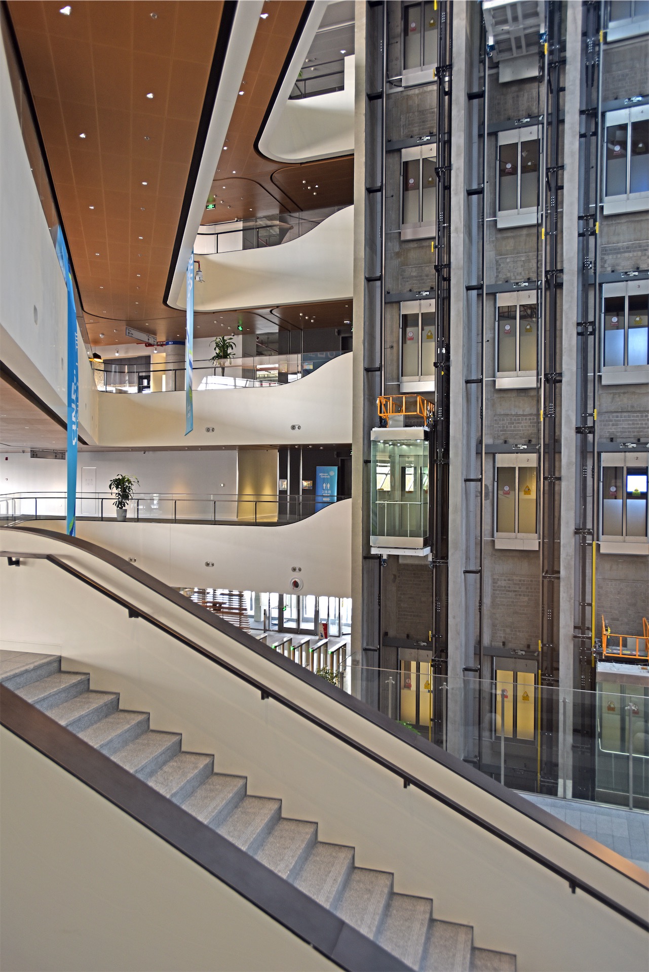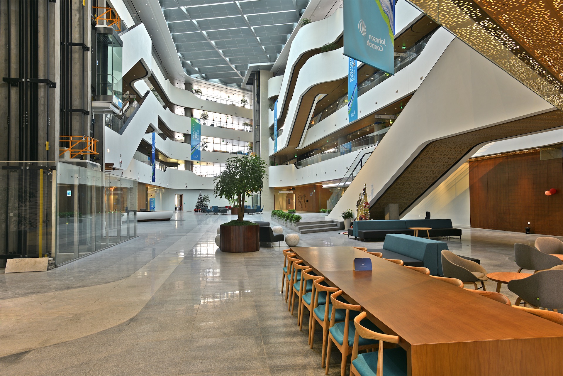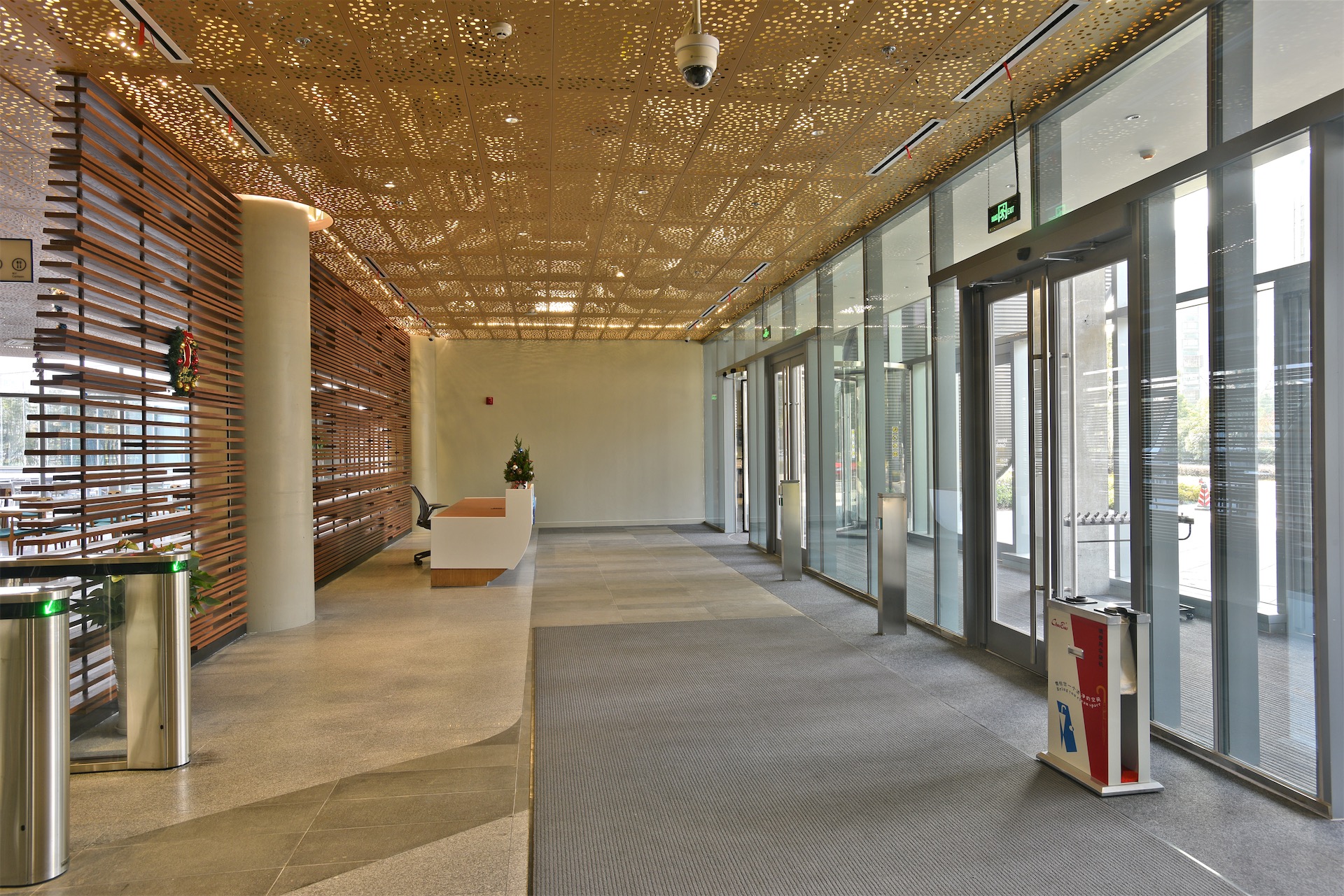 设计从最大限度的将自然景观引入建筑出发,同时确保江森自控的私密性和运营性不受影响。大楼设计为2栋狭窄的连续翼楼,中间为大型中庭。两座翼楼弯曲,最大限度地增加南北曝光面,使大楼产生一种双臂环拥的感觉,拥抱中心处社区枢纽中庭。