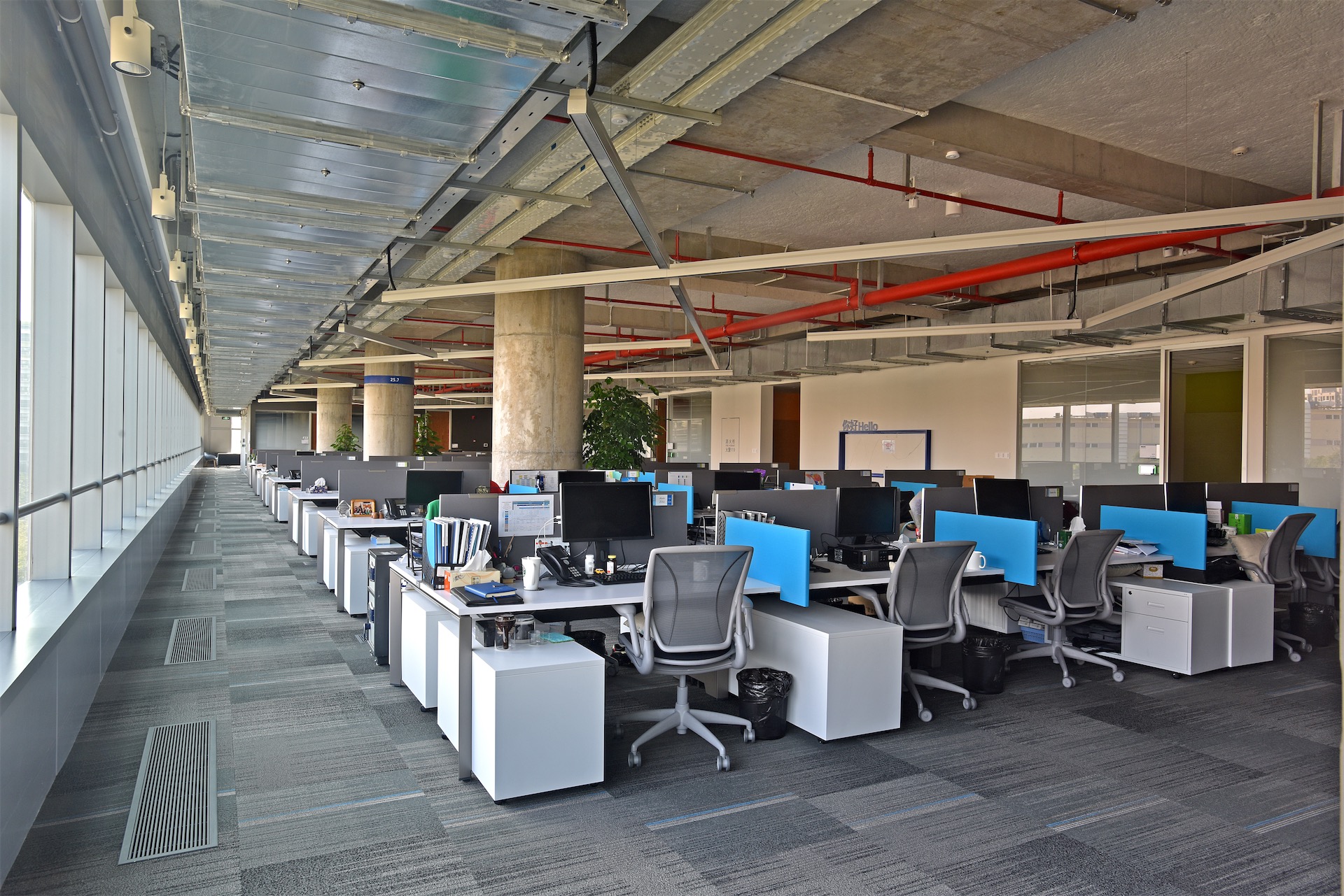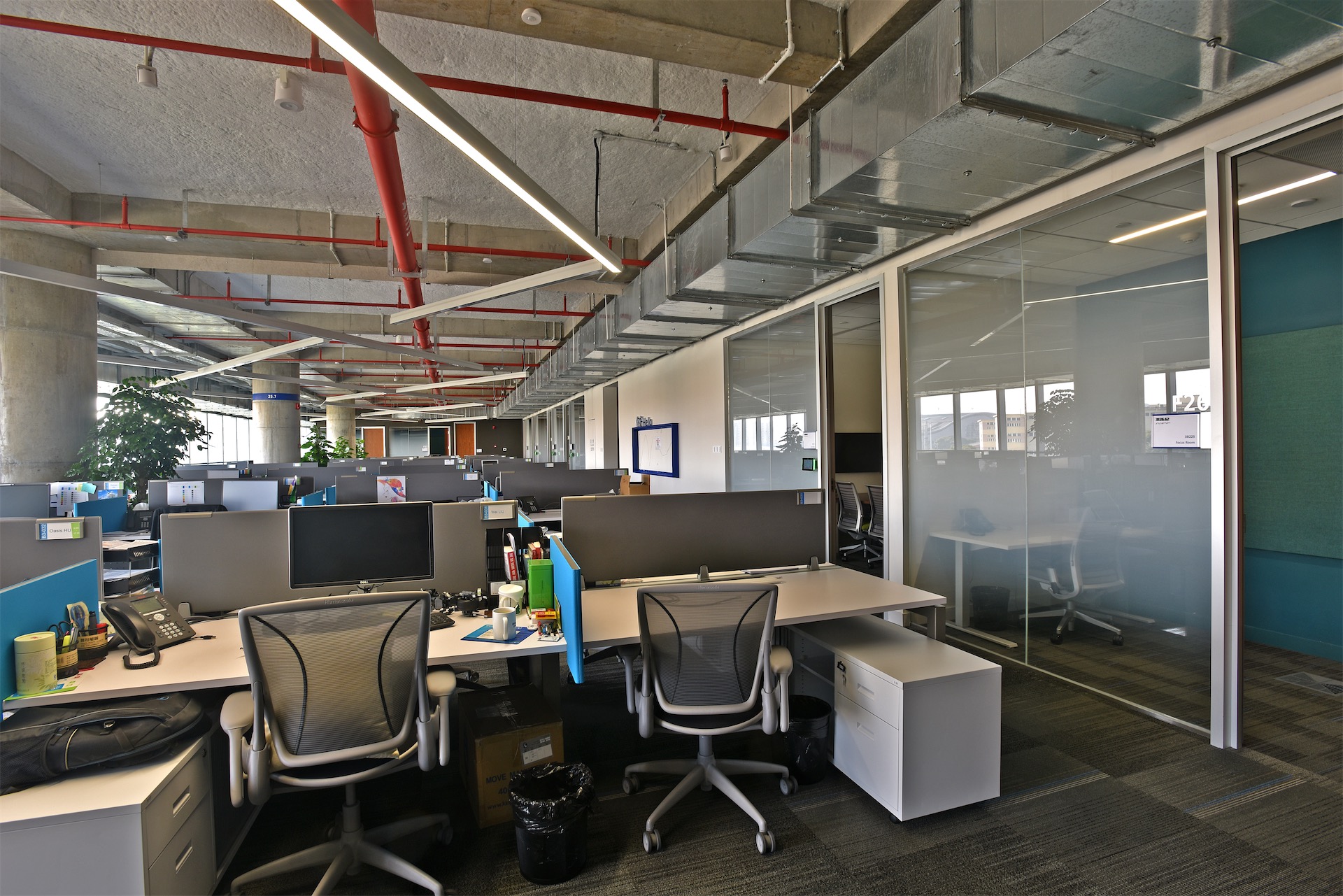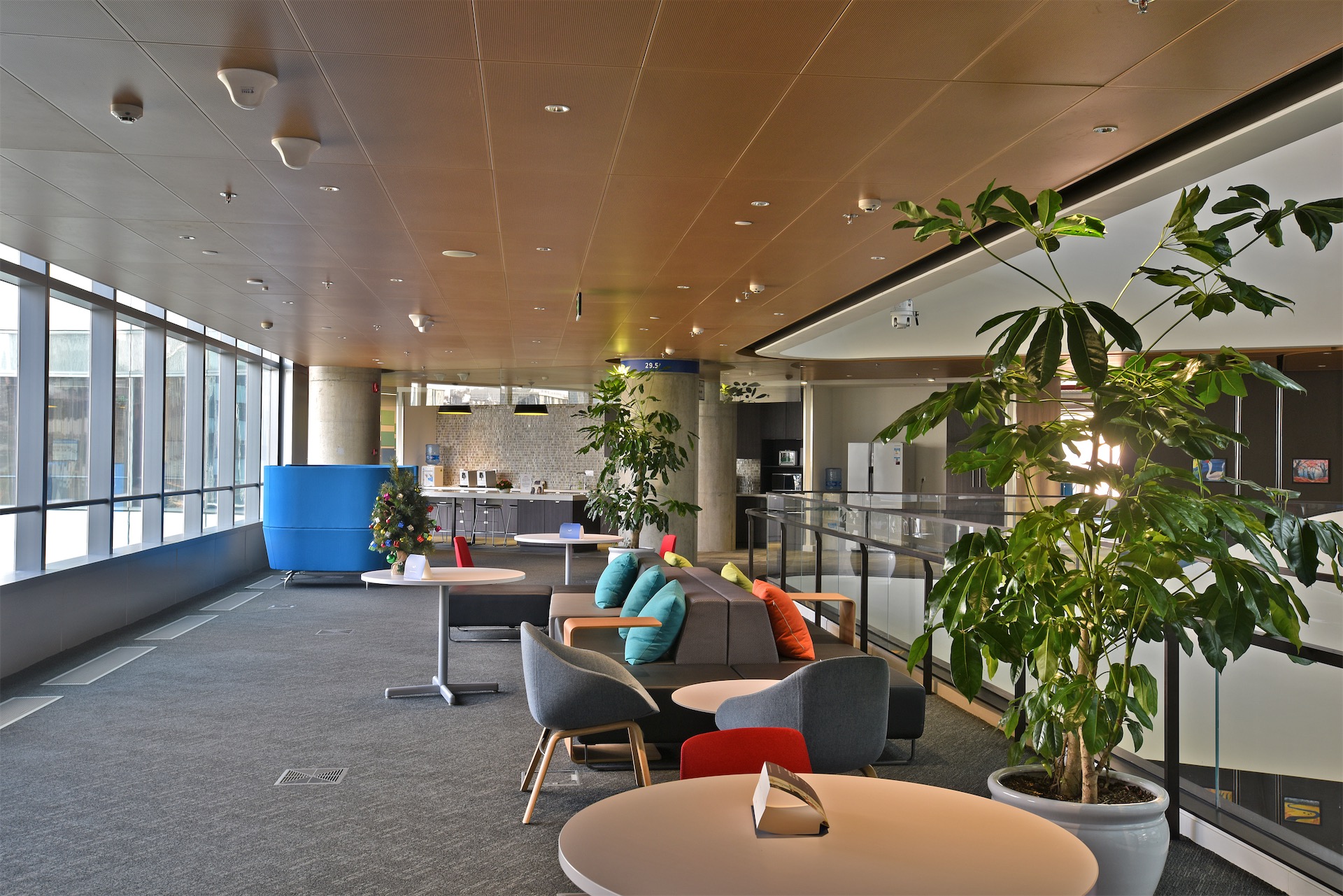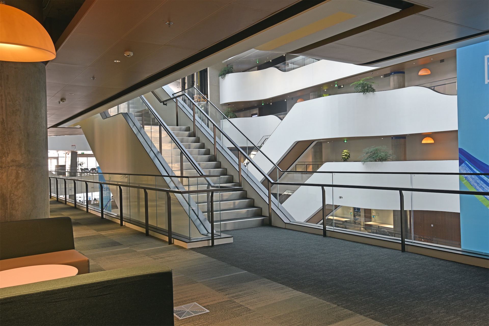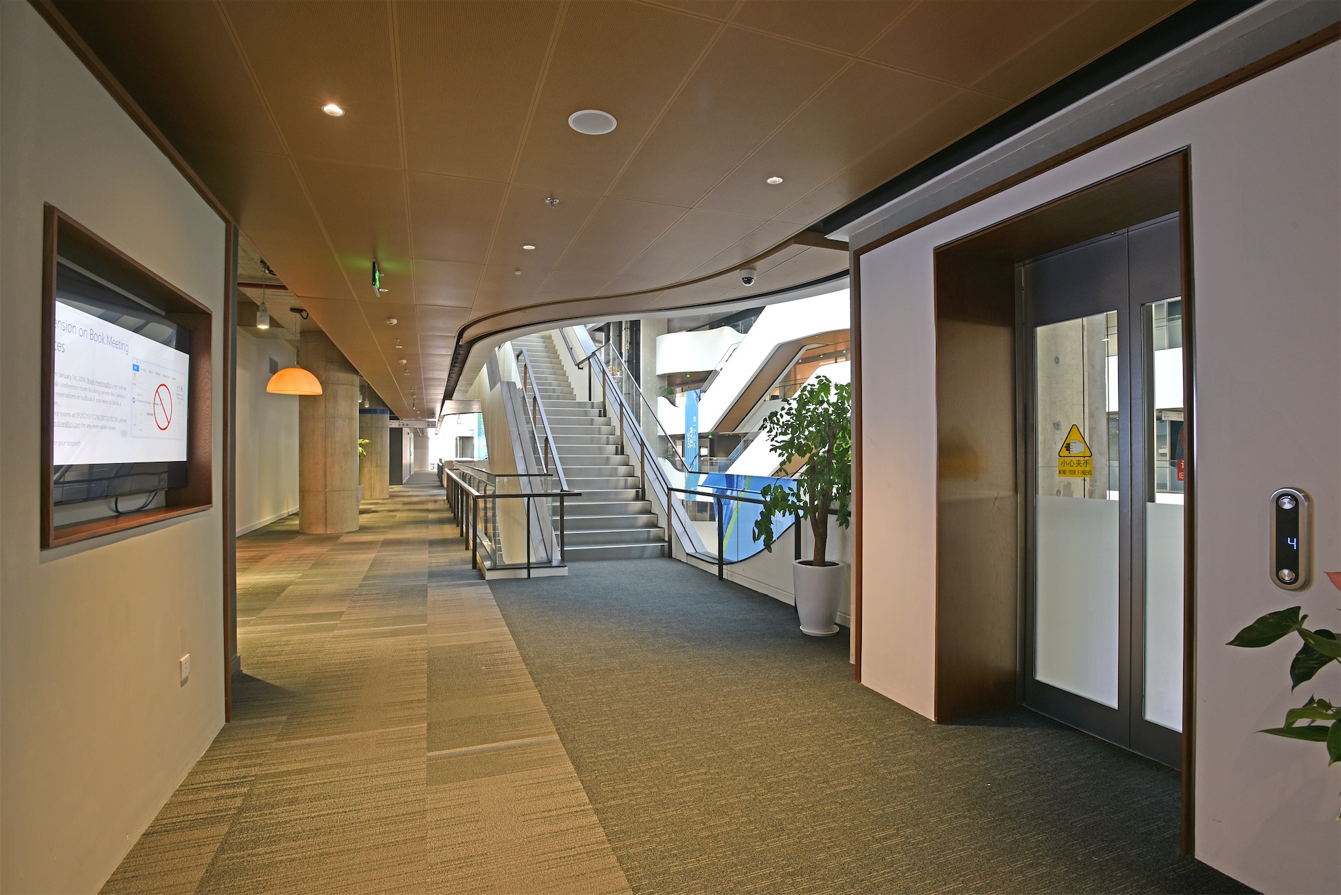 设计从最大限度的将自然景观引入建筑出发,同时确保江森自控的私密性和运营性不受影响。大楼设计为2栋狭窄的连续翼楼,中间为大型中庭。两座翼楼弯曲,最大限度地增加南北曝光面,使大楼产生一种双臂环拥的感觉,拥抱中心处社区枢纽中庭。