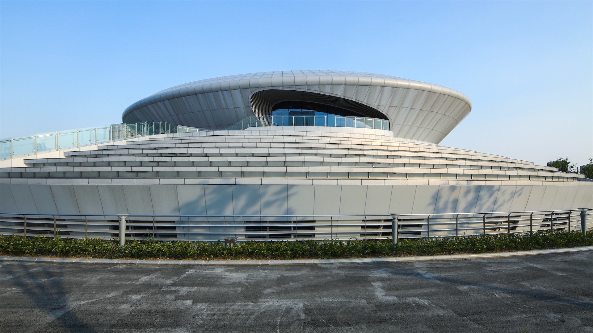 自行车展示馆建筑形态采用环形几何形体,来自自行车轮、自行车链条以及山间自行车小路的抽象形态来形成的几何意象。从城市环境、建筑体型、内部空间、光环境、风环境、绿色与节能等方面,以生态化理念一以贯之。
