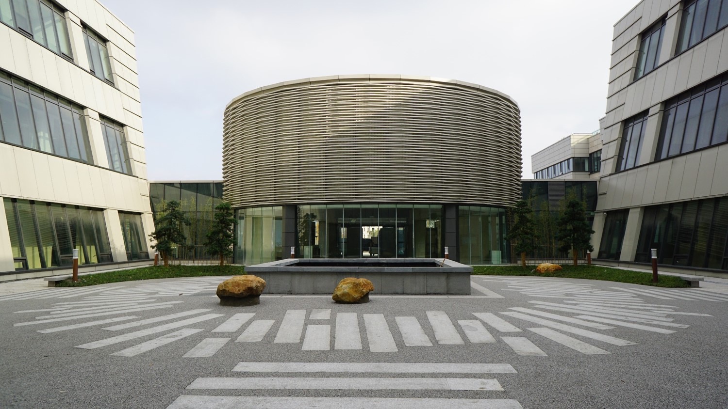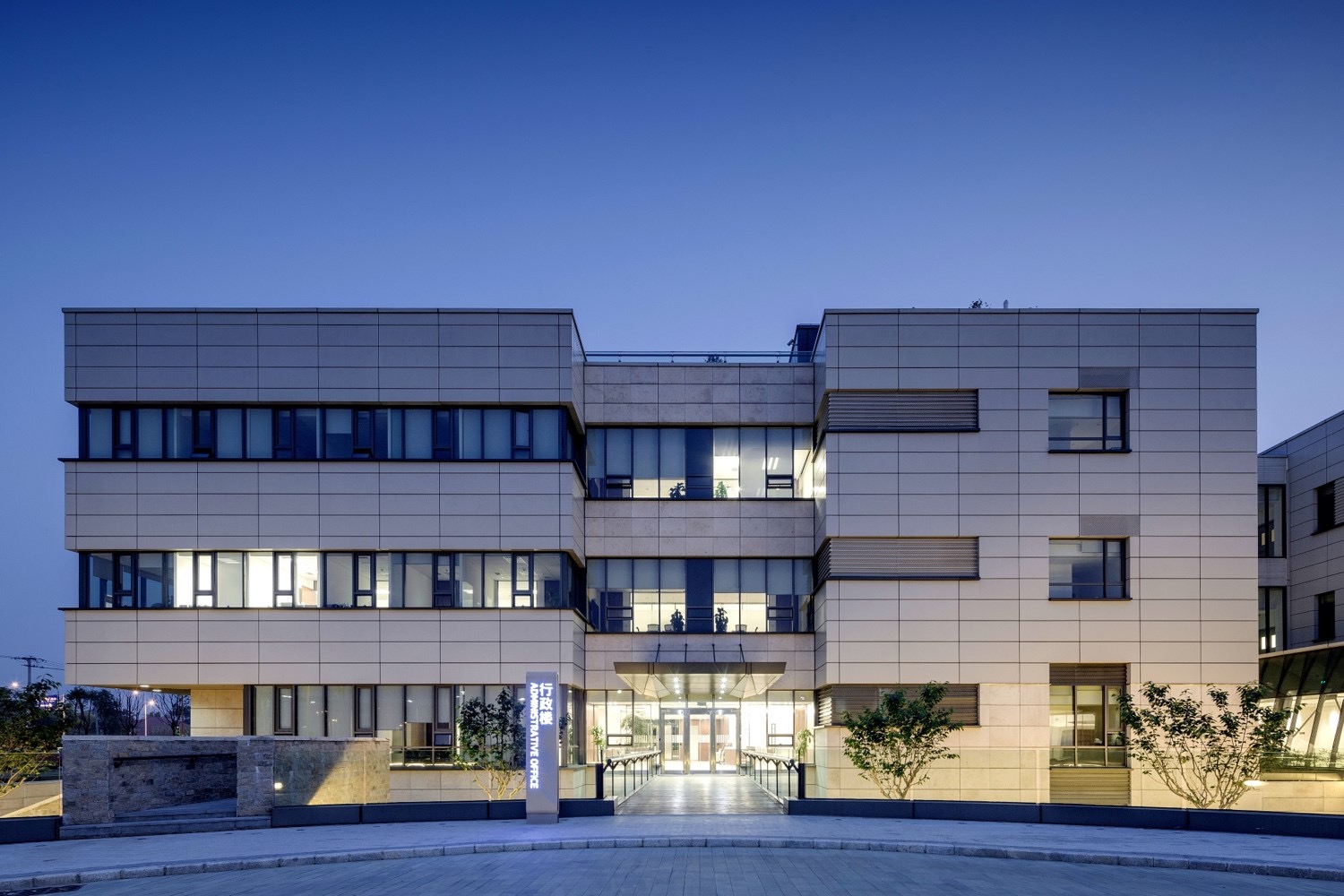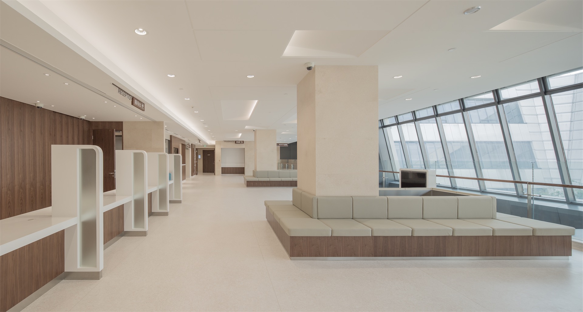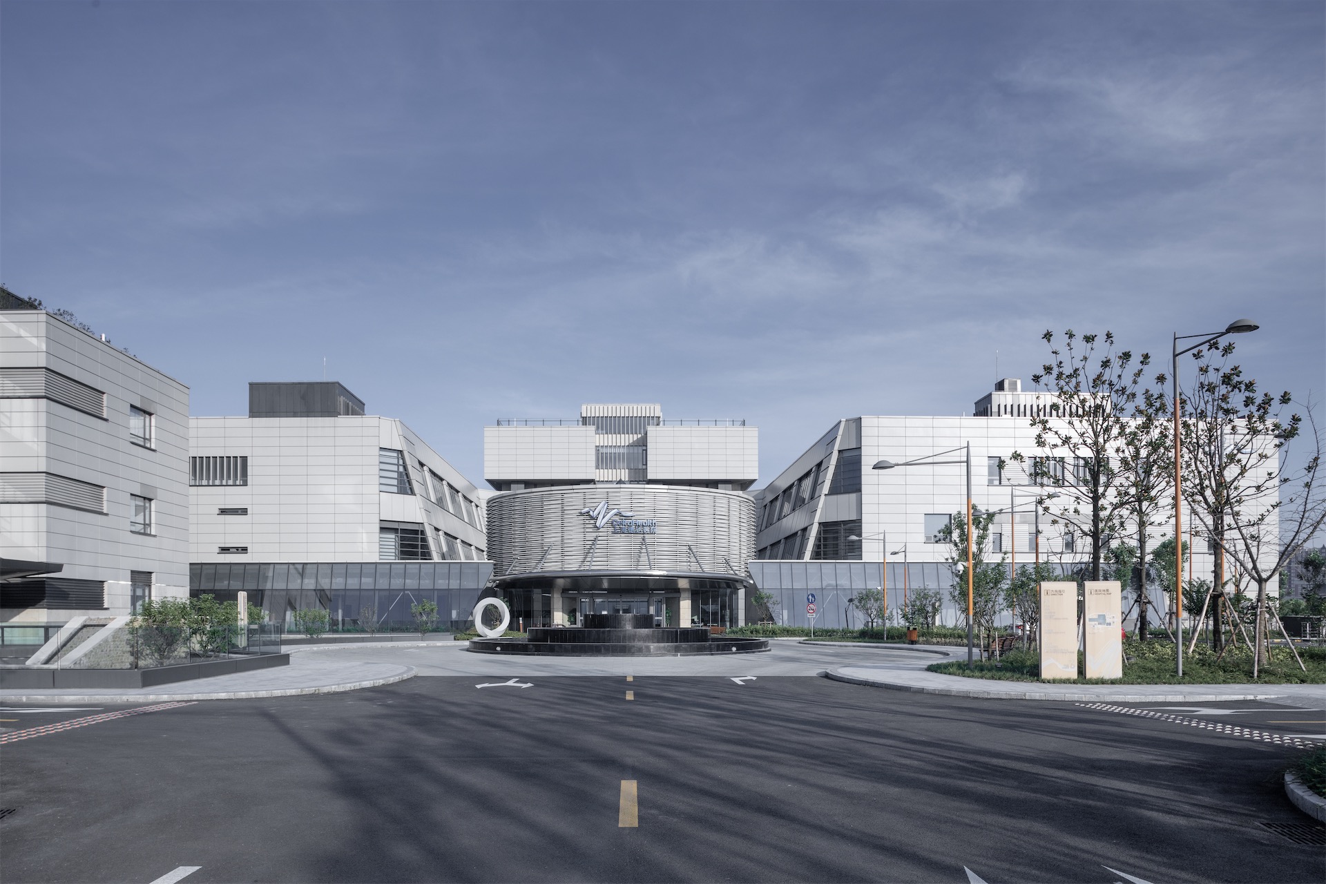 立面设计遵循医院建筑的功能特点——简洁、明快、大方、美观。摒弃烦冗的建筑符号,通过纯粹的几何形体穿插,石材、铝板、玻璃材质脉络的延续,强化了群体建筑的整体性,做到简洁而不失变化、大方而不失温馨。