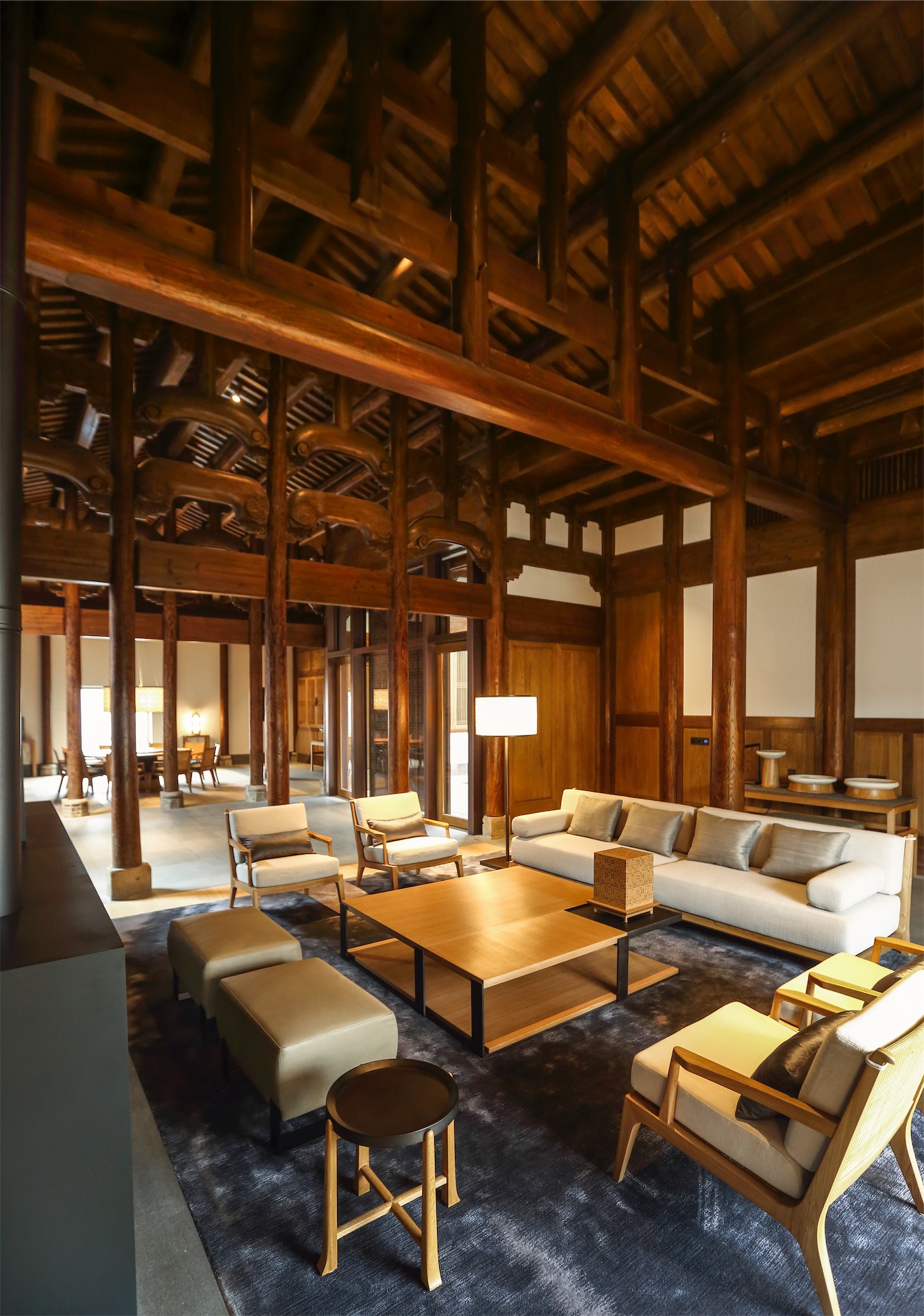 设计中,调研归纳总结了26栋民宅的空间布局、建筑形制等传统民居特色,在尊重传统空间格局的基础上,植入合理的新功能;分析测绘资料并结合现有构件状况,通过科学计算、增加支撑结构、提高节点刚度等方法,使民宅提升了结构可靠度和抗震能力;以国家现行消防规范为主要依据,增加喷淋系统等,提升消防性能;遵照最小干预和可识别性的设计原则,巧妙设置设备设施,满足公共建筑节能、隔声等要求。