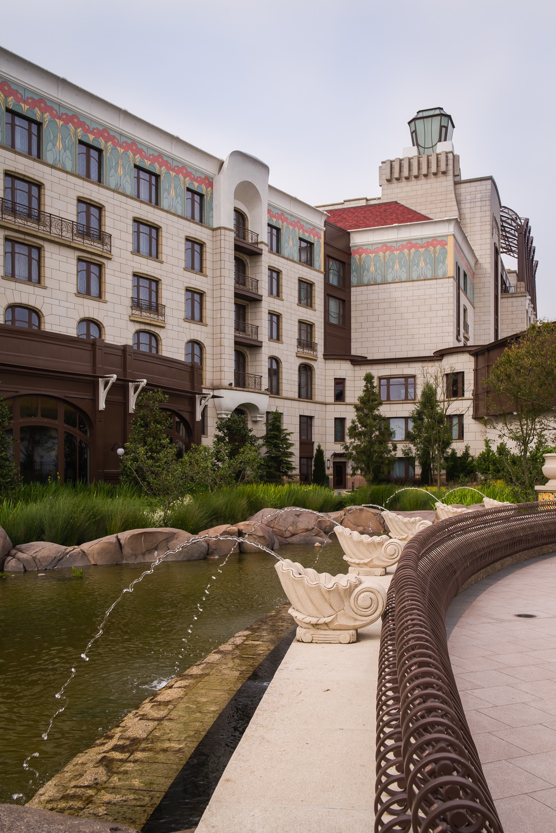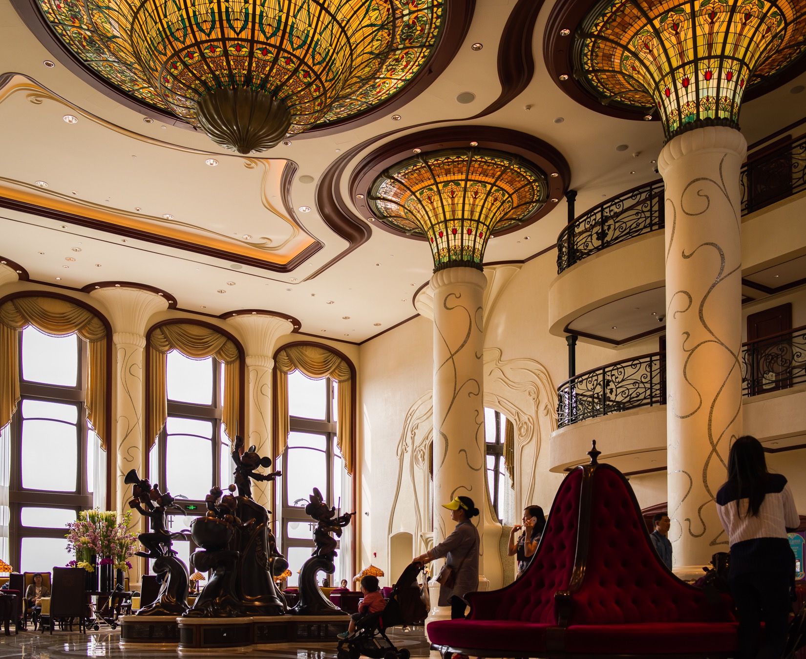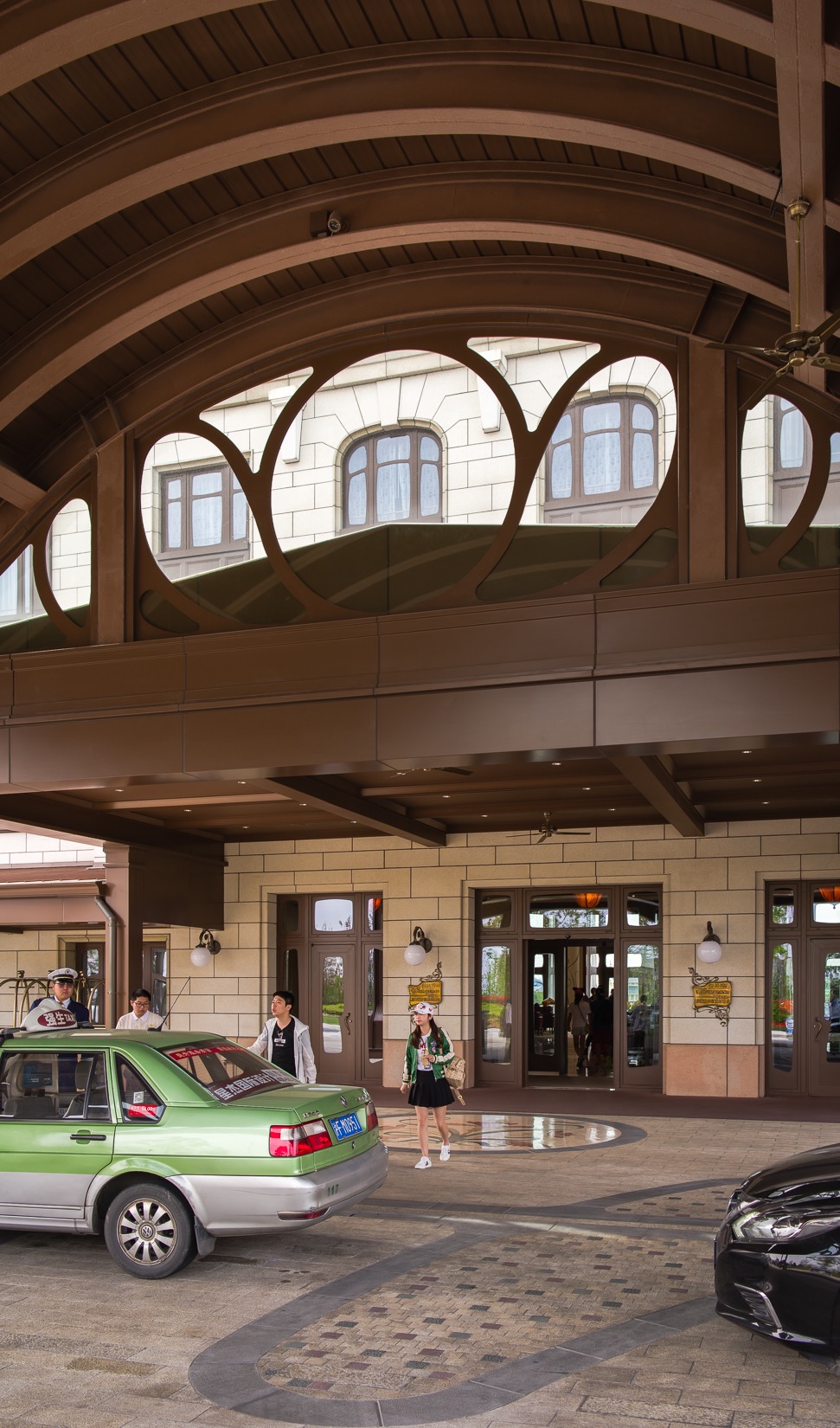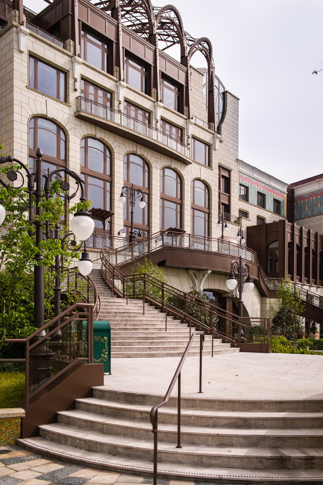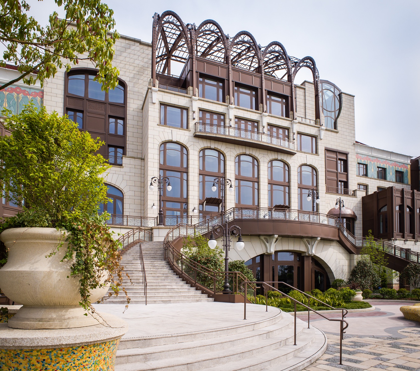 本项目旨在创造充满迷人活力的建筑空间,整个酒店设计糅合了十九世纪新艺术主义建筑风格以及同时期在法国盛行的艺术传统,主题明确、造型独特,建筑室内外设计都充满着优美的童话特色,建筑以这种独特的方式陈述着迪士尼文化的丰富内容。建筑立面是从两翼客房逐层退台并逐渐往酒店中心升高的塔楼造型,观景平台上部的装饰性构架和塔楼等造型元素有灯光映衬,从湖泊对岸观看在视觉上呈现为一个大型灯笼,制造出中央皇冠璀璨闪耀的效果。美国迪士尼文化远渡重洋来到中国扎根发展,同时也注重与本土文化的沟通交融,顶部的灯笼造型是从中国传统形象中提炼而成的。