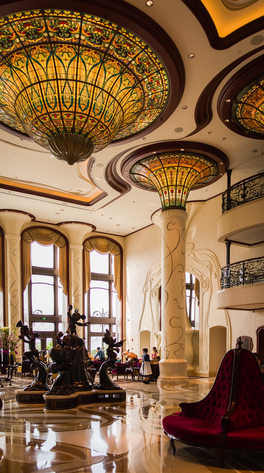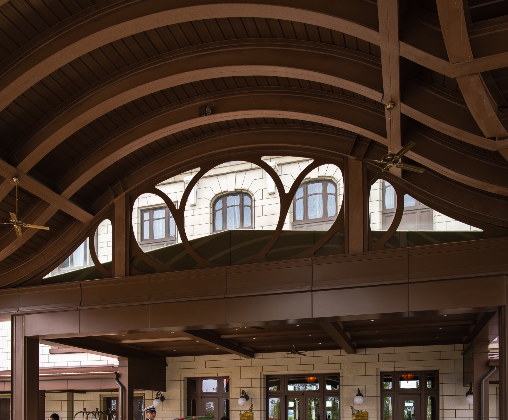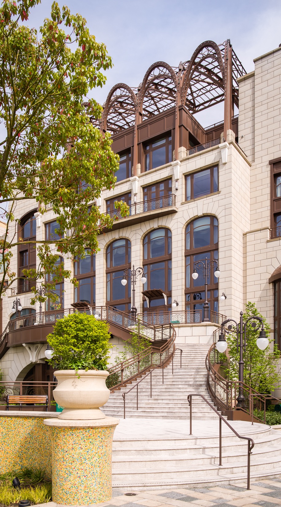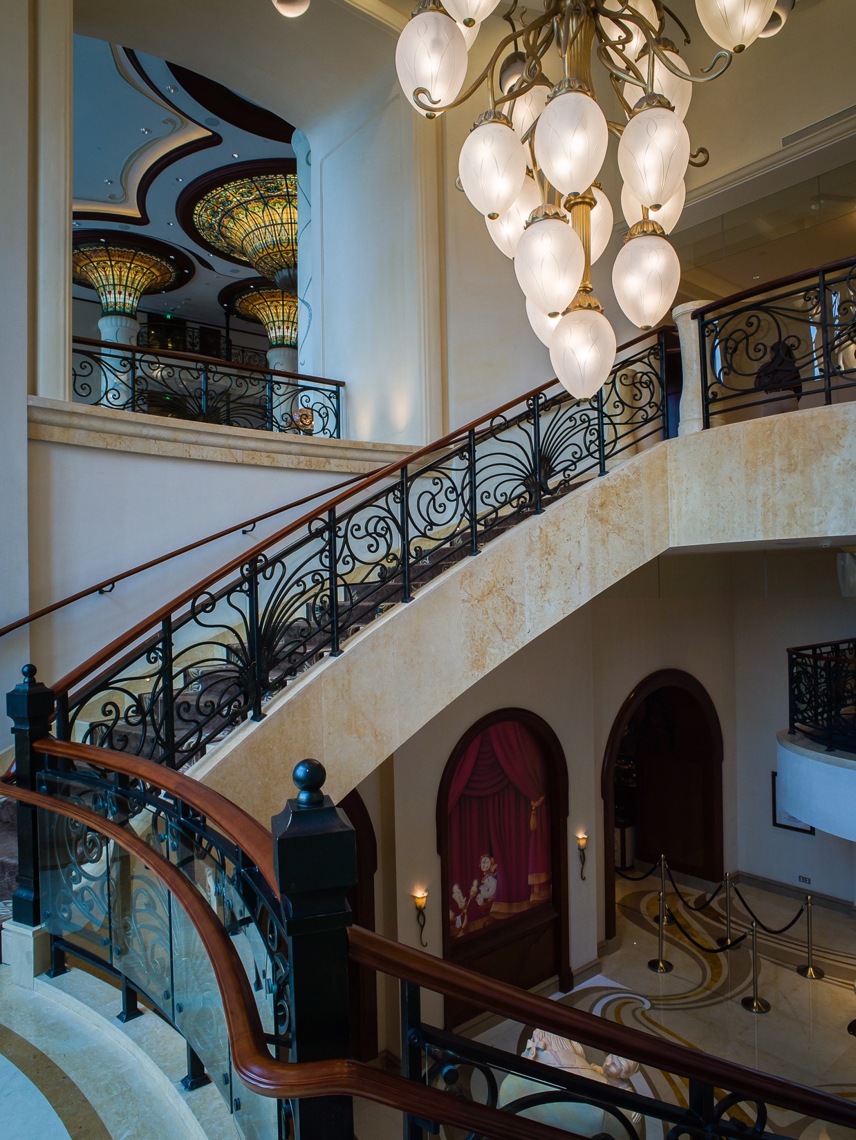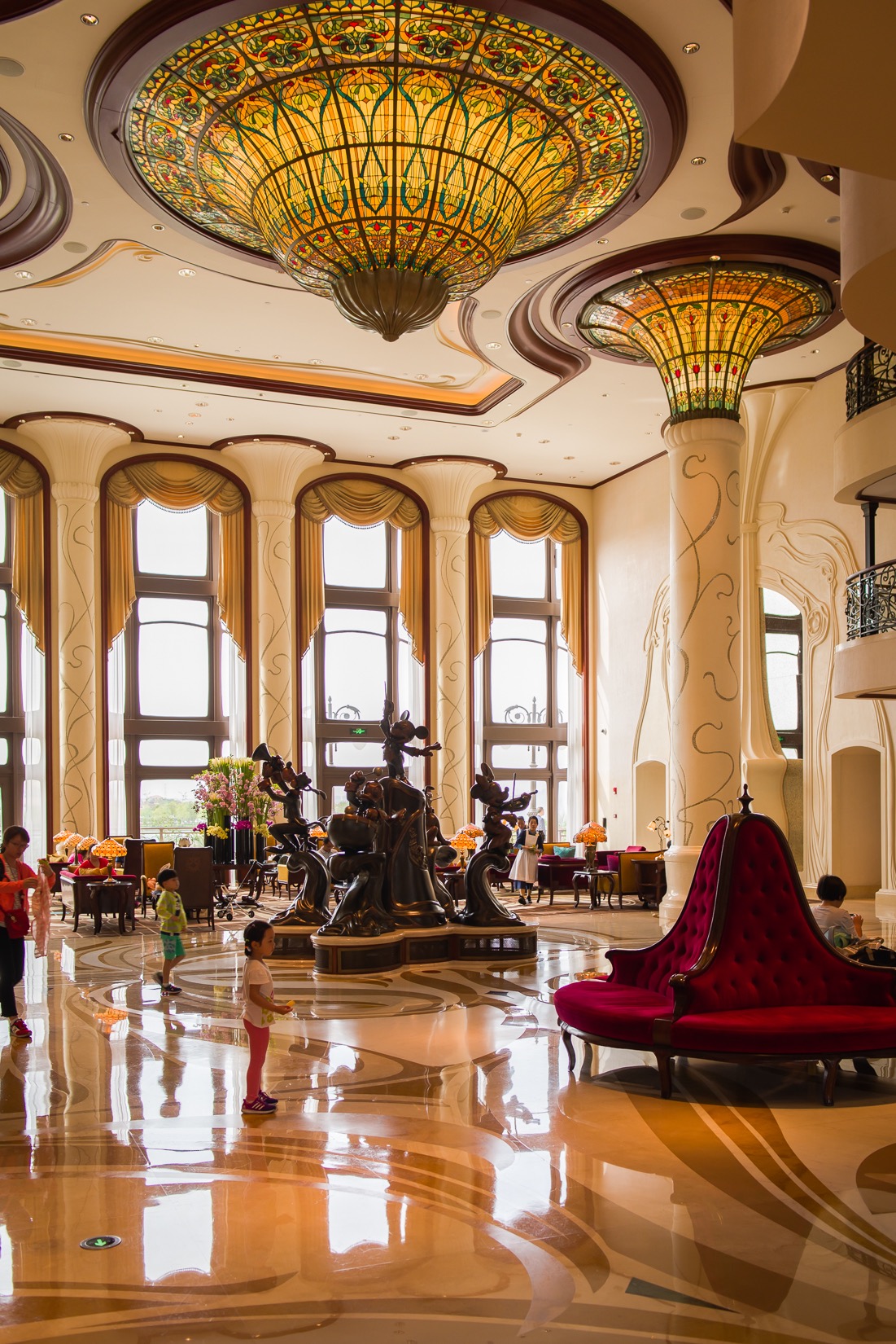本项目旨在创造充满迷人活力的建筑空间,整个酒店设计糅合了十九世纪新艺术主义建筑风格以及同时期在法国盛行的艺术传统,主题明确、造型独特,建筑室内外设计都充满着优美的童话特色,建筑以这种独特的方式陈述着迪士尼文化的丰富内容。建筑立面是从两翼客房逐层退台并逐渐往酒店中心升高的塔楼造型,观景平台上部的装饰性构架和塔楼等造型元素有灯光映衬,从湖泊对岸观看在视觉上呈现为一个大型灯笼,制造出中央皇冠璀璨闪耀的效果。美国迪士尼文化远渡重洋来到中国扎根发展,同时也注重与本土文化的沟通交融,顶部的灯笼造型是从中国传统形象中提炼而成的。