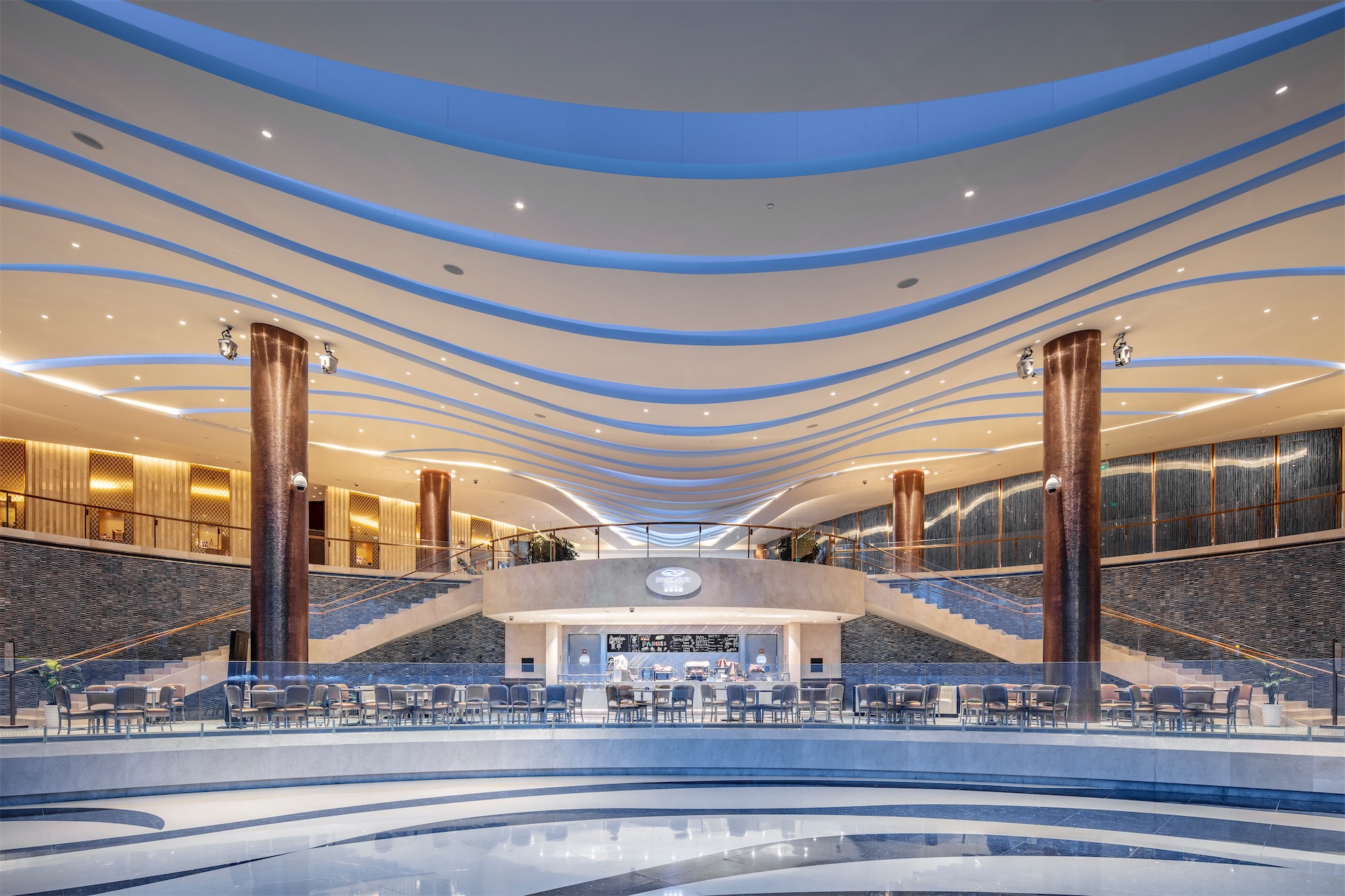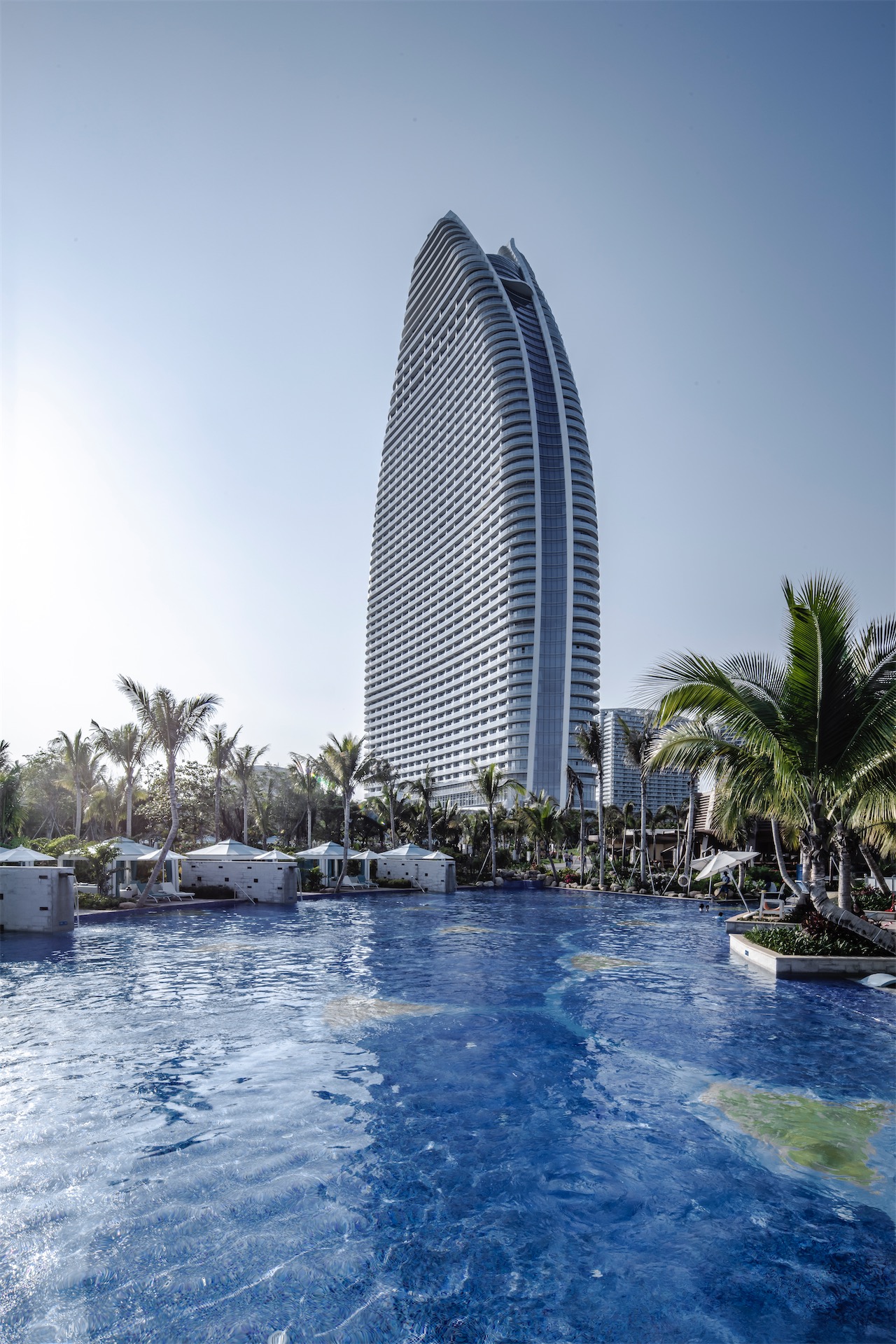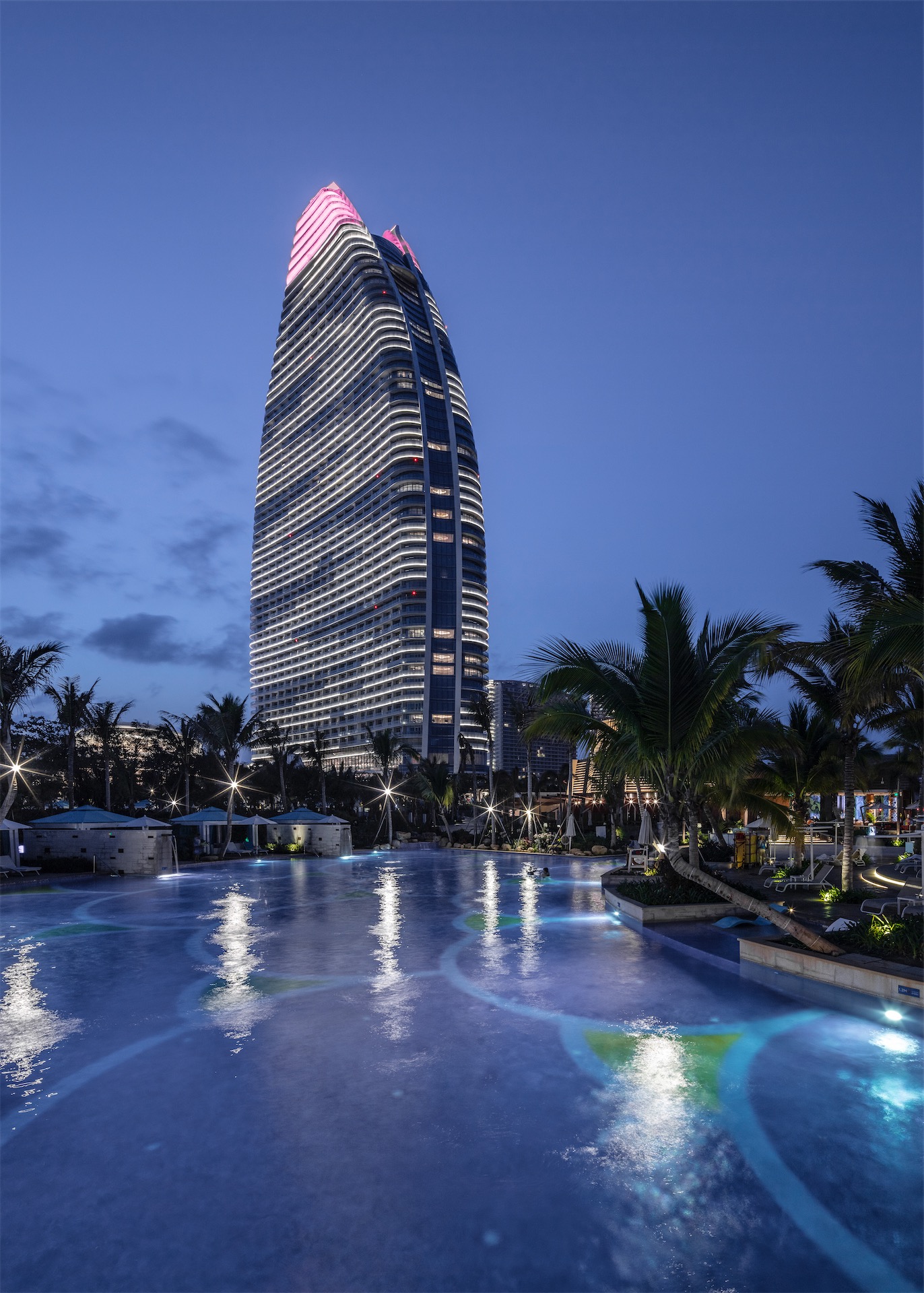 塔楼采用“风帆”造型,与裙房相结合,具有开阔无遮挡的楼顶,阶梯形式向下延伸到水上乐园和游泳池。客房设计有釉面阳台相互连贯,为塔楼带来动感,从而营造出光影在建筑上不间断变幻的美妙韵致。建筑顶部灯光打亮后,可形成耸立近30米高的巨型灯盏。