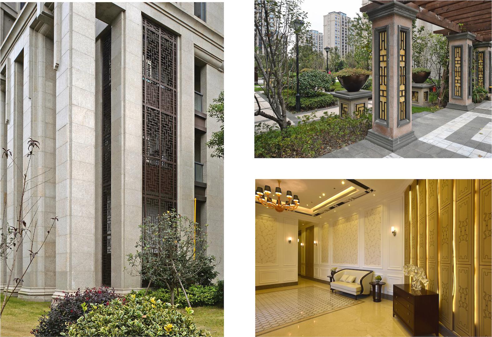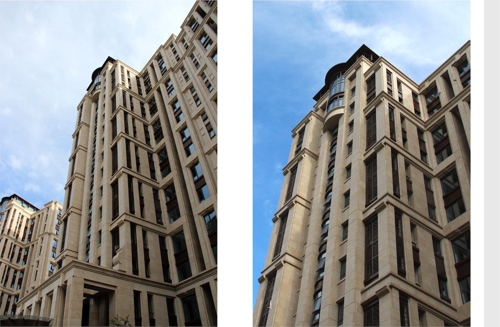 在立面设计上充分兼顾美观,实用和经济性,尊重江湾城详细规划的自身特点,采用不断追求创新的Art deco风格,全立面采用干挂石材,在窗、阳台及材料等细部上不断推敲,并加以变化。