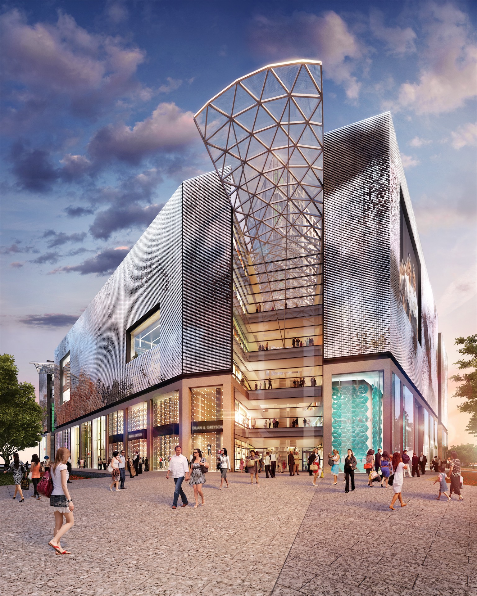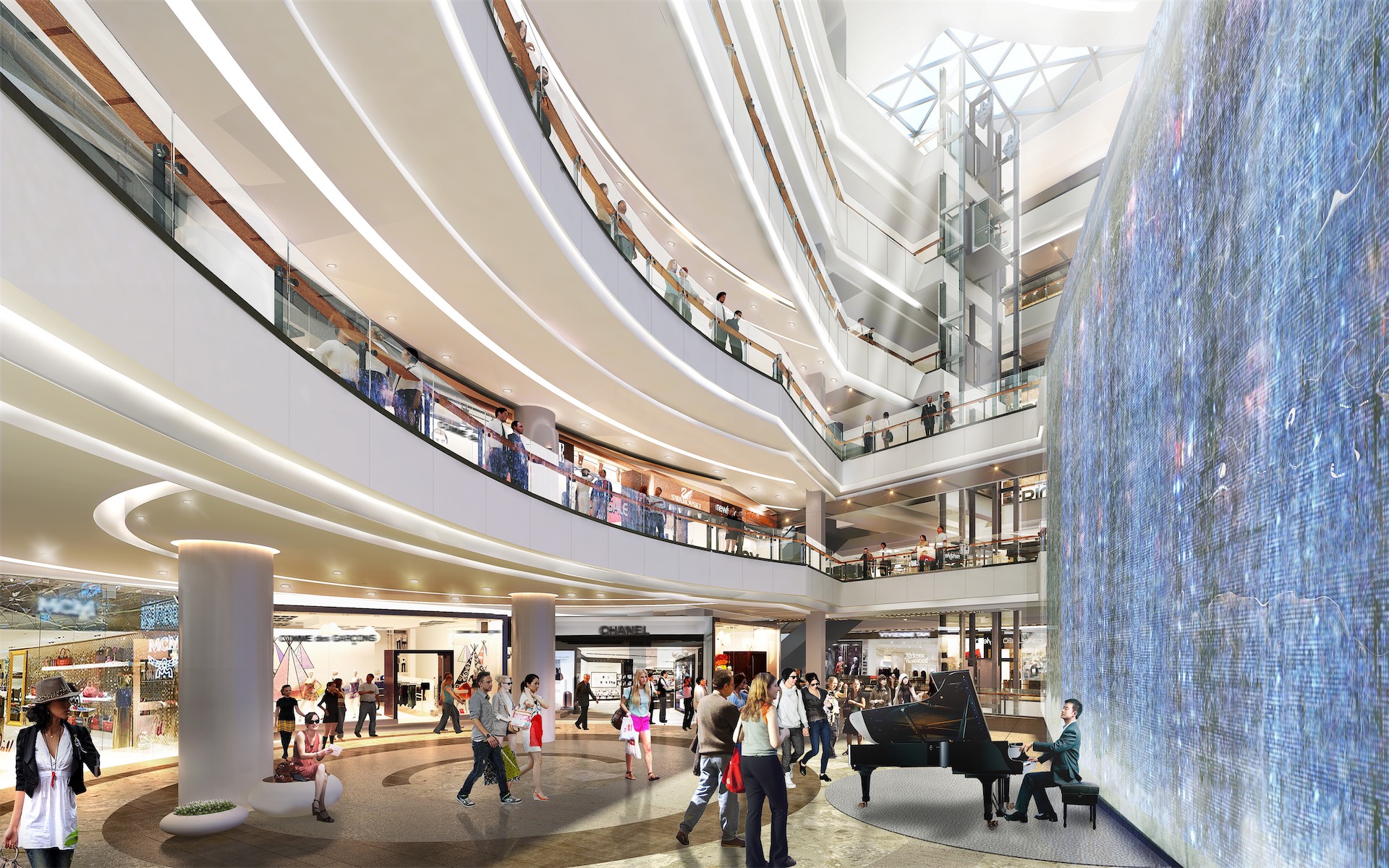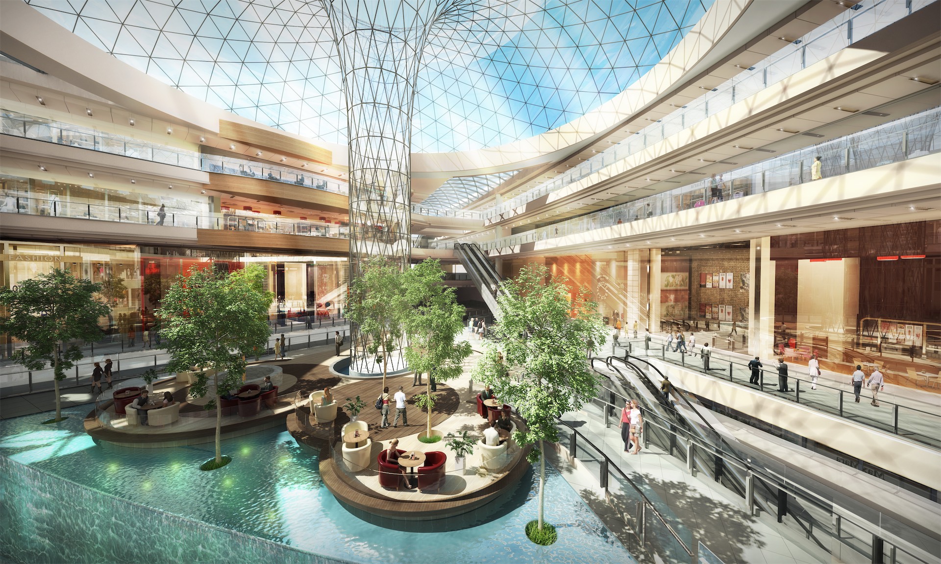 三条宽敞的商业内街在基地上相互交叉形成中心区三角形的中庭花园。裙房商业中心区域由一个蘑菇状的巨型穹顶所覆盖,并在三层设计了一座绿洲花园。阳光可以直接穿越柱廊区和绿洲花园的透明围合表皮,一直照射到商业街。