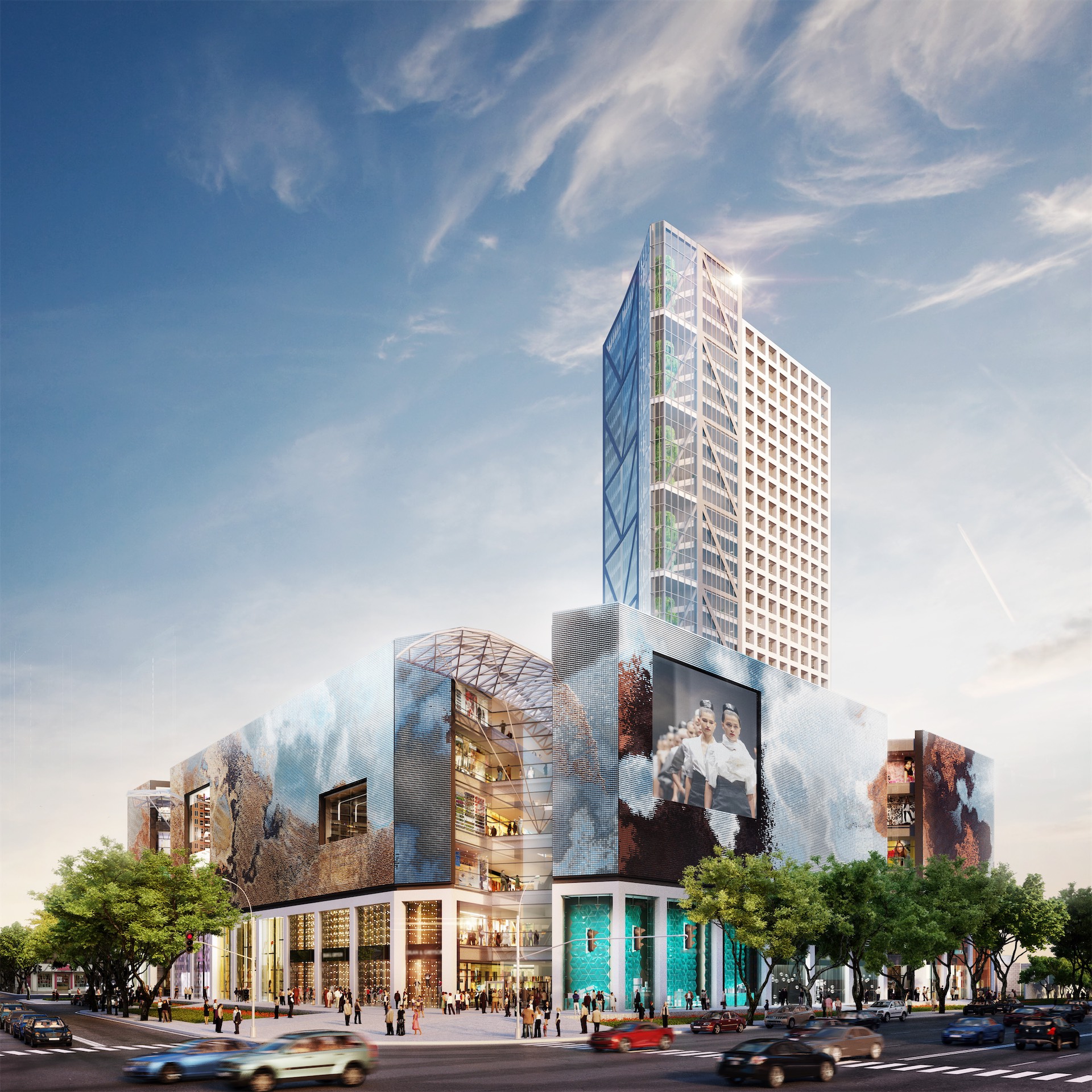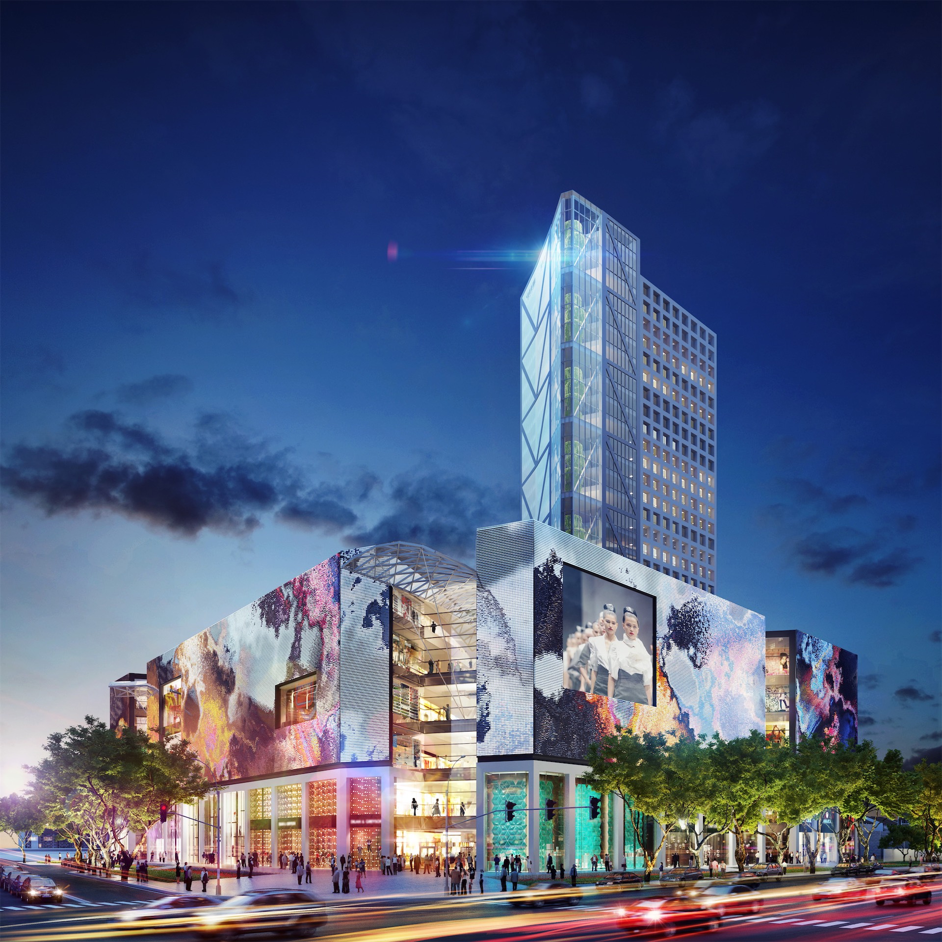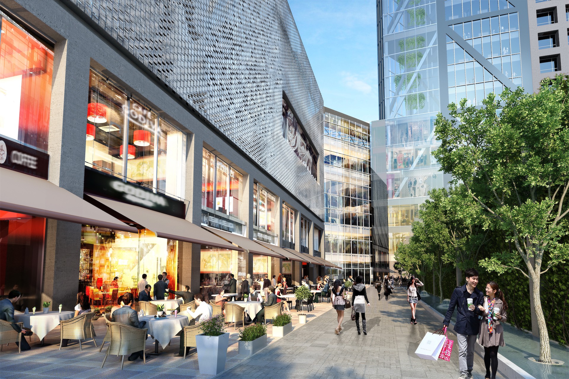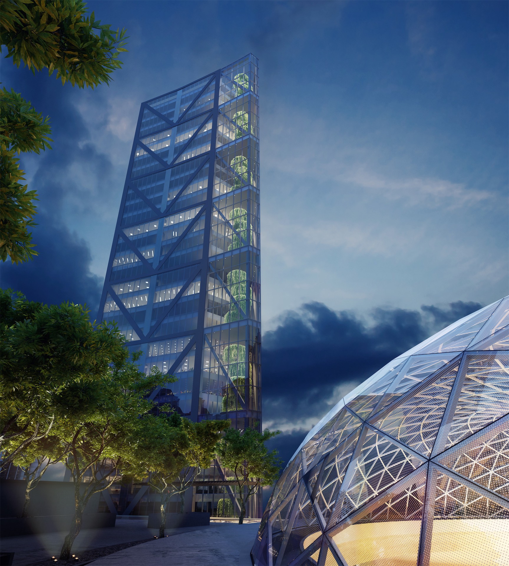 三条宽敞的商业内街在基地上相互交叉形成中心区三角形的中庭花园。裙房商业中心区域由一个蘑菇状的巨型穹顶所覆盖,并在三层设计了一座绿洲花园。阳光可以直接穿越柱廊区和绿洲花园的透明围合表皮,一直照射到商业街。
