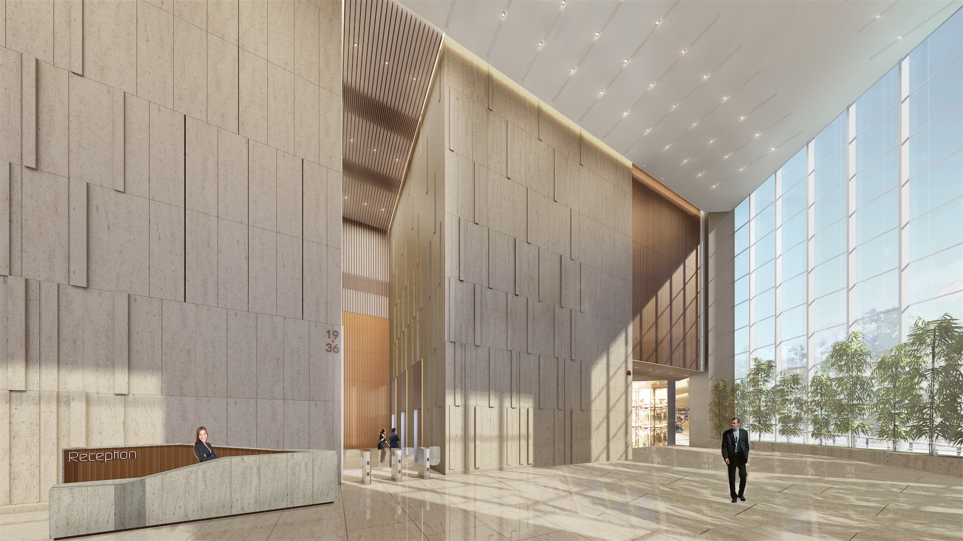 立面两层高的柱廊形成了建筑边缘,在柱廊之上由15cmX15cm的金属小片组成的巨型装置艺术包裹着整个建筑,并随着风的微妙变化而轻轻摆动。办公塔楼围合结构的剖面被精心设计,形成尖塔的形式,围合的混凝土部分通设深窗,从而柔化进入建筑的日光并同时提供必要的遮阳保护。从内而外,回应“都市绿洲”的主要设计理念。