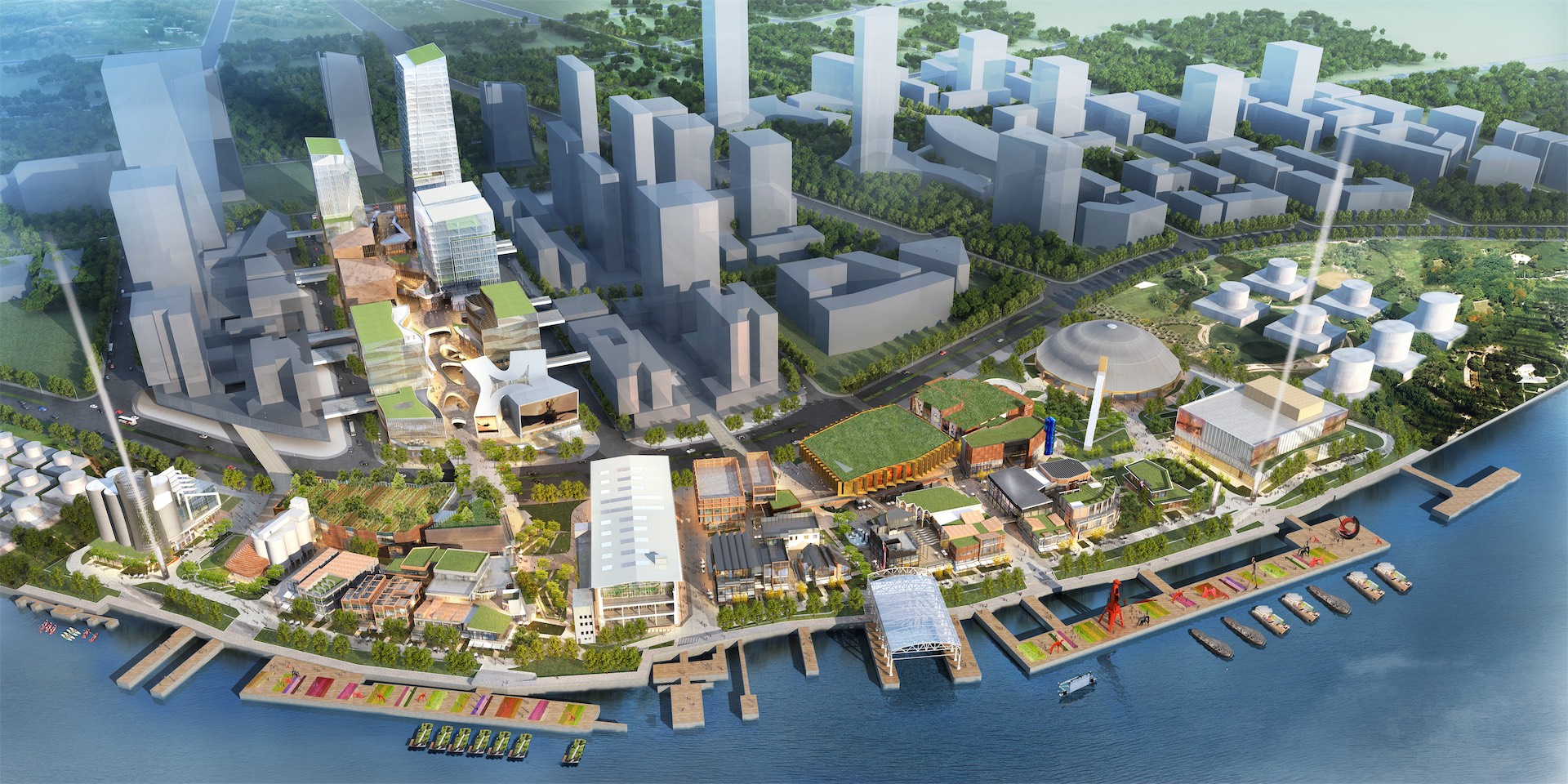 作为上海水泥厂的遗址,规划将5个工业时代的遗留建筑进行保留、改造,使之重获新生,成为城市发展历史的见证。一系列活动空间,如公共广场、主要节点空间、林荫大道、滨水长廊、小街和巷道、中心广场创造出多元化且独特的区域。