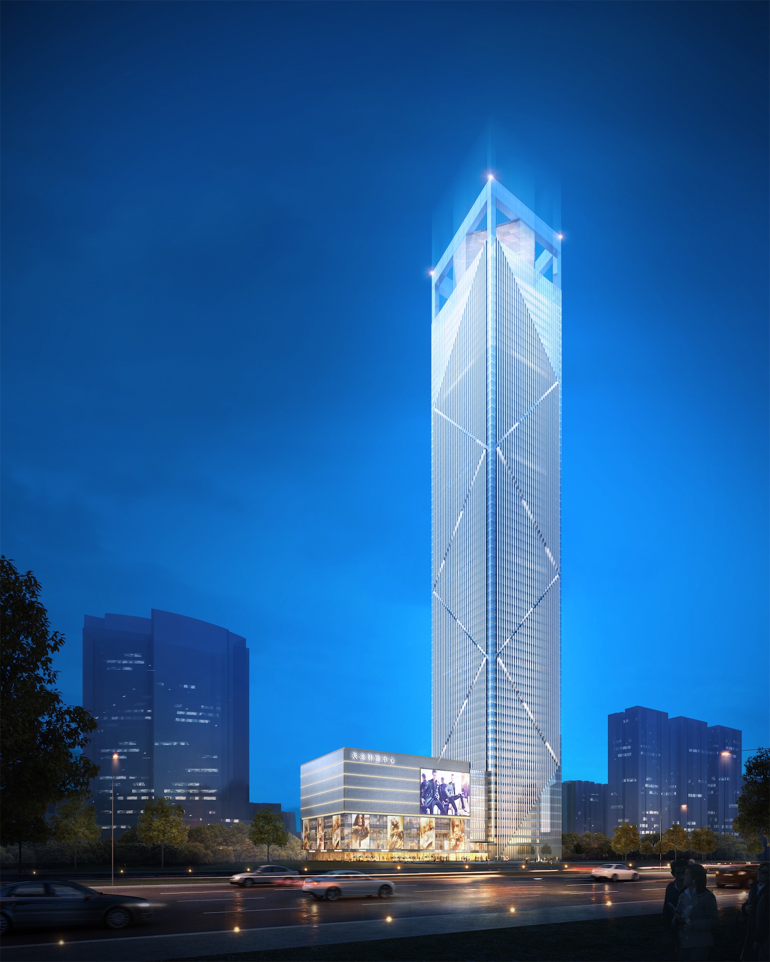 作为区域性的标志性建筑,天龙独特的形体取意于中国的盘龙形象,利用交错变化的幕墙设计、横竖线条的对比创造出简洁利落的建筑体形,冉冉升起,屹立一方。