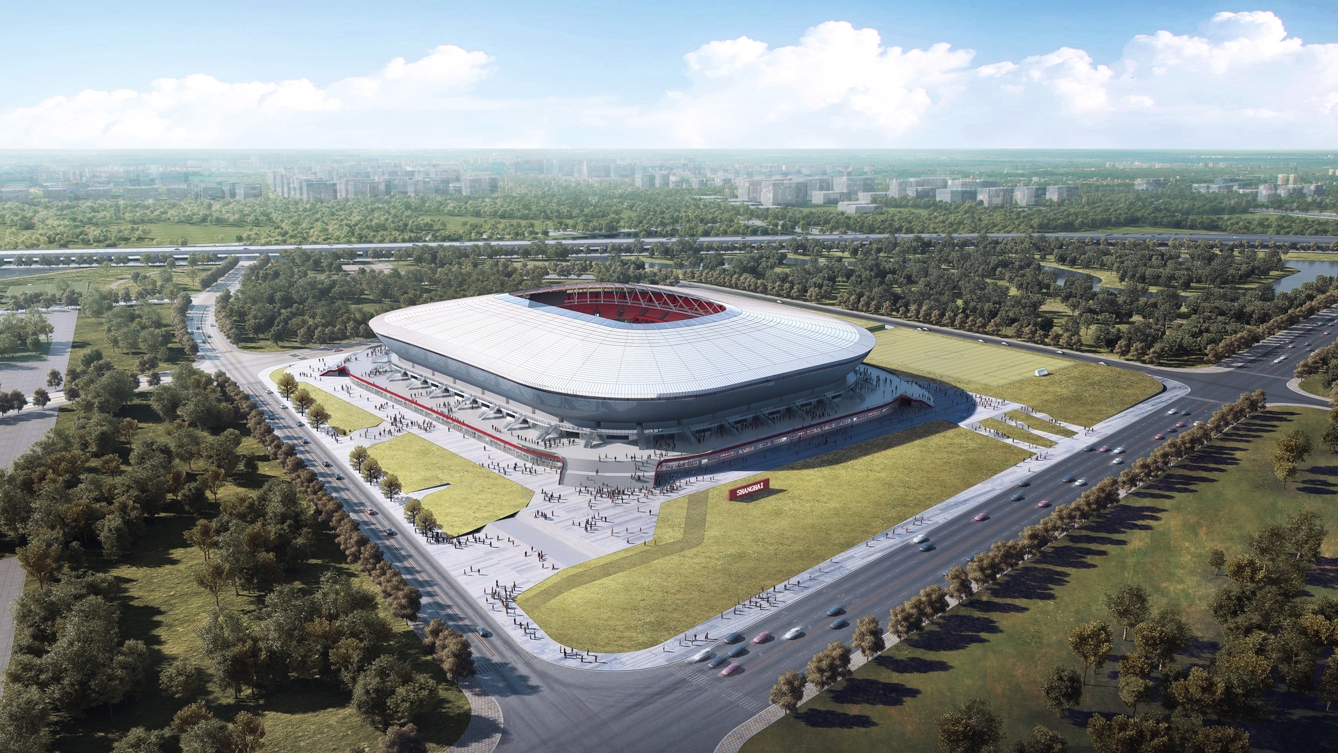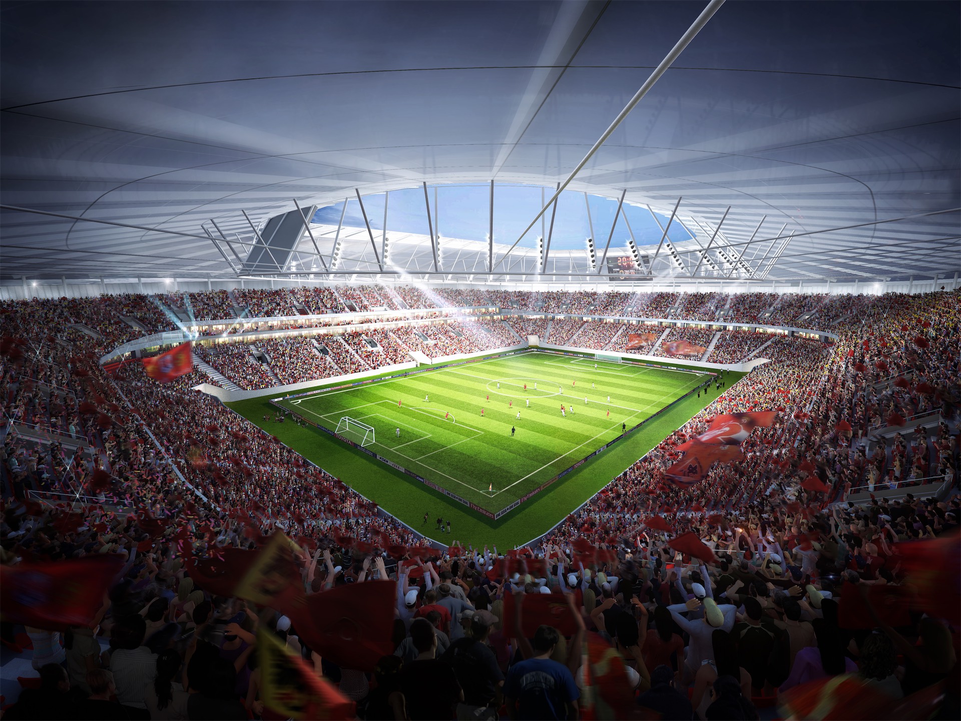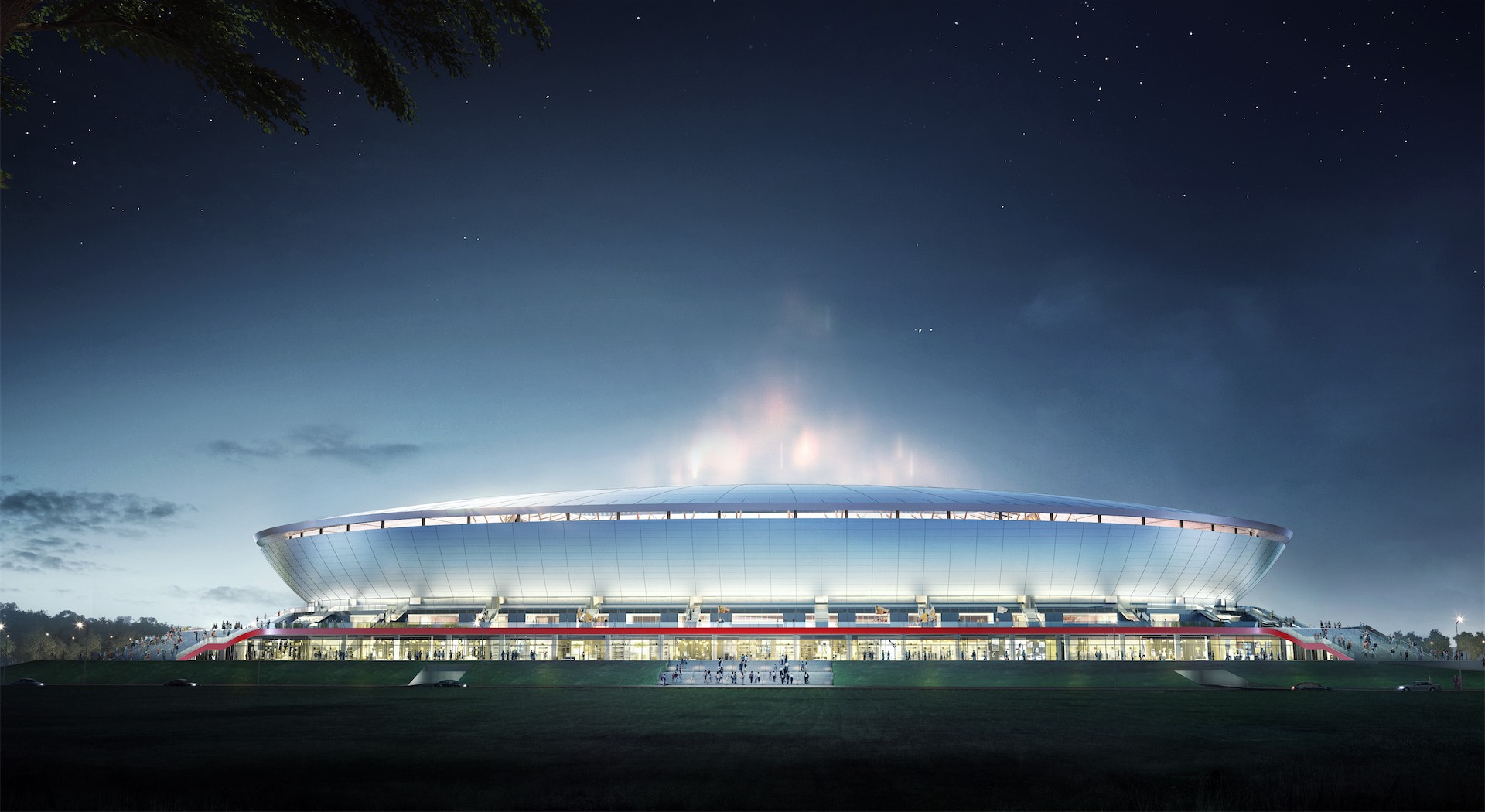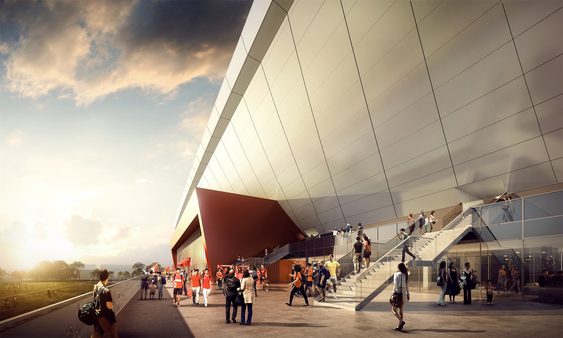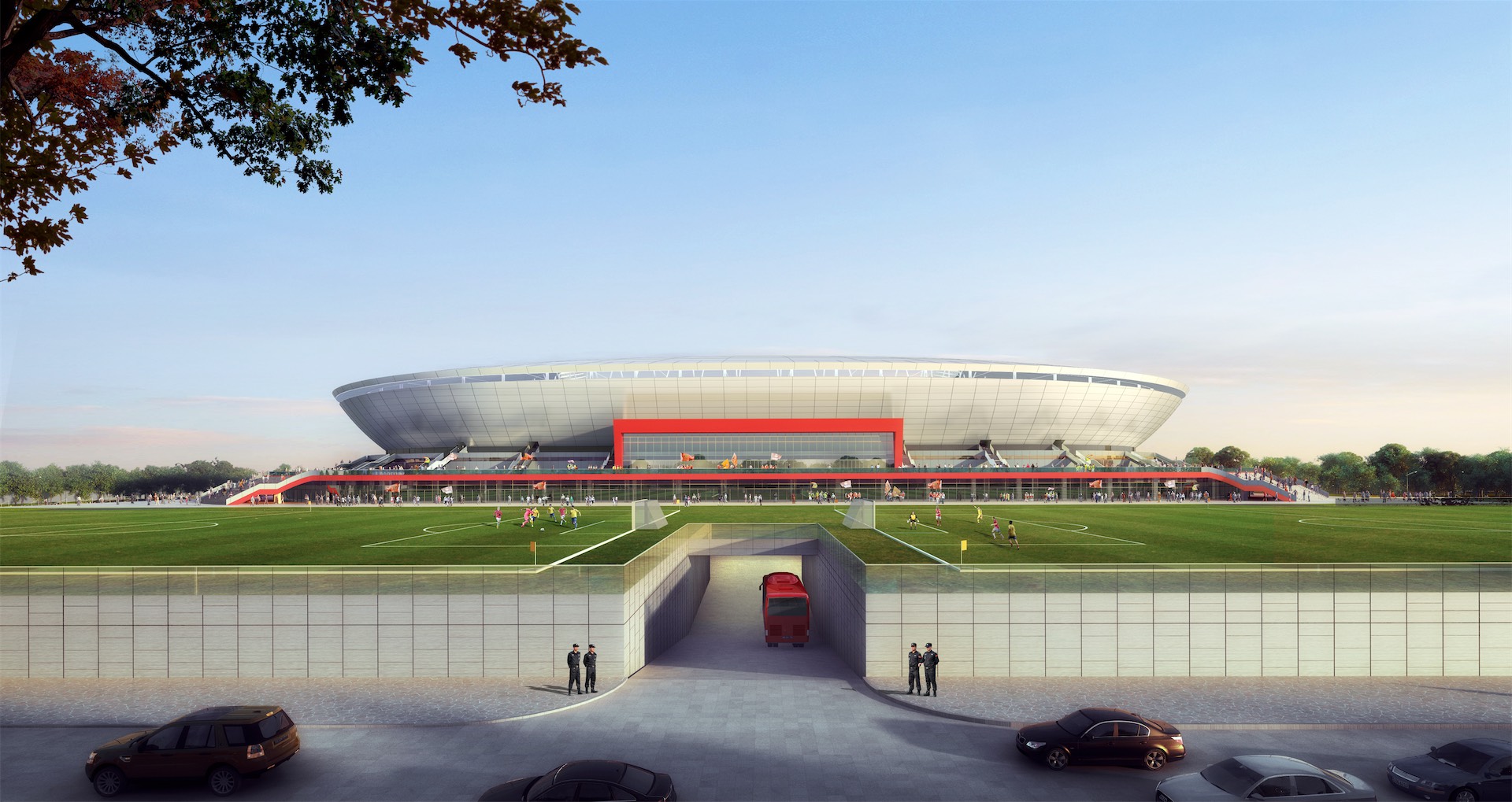 项目一层采用可以呼吸的建筑外衣,从象征体育竞技胜利光环的橄榄枝抽象出的枝叶形态,组成体育场立面的幕墙单元,通过120组电动智能开启系统进行感光控制。球场包厢层分别设置有普通球迷包厢、赞助商包厢和Party BOX,满足不同层次的观众需求,以比赛为媒介,重构都市社交文化。