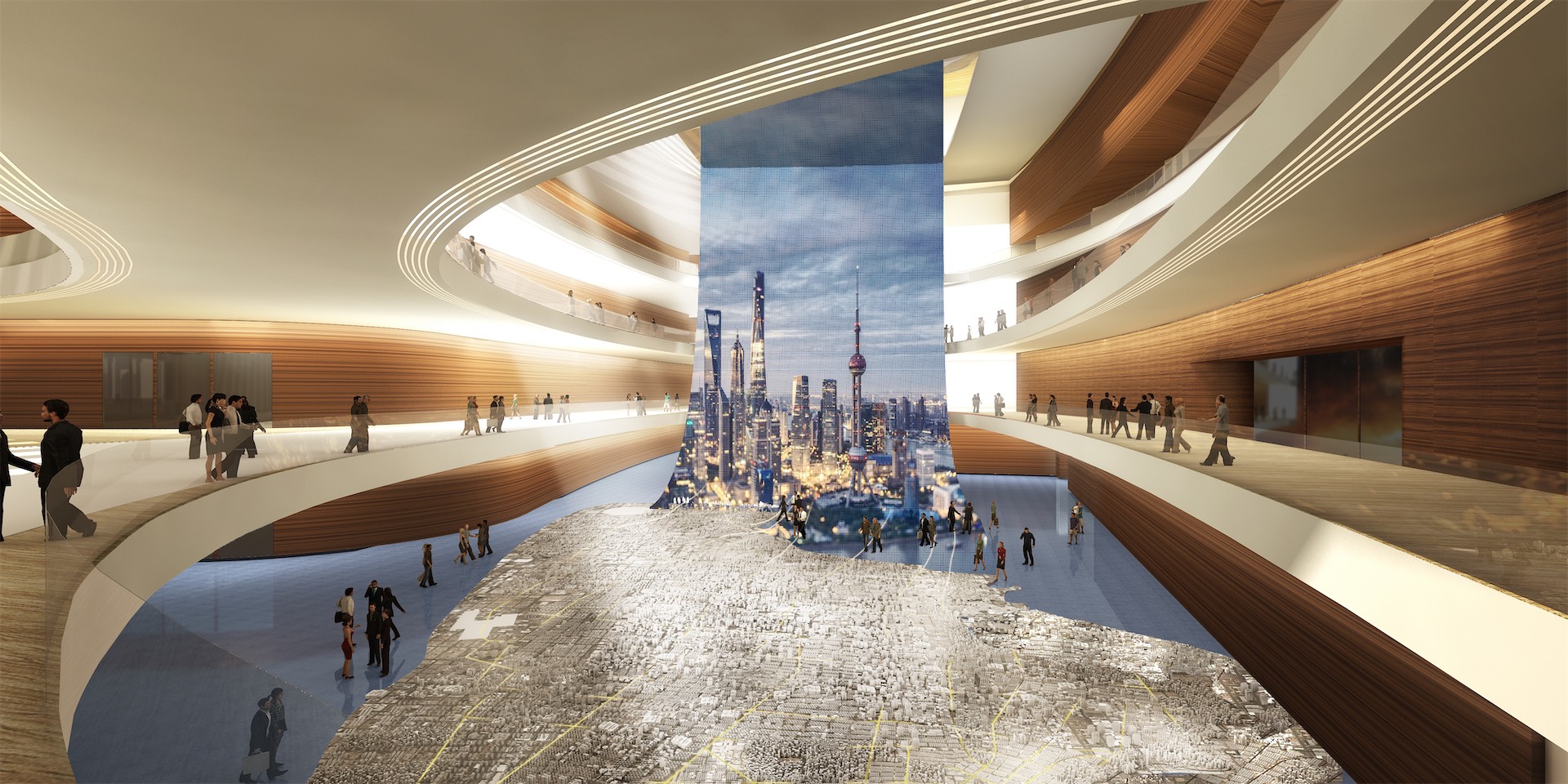 将浦东的沙盘模型置于整个建筑的中央大厅中,大厅顶部采光窗在大厅中形成丰富的光影变化、上卷的数字化屏幕和灯光效果,共同营造出梦幻般的展示效果。立体的数字沙盘和平面的实体沙盘结合起来,可多维呈现未来的浦东城市规划。沙盘置于中庭空间,也便于参观者在不同的标高上观看模型,形成丰富的层次体验。