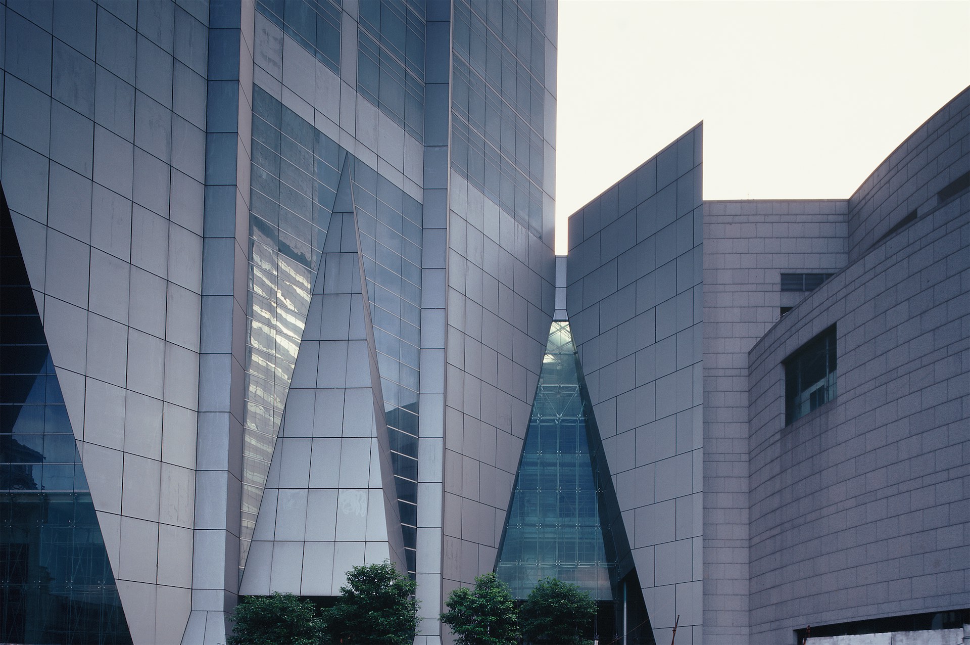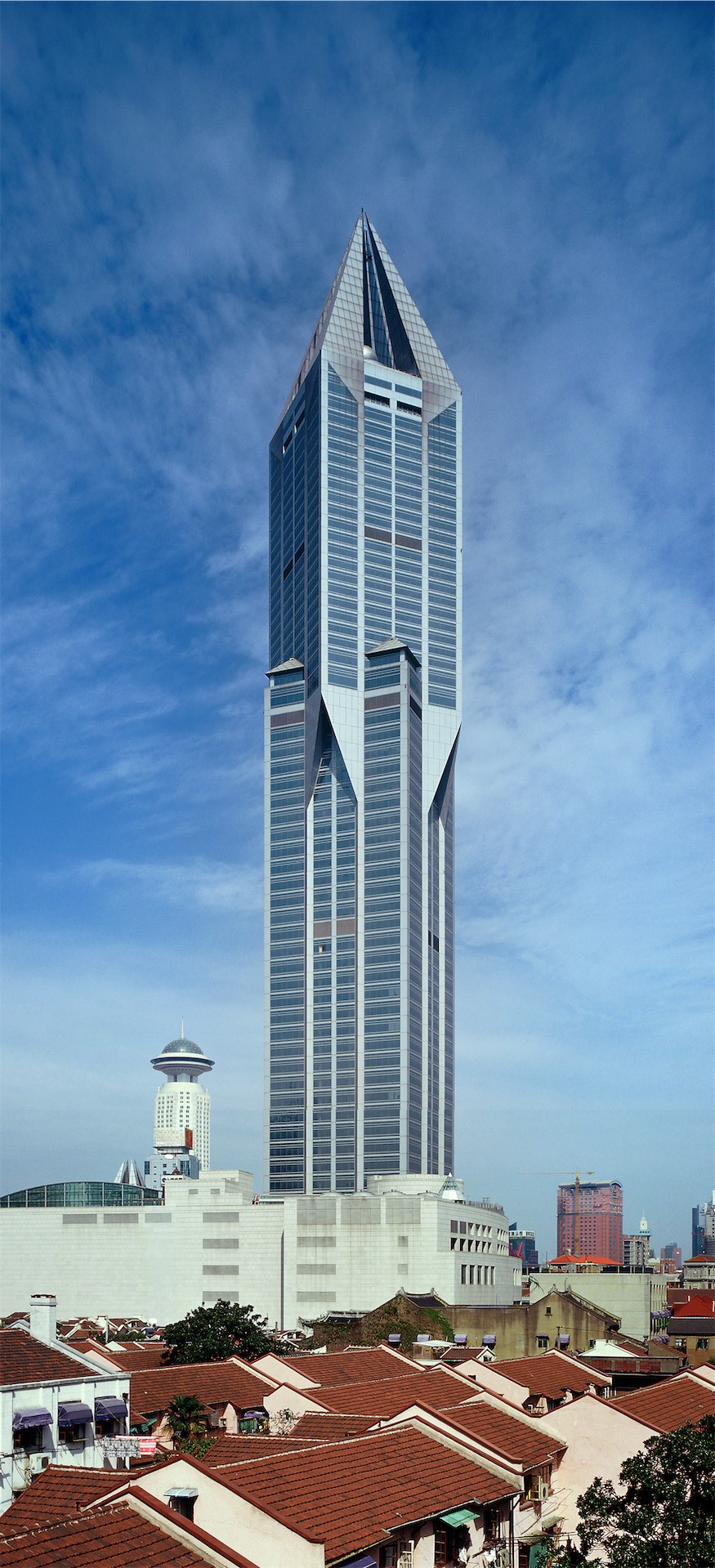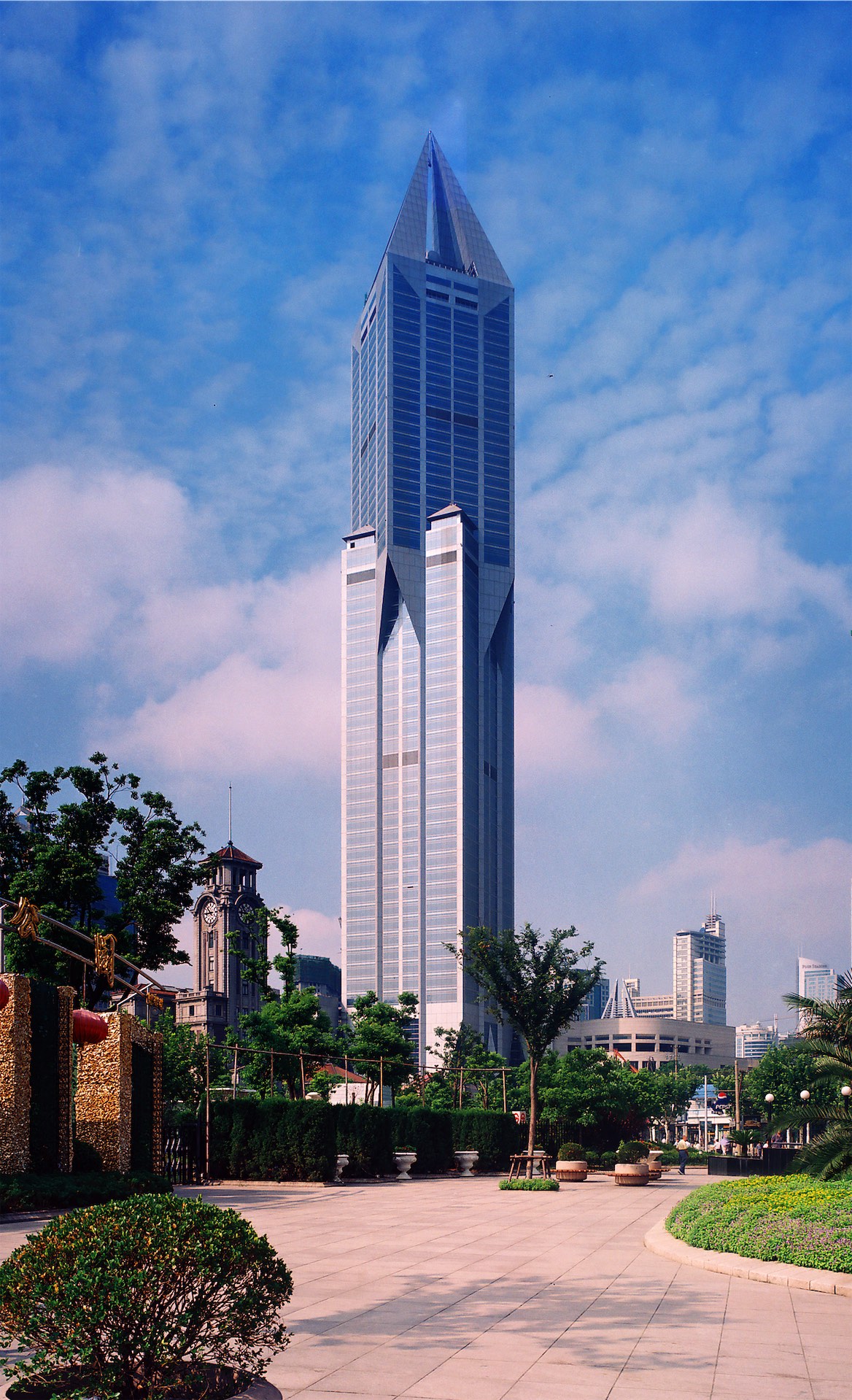 立面造型简洁、明快、新颖,由两个正方体平面45°交错重叠组成,顶部是52m高的锥形塔尖及圆球水箱.构成挺拔奇特的超高层形象,有较强的标志性和识别性结构为框架一核心筒、40层以上为无梁楼盖、顶部为钢结构。