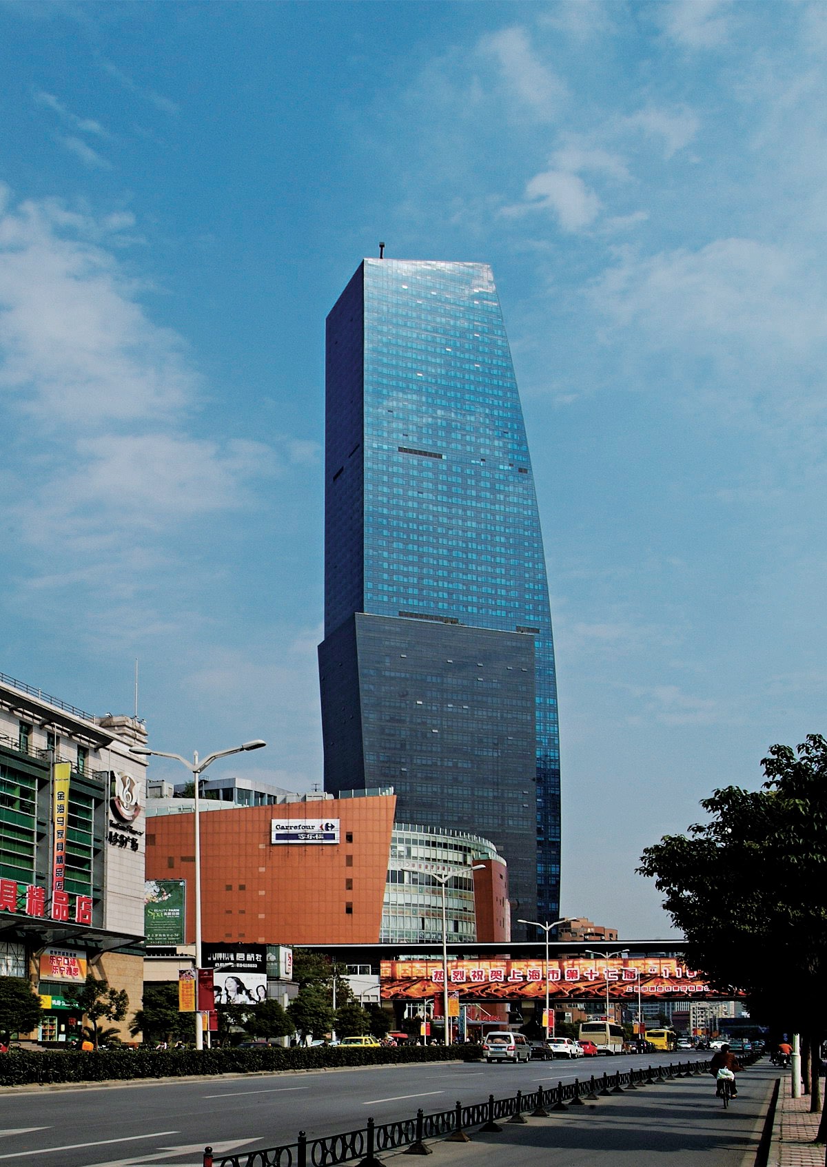 该建筑为大型商业综合体建筑,10层裙房主要为购物中心,办公(13-23层)和酒店(24层以上,客房745套)部分叠加形成一幢近240米高的超高层主楼,面向城市中心的方向,一条弧线由底至顶勾划出宏伟气势。整个商场也呈弧形平面,商场设计以简洁单一的环形流线使大量的人流均匀地遍及商场的每个角落,外立面由玻璃和三块旋转向上的弧形金属墙面组成。