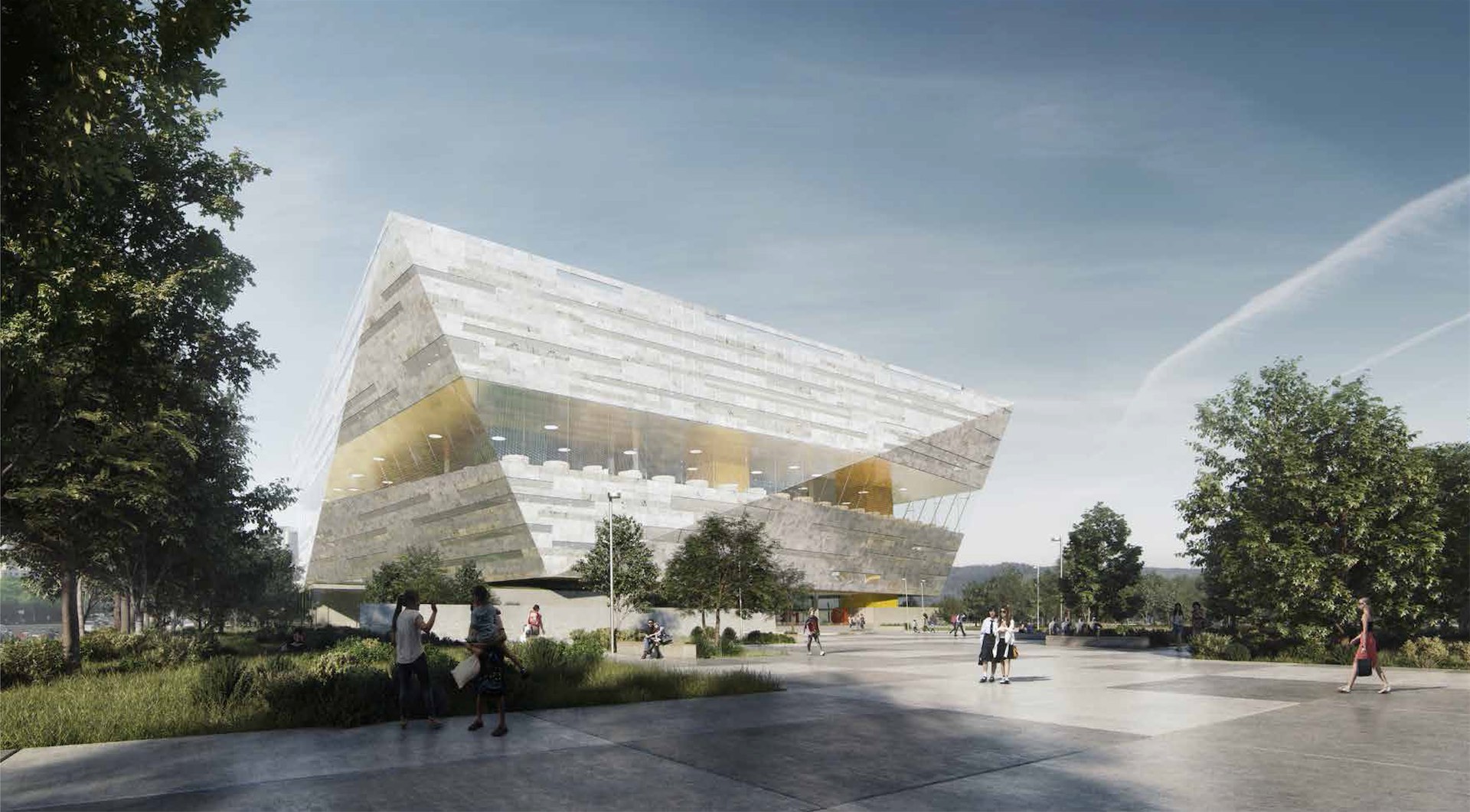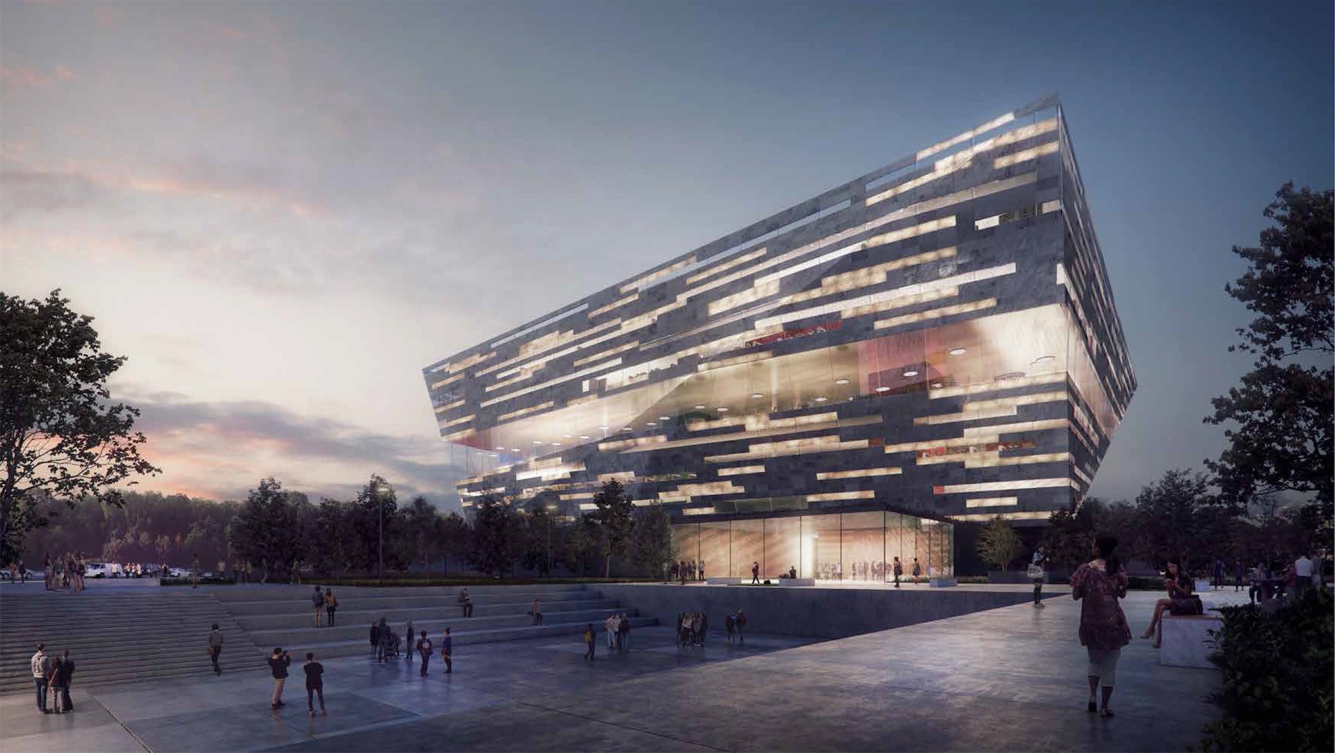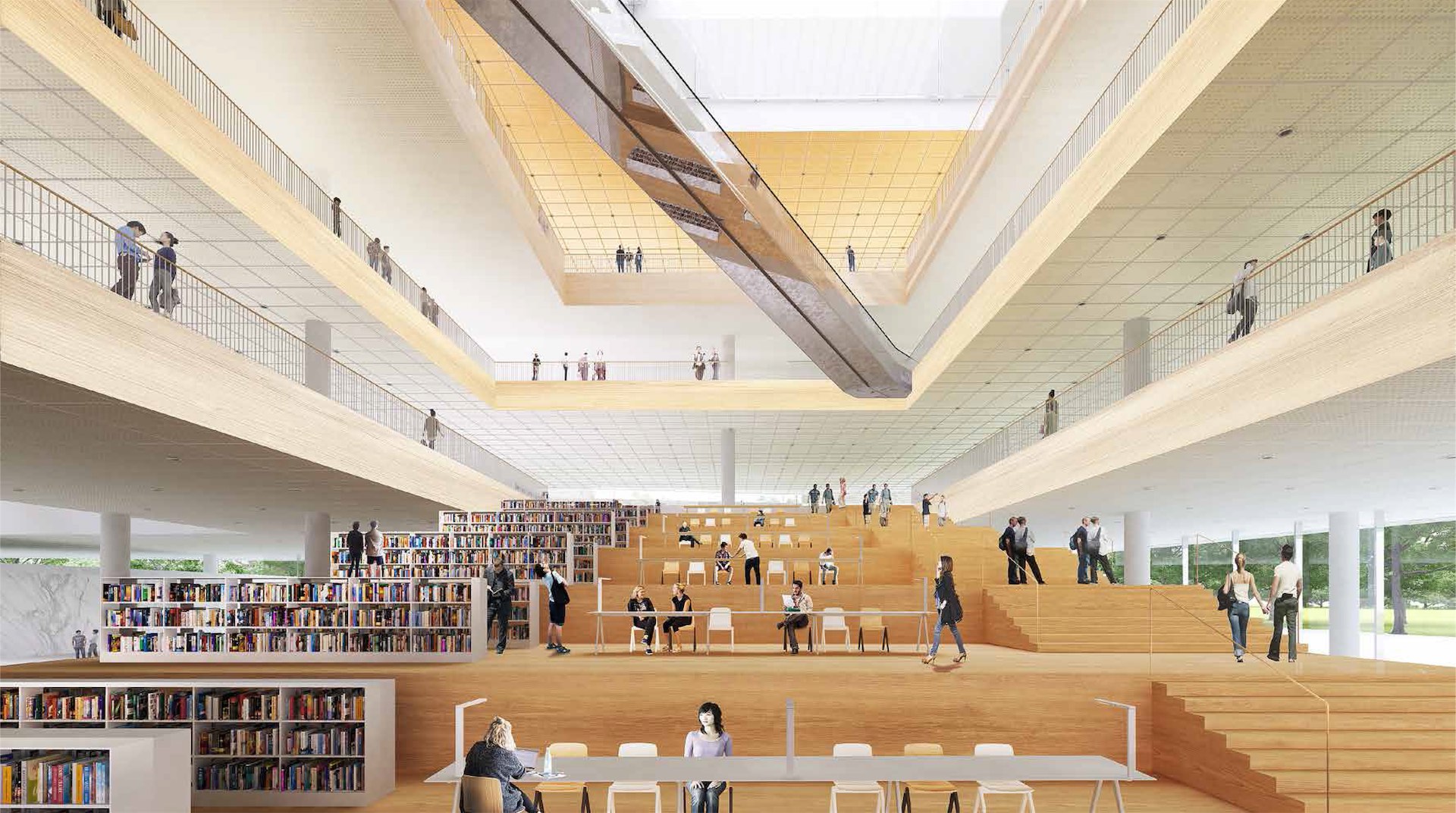 上海图书馆东馆项目位于花木城市副中心,是上海市级图书馆新馆。项目区别于仅仅作为藏书功能的传统图书馆,着重研究如何打造一个“知识交流共同体”,一个用于阅读、学习、会面、聚集的场所。设计旨在将新图书馆打造成一个为上海及浦东市民提供的服务系列公共开放空间。建筑由一系列的开放型市集空间相互堆叠而成,将阅读空间以一种简明的方式在垂直方向堆叠起来,由一个大型中庭组织起错落的开放式阅览空间,它们连接着图书馆的不同功能区域,并分别拥有着不同的景观视野——东向世纪公园、南向图书馆公园,以及西北向的城市空间。结构主楼地上部分采用16.8mx16.8m柱网,外围一圈悬挑尺寸最大16.8m。