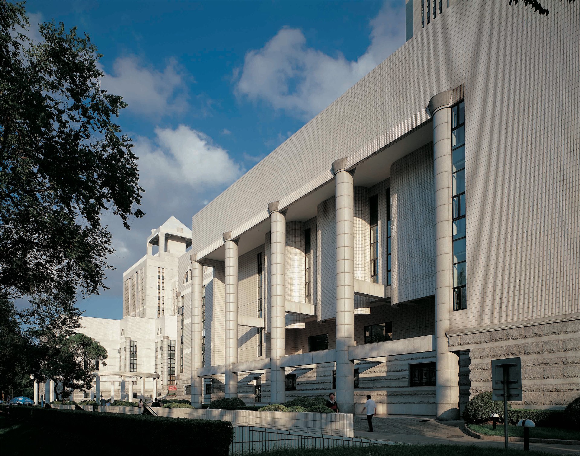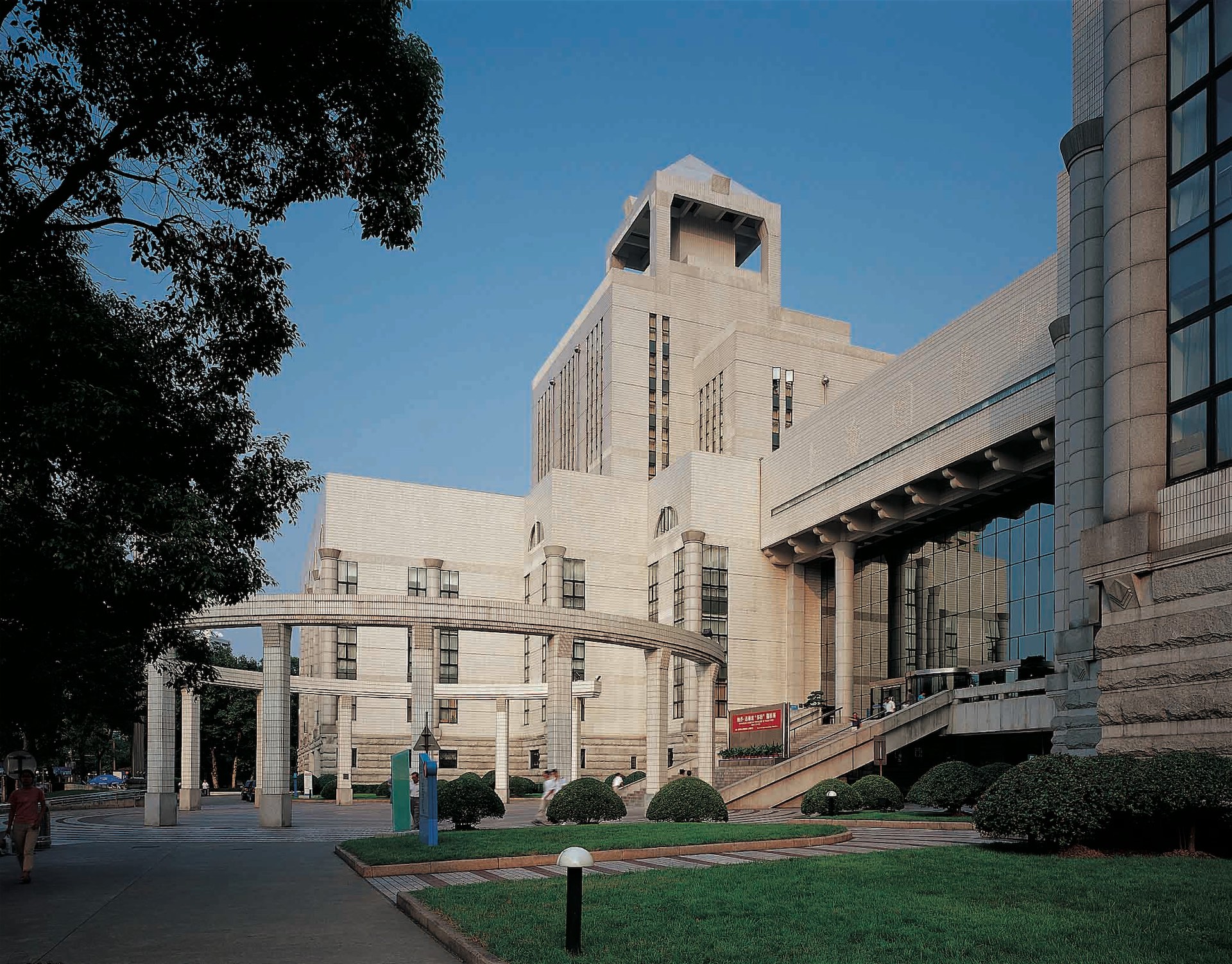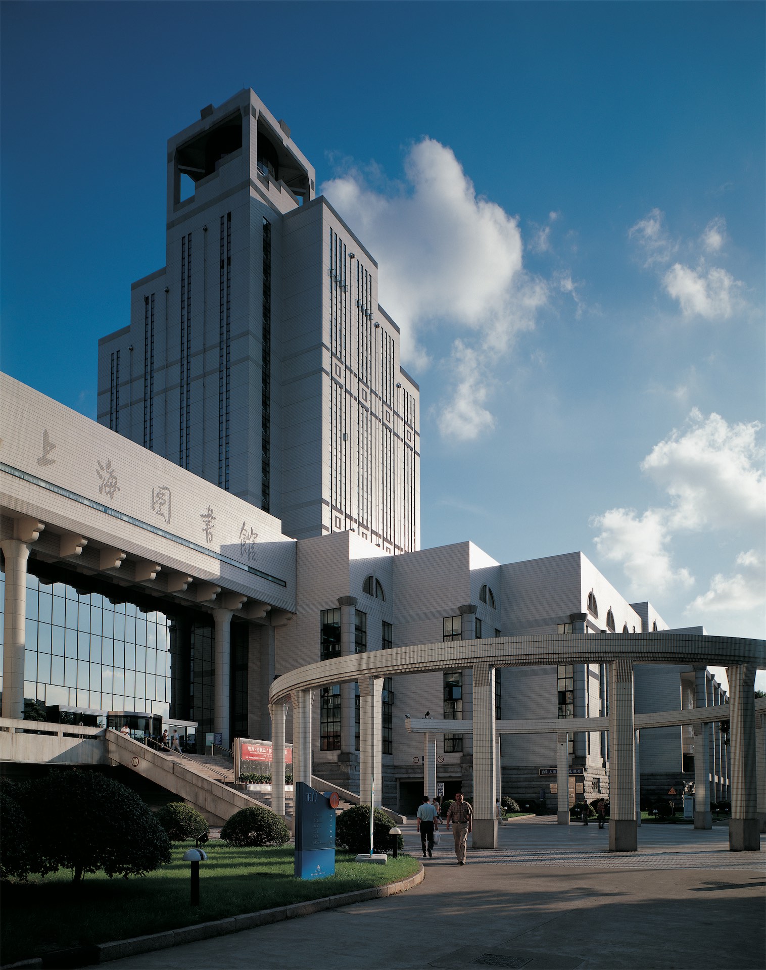 上海图书馆是上海标志性文化建筑之一,其规模进入世界前列,藏书达1320万册,阅览座3000余座。该馆具有现代化功能,反映上海特有的兼容中西的文化特色。建筑主入口和西入口处分别设“知识广场”和“智慧广场”,沿路设斜坡绿化,南面为大花园,环境优雅、宁静。该馆布局紧凑、流线清晰,中部为安静的阅览区,其西侧环绕中庭布置20多个大型开架阅览室,东侧在江南庭园周围是古籍、近代资料阅览室、研究室等。从西门厅可进入展厅、报告厅、视听室等区域。建筑造型立足于上海的城市文化,底层的毛石外墙稳重厚实,顶部多维合阶组合象征对知识的攀登,新颖典雅、具有上海建筑特色。设备配置达国际先进水平,竖向运书采用自走小车系统。