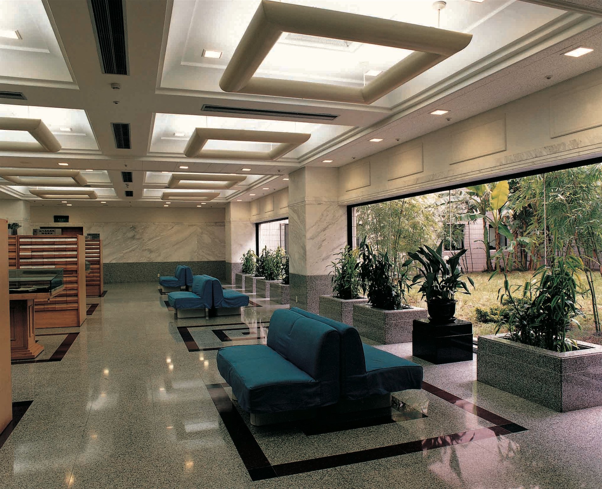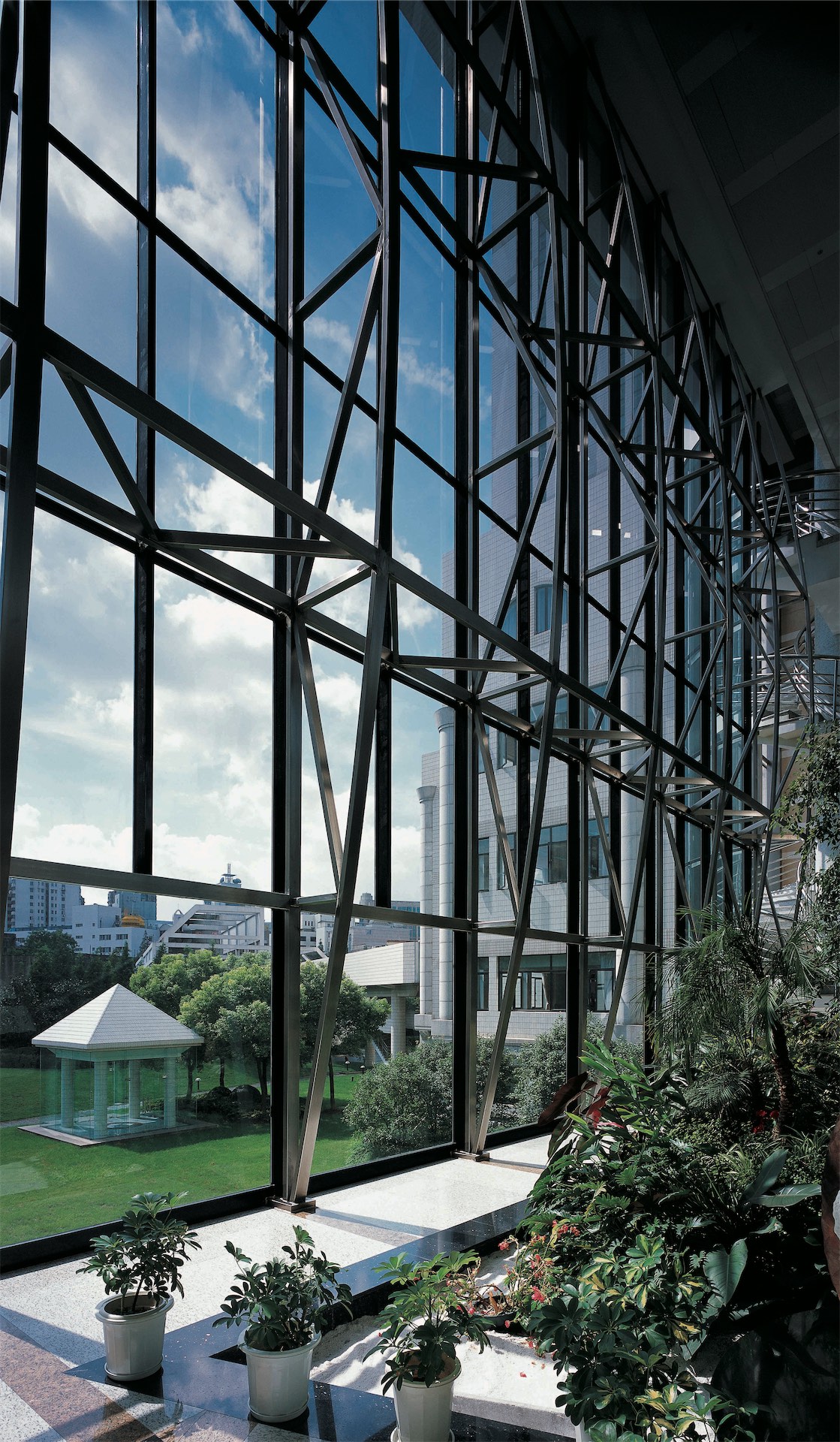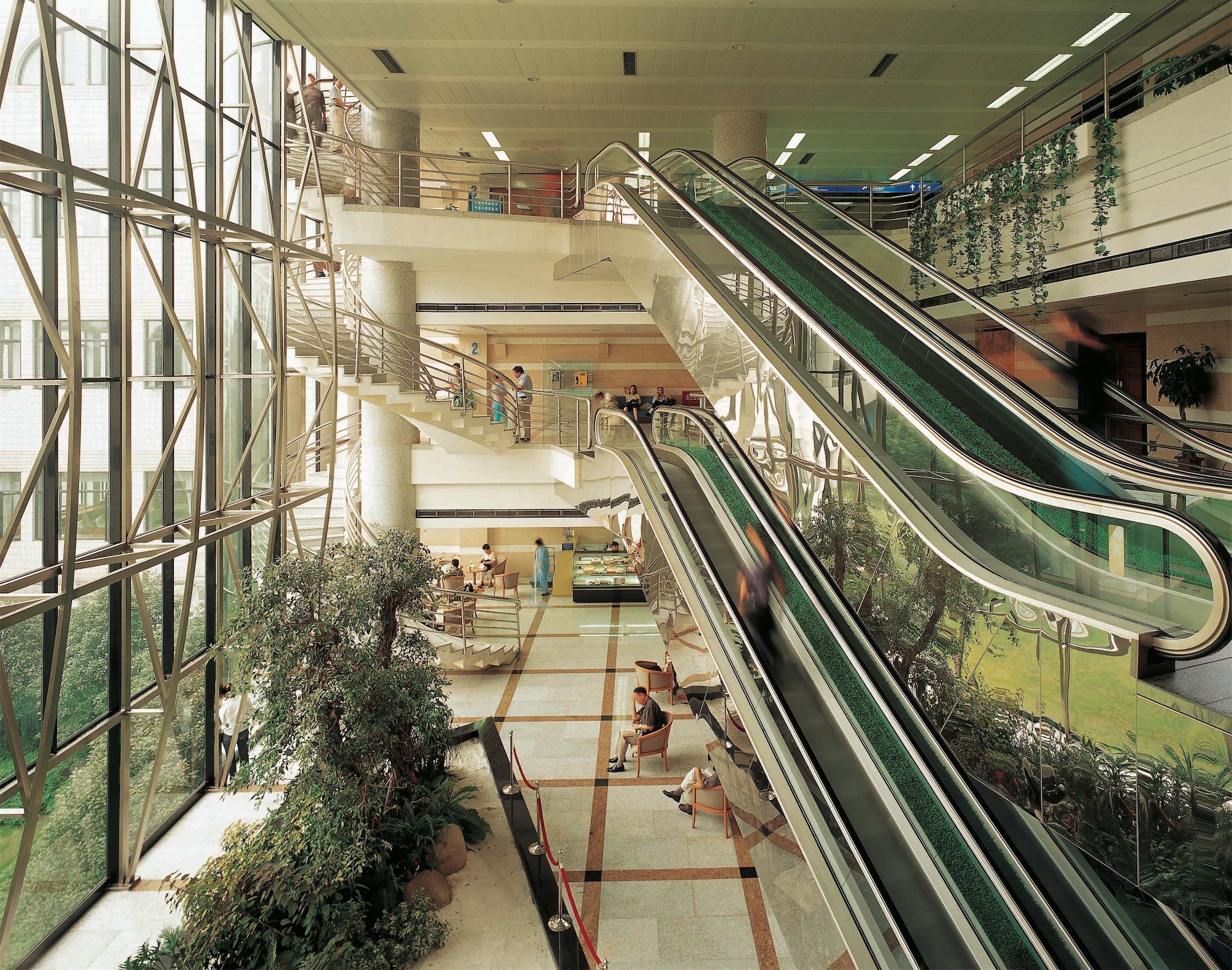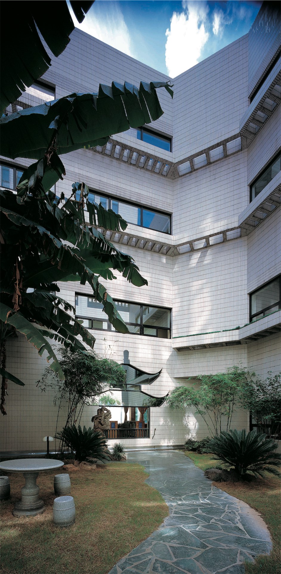 上海图书馆是上海标志性文化建筑之一,其规模进入世界前列,藏书达1320万册,阅览座3000余座。该馆具有现代化功能,反映上海特有的兼容中西的文化特色。建筑主入口和西入口处分别设“知识广场”和“智慧广场”,沿路设斜坡绿化,南面为大花园,环境优雅、宁静。该馆布局紧凑、流线清晰,中部为安静的阅览区,其西侧环绕中庭布置20多个大型开架阅览室,东侧在江南庭园周围是古籍、近代资料阅览室、研究室等。从西门厅可进入展厅、报告厅、视听室等区域。建筑造型立足于上海的城市文化,底层的毛石外墙稳重厚实,顶部多维合阶组合象征对知识的攀登,新颖典雅、具有上海建筑特色。设备配置达国际先进水平,竖向运书采用自走小车系统。
