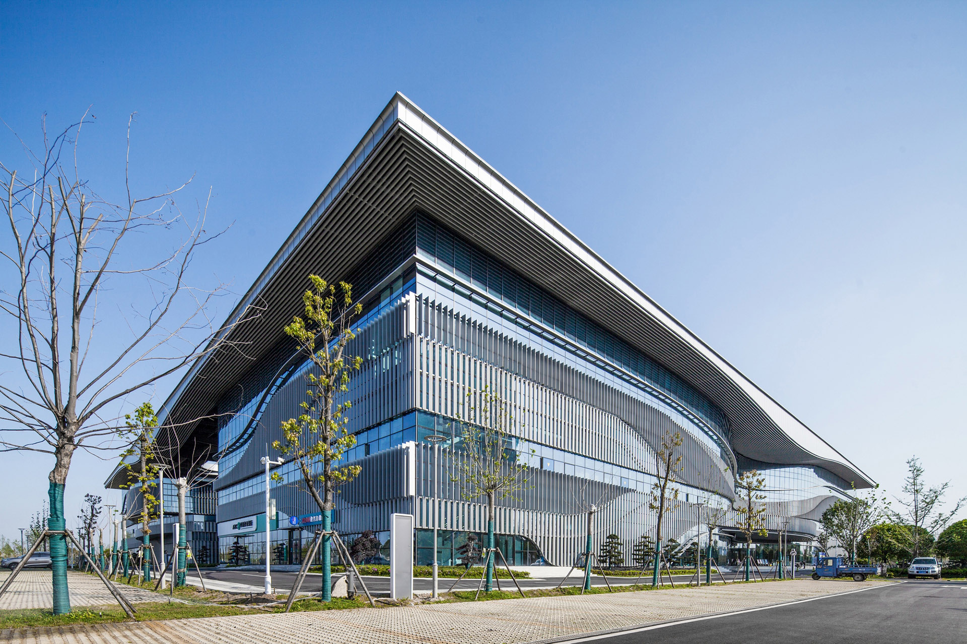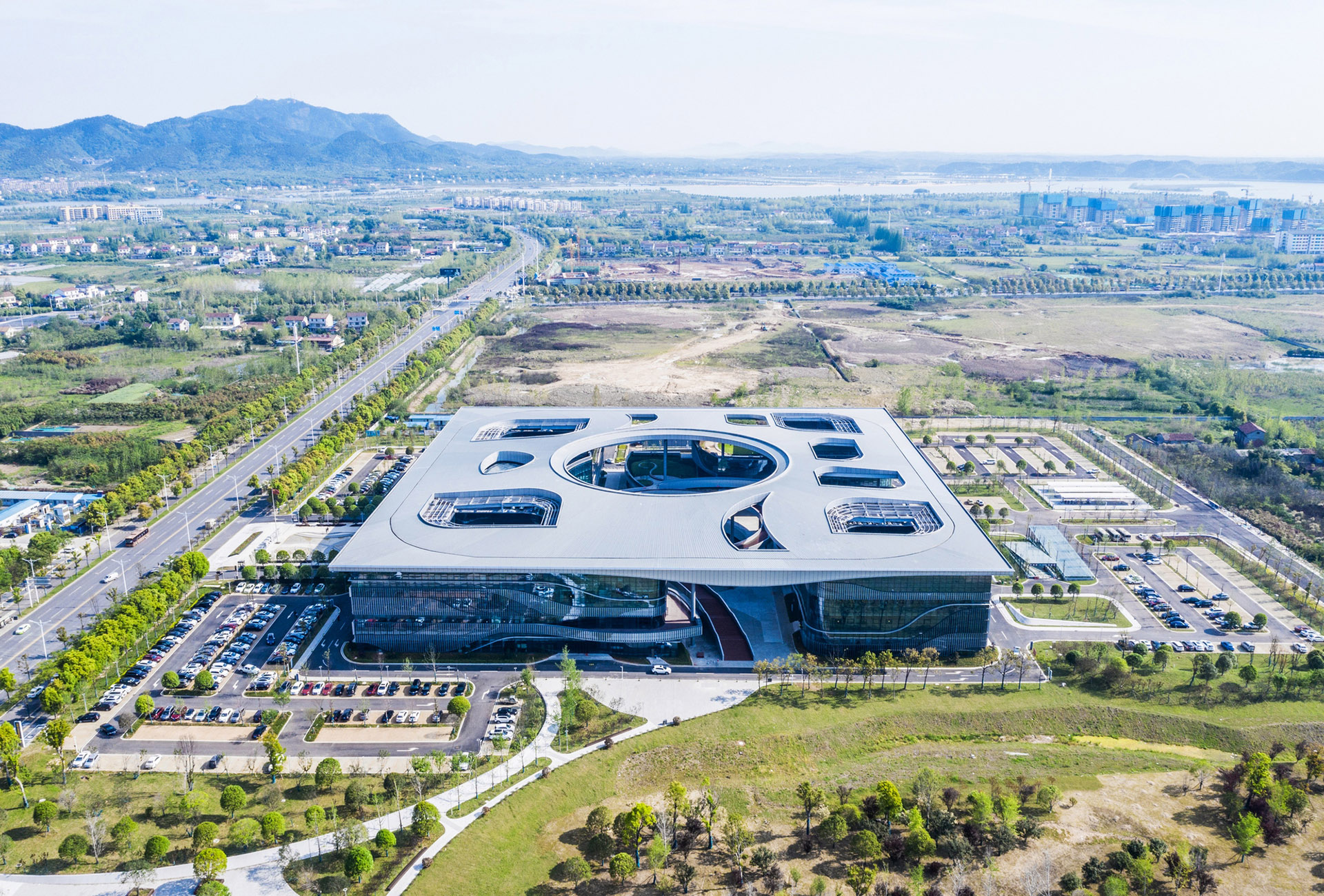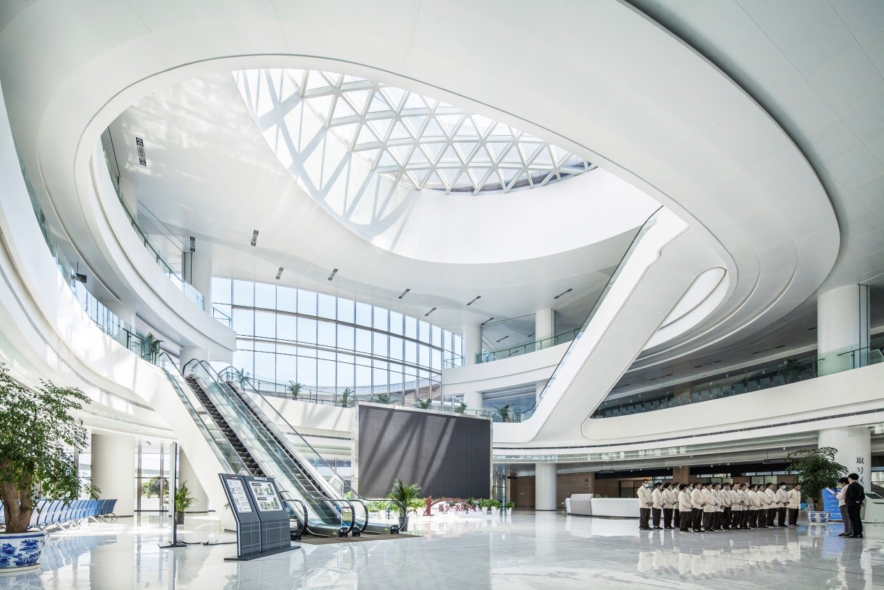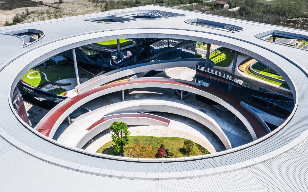 设计中弱化建筑和环境的界面,将市民之家“三中心”整合为一体的同时,建筑面向环境的界面自然渗透,优美公园沁入建筑内部。中央庭院庭院多个平台、坡道形成多层次的交流,塑造桃花源般别有洞天的内部花园。立面虚实相间,遮阳百叶构成写意山水的柔曲线条,是常德柔美山水的视觉表现。金属屋面上数个花瓣形内院围绕中央庭院,仿佛花瓣飘落于屋面,将桃花源的概念贯彻到设计的每个方面。