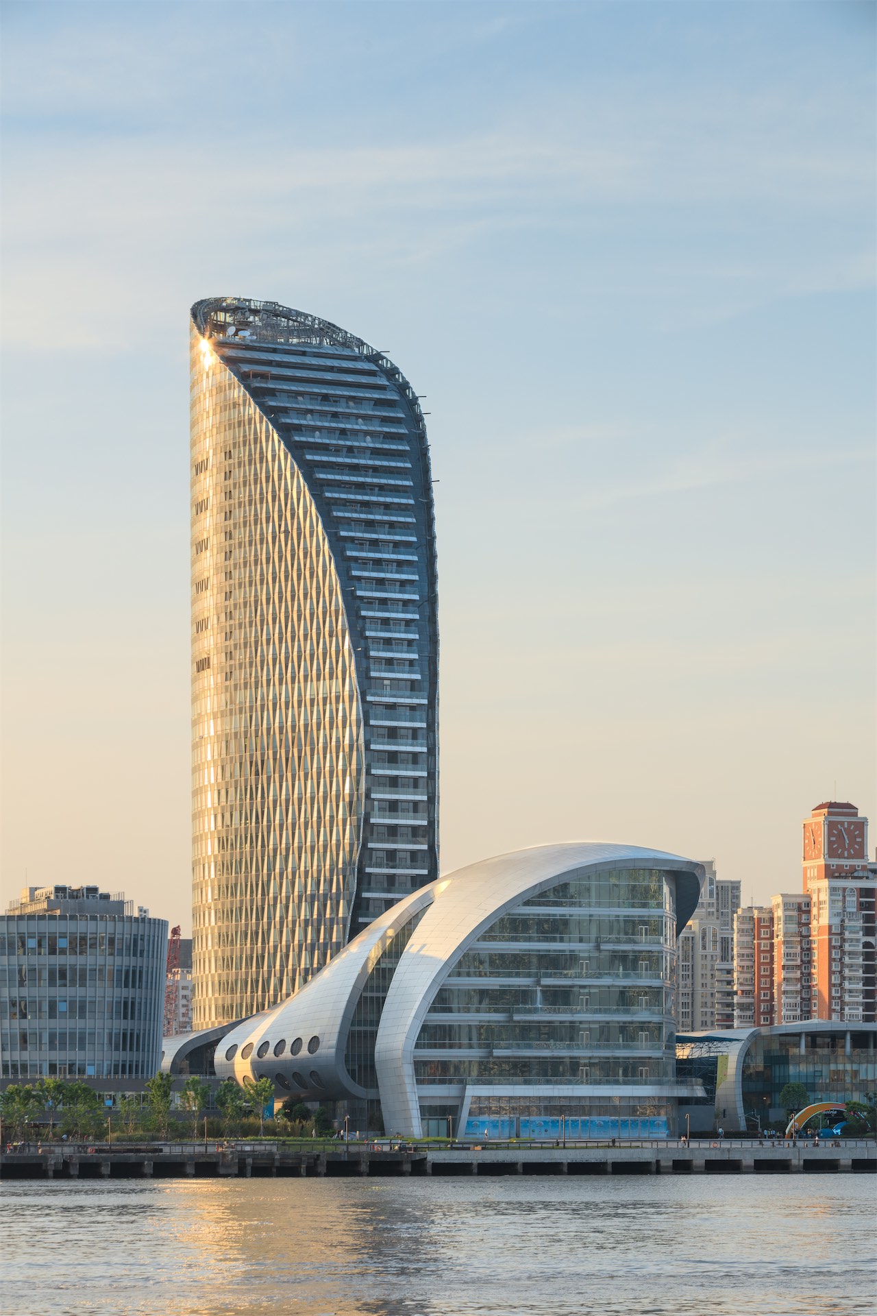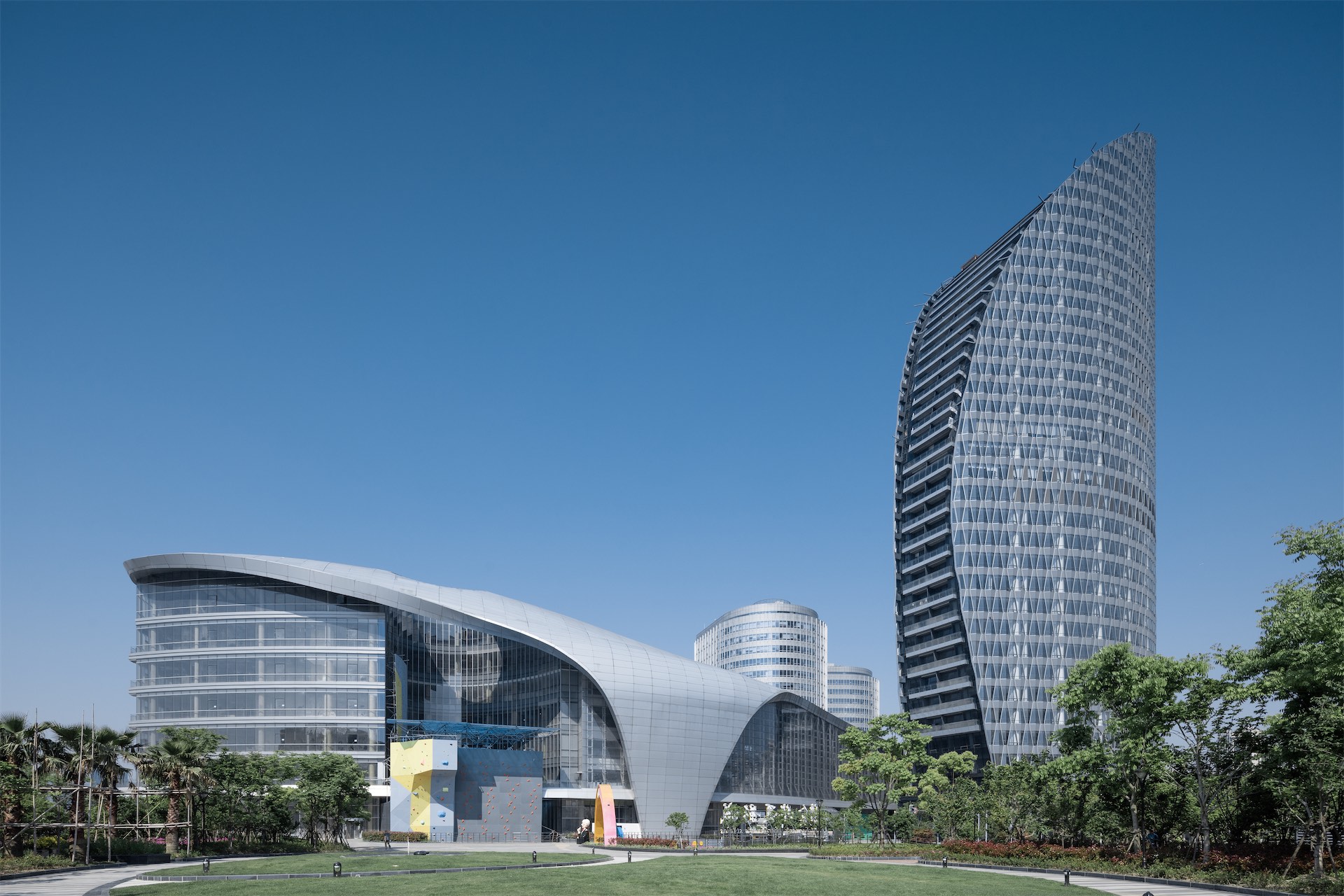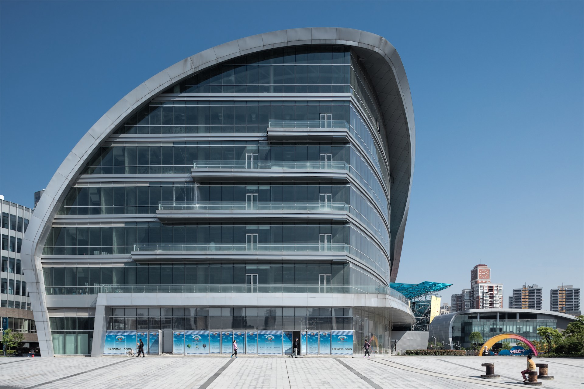 项目中主要布置有办公综合楼、鱼形商业综合楼、特色购物广场。7 层的鱼形商业综合楼称为“游鱼”,横跨规划道路,将城市与新开发的浦江水景相连。办公综合楼称之为“立鱼”,直接与综合鱼市场相连。整个建筑灵动的形态,形成了独特的滨水形象地标。