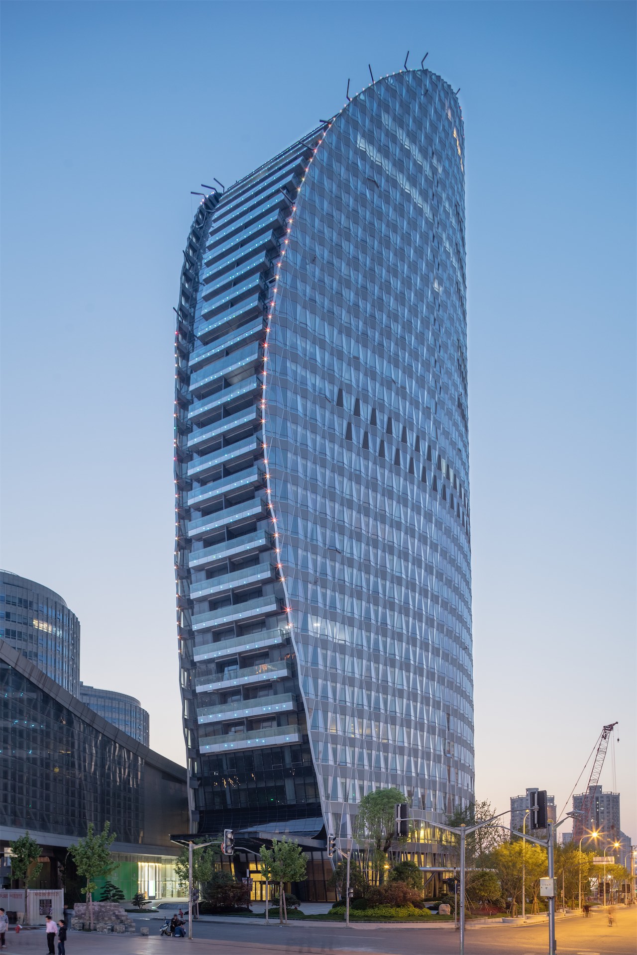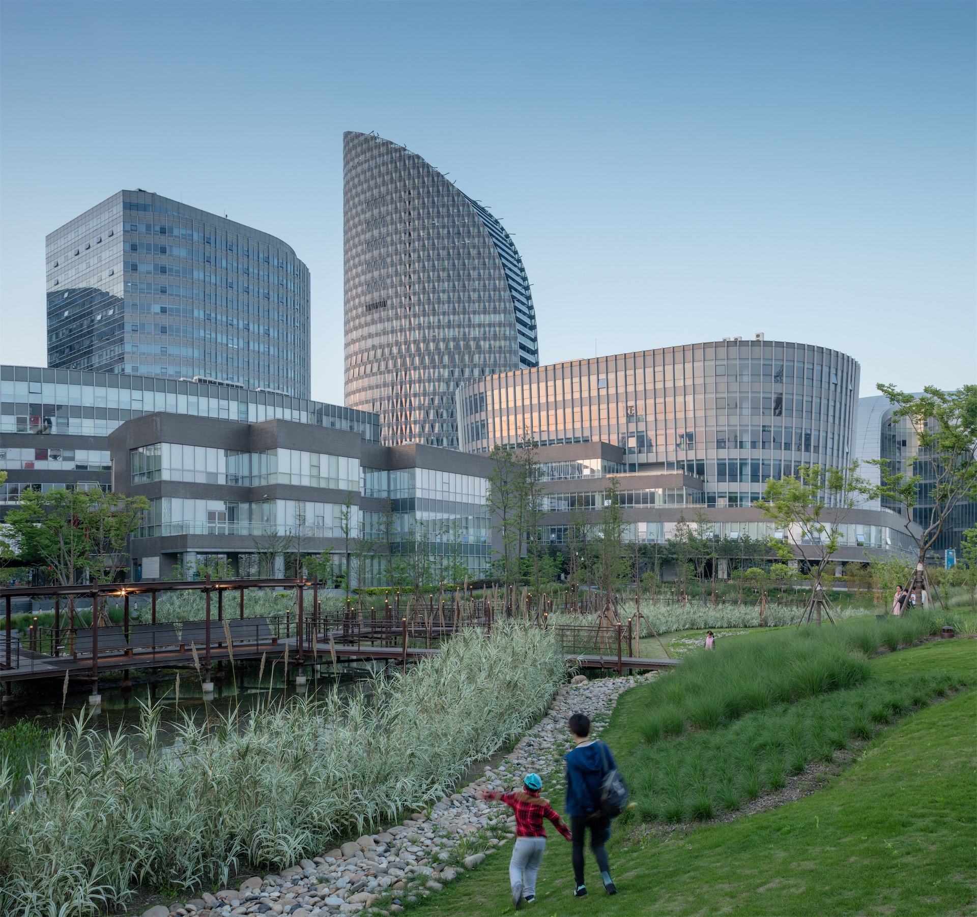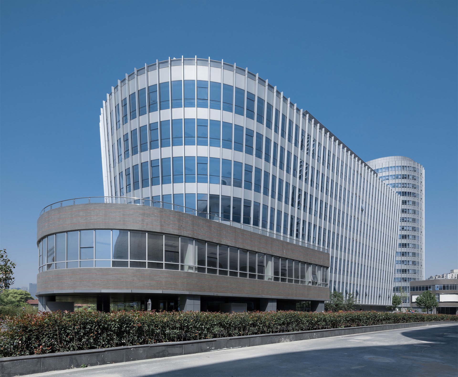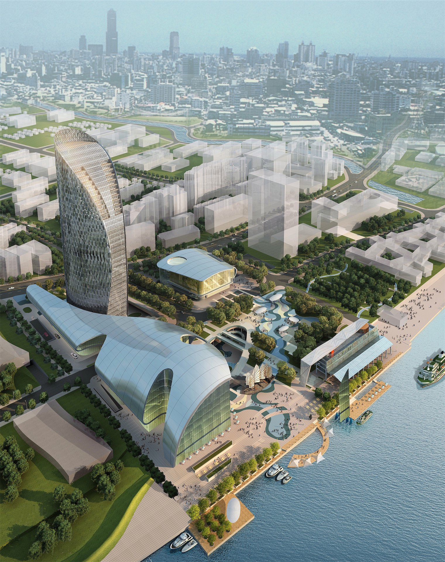 项目中主要布置有办公综合楼、鱼形商业综合楼、特色购物广场。7 层的鱼形商业综合楼称为“游鱼”,横跨规划道路,将城市与新开发的浦江水景相连。办公综合楼称之为“立鱼”,直接与综合鱼市场相连。整个建筑灵动的形态,形成了独特的滨水形象地标。