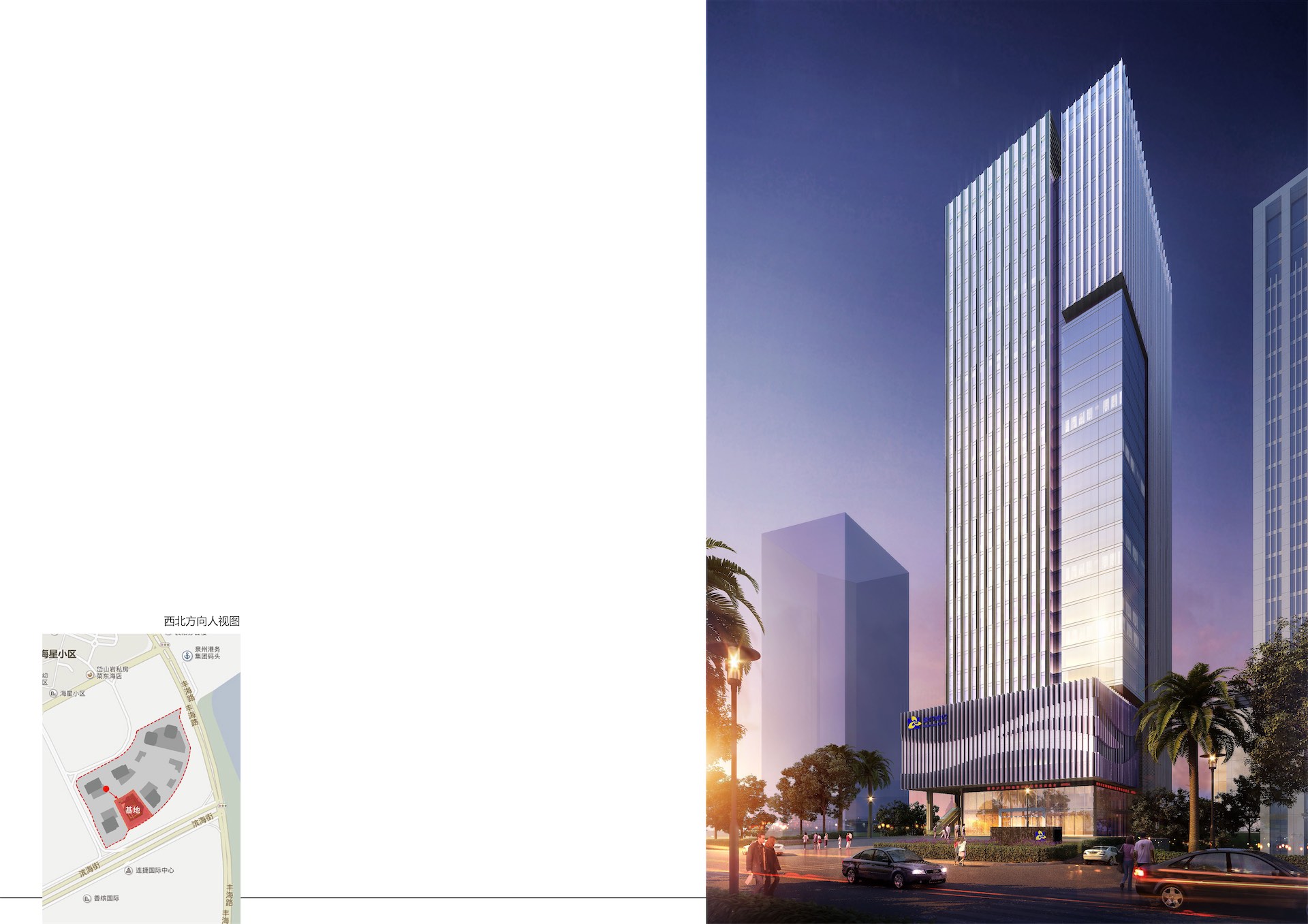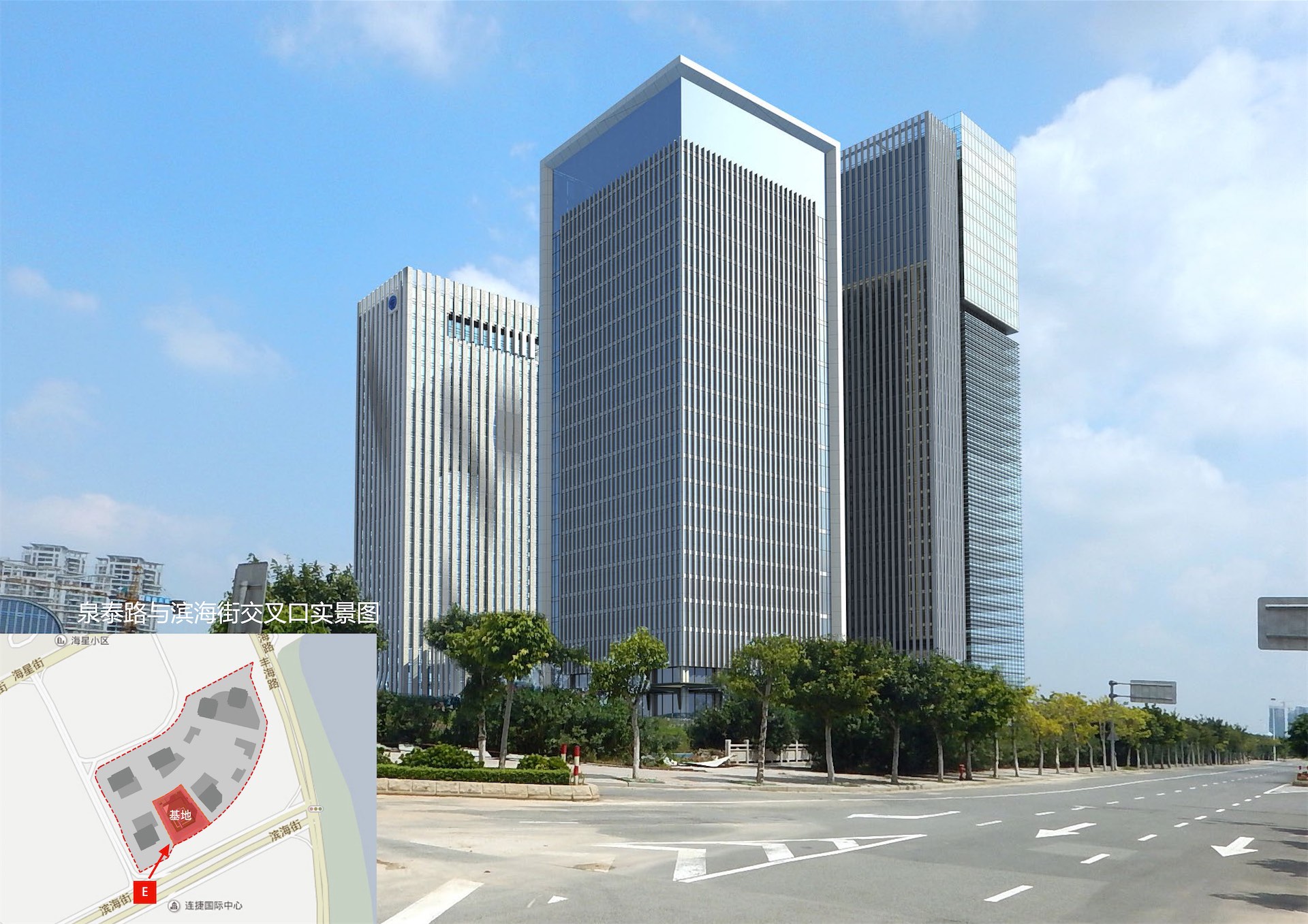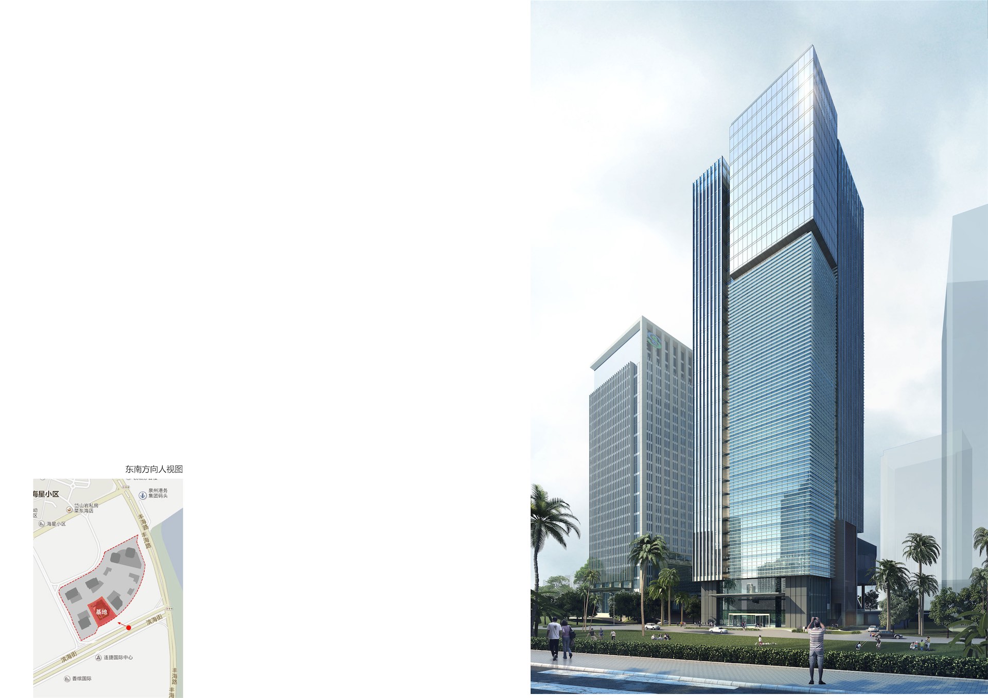项目位于泉州东海片区总部经集聚区内。地块毗邻市政府行政、文化中心轴线以及综合商业中心,靠近公交枢纽,为今后的开发建设提供了有利条件。本项目定位为以金融、商务办公为主要功能特征的超高层甲级智能写字楼。