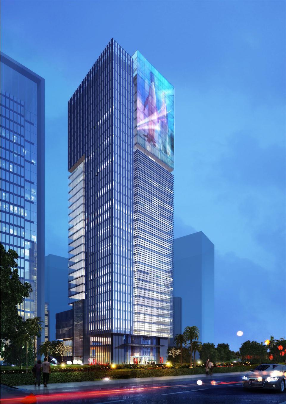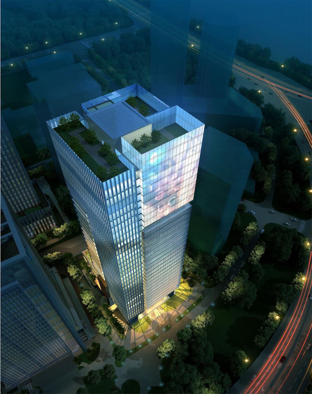 建筑顶部以玻璃幕墙为主要材质的通透体量,结合朝向东南海面的LED 展示屏,放射出璀璨夺目的光彩,犹如一座矗立于海岸线的城市灯塔,点亮金融企业办公航标,领航滨海金融中心的时代感与标志性。