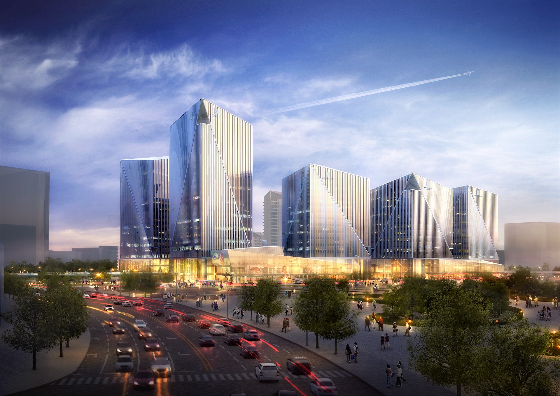 项目形态的塑造灵感取自水晶,力图捕捉水晶丰富多变的形态和晶莹剔透的质感,两栋塔楼通过旋转、对称的手法,展现建筑不同的立面形态,采用玻璃幕墙和竖向金属翼的组合实现功能与外形的完美平衡,并在沿立面对角线方向形成斜向金属翼,通过简单的方向扭转,打造疏朗多变的光影效果和视觉美感。