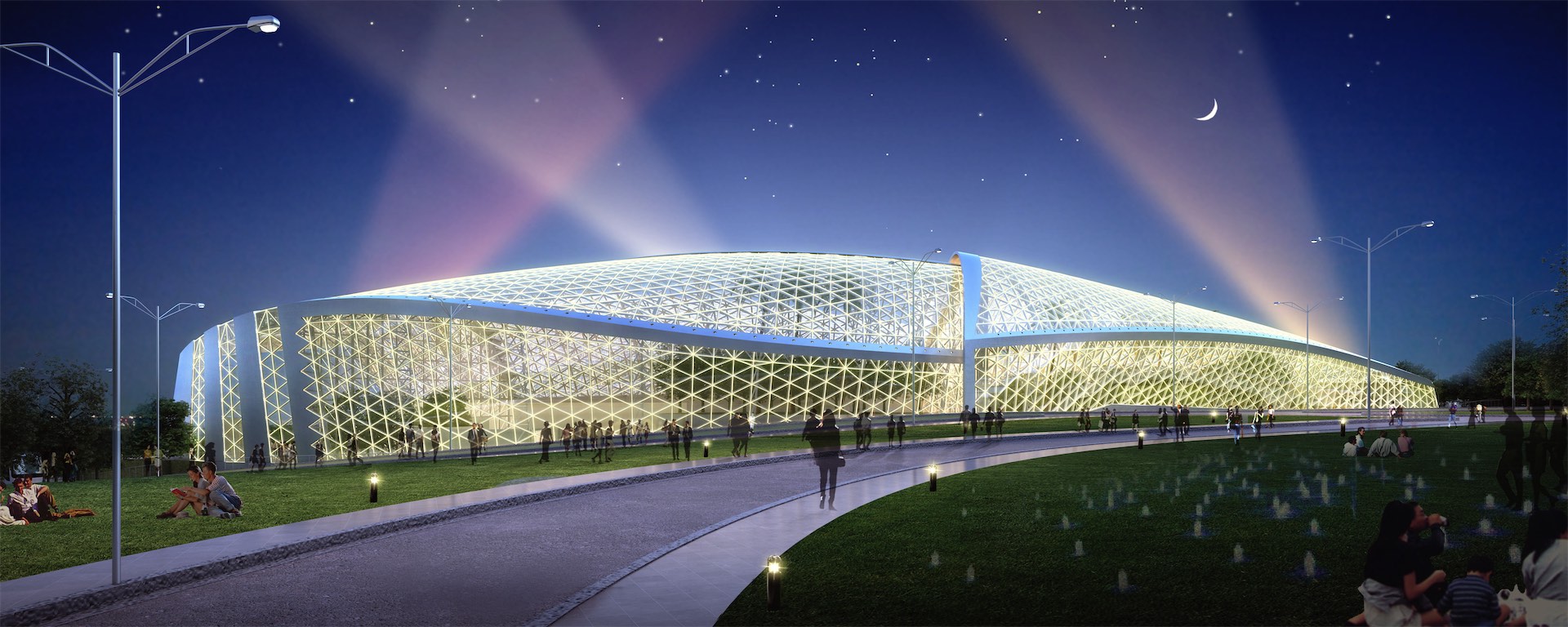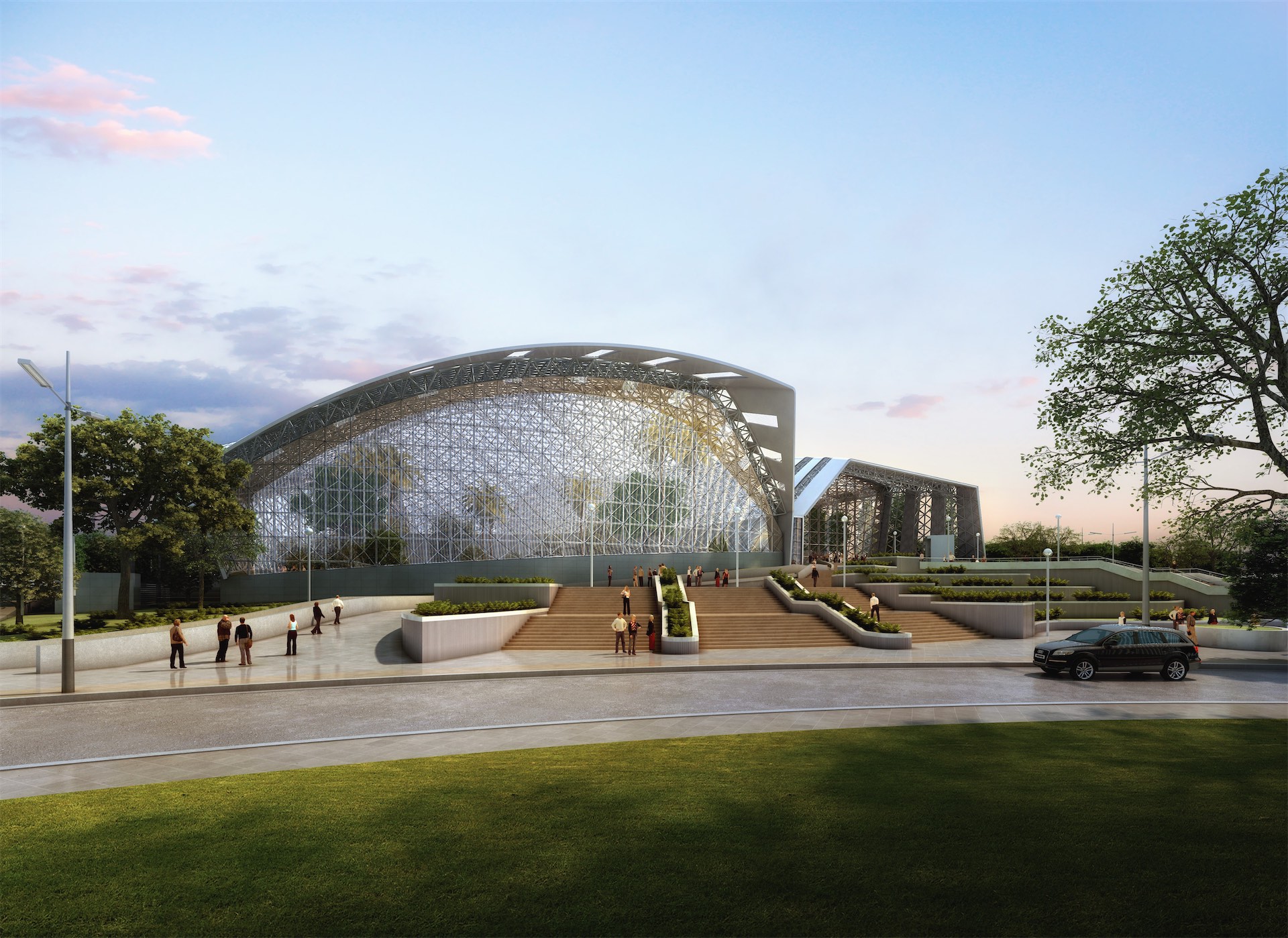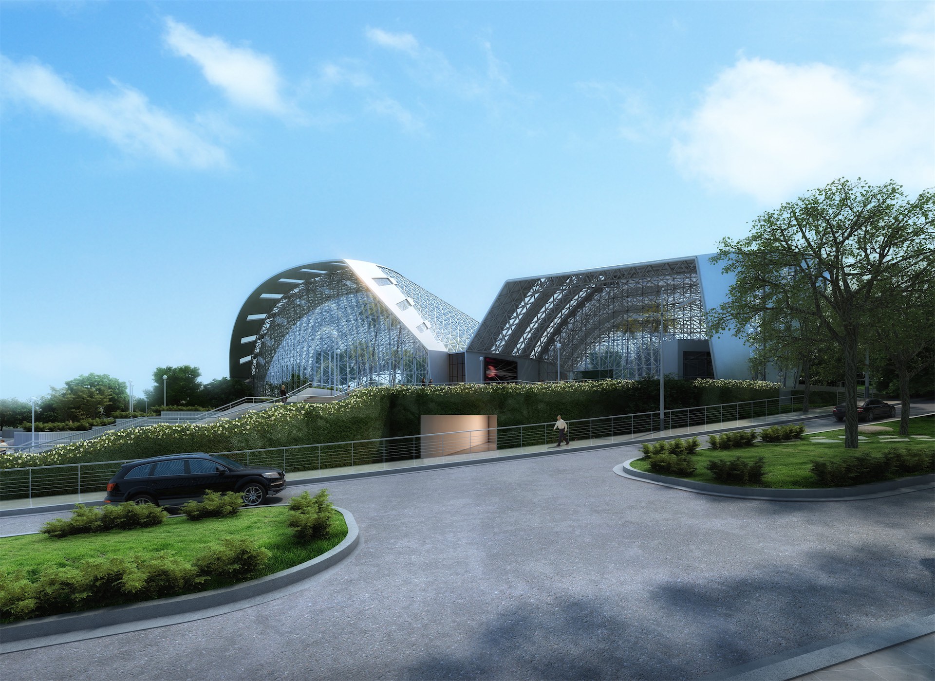 项目建在地形起伏非常大的山坡上。为体现建筑的标志性,且与群山协调,建筑造型为曲面形态。既充分利用了山地建筑特点,也使整个游览线路更加富有变化。同时,建筑的体量适应若干年后馆内高大乔木的生长空间的需求。