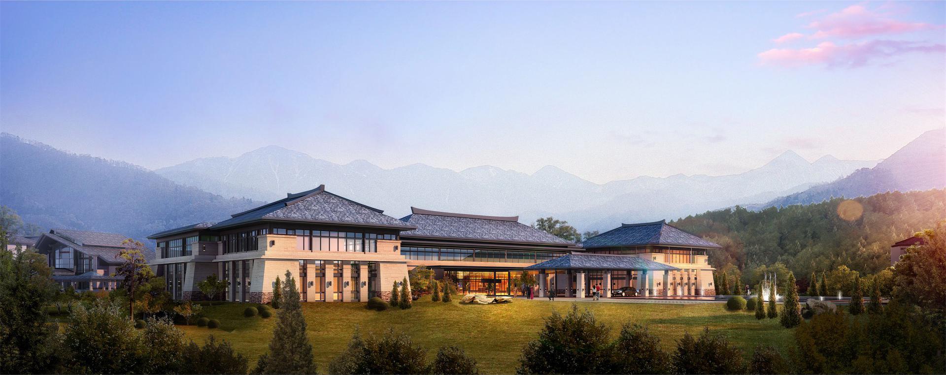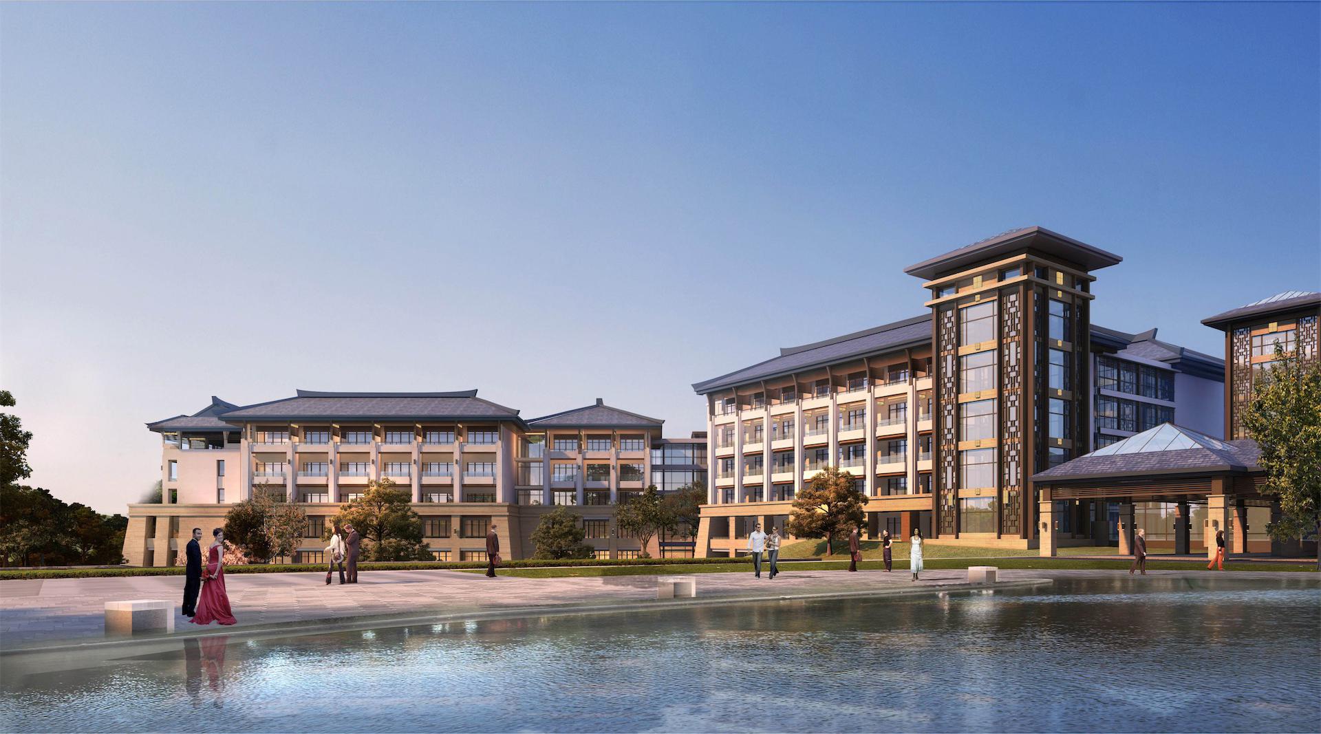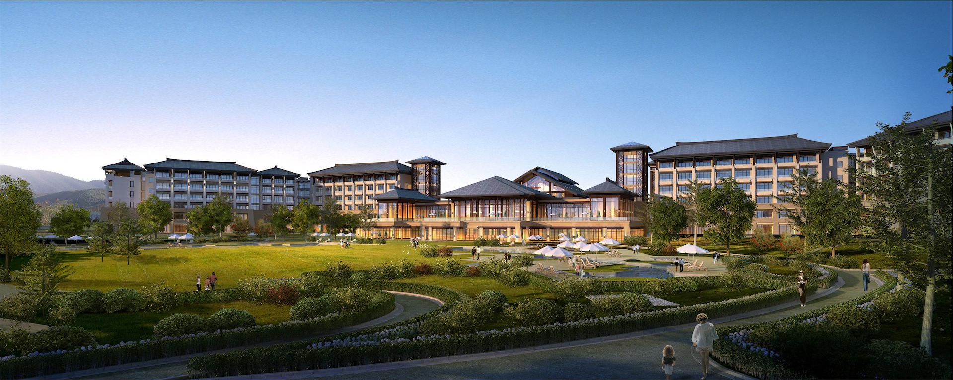 酒店主体面向自然山脉东西向舒展布局,北侧引入自然水系,建筑依水观山。内部采用庭院围合的形式,营造怡人尺度的庭院景观,步移景异。设计理念紧扣“人文”主题,根植地域建筑特色。外立面采用坡屋面造型,色彩古朴典雅。七字挑是当地民居檐口典型构件,通过檐口的细部设计,抽象地域特色的建筑符号,以体现当地建筑特色。