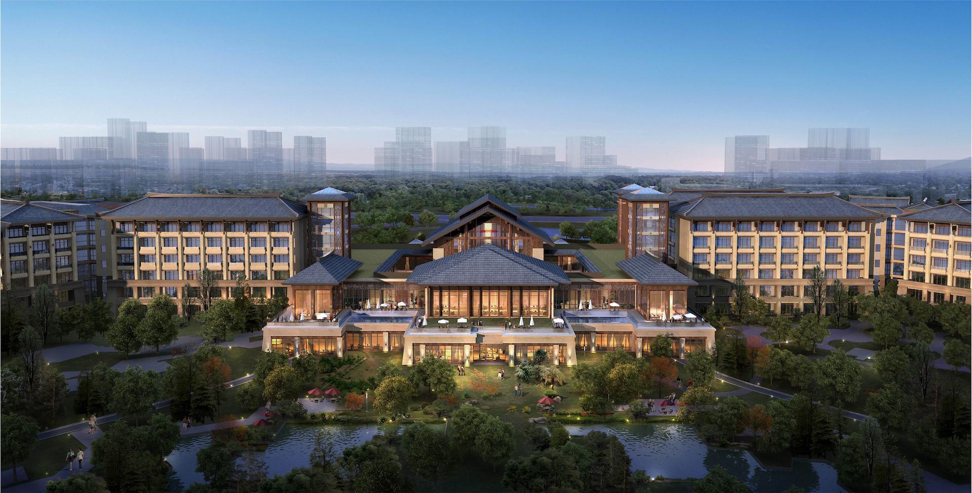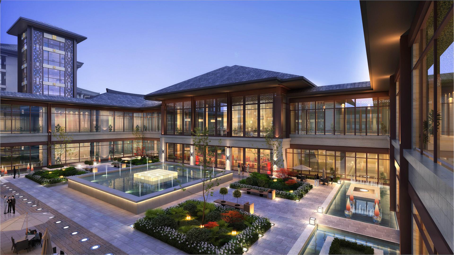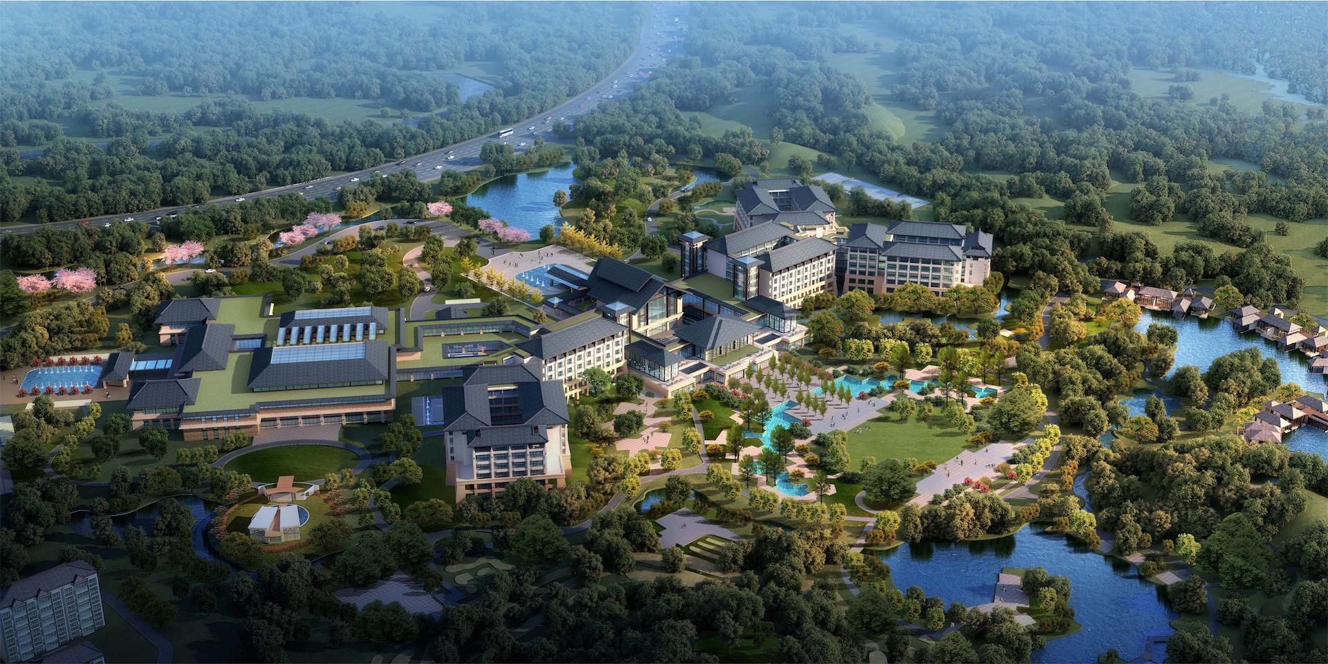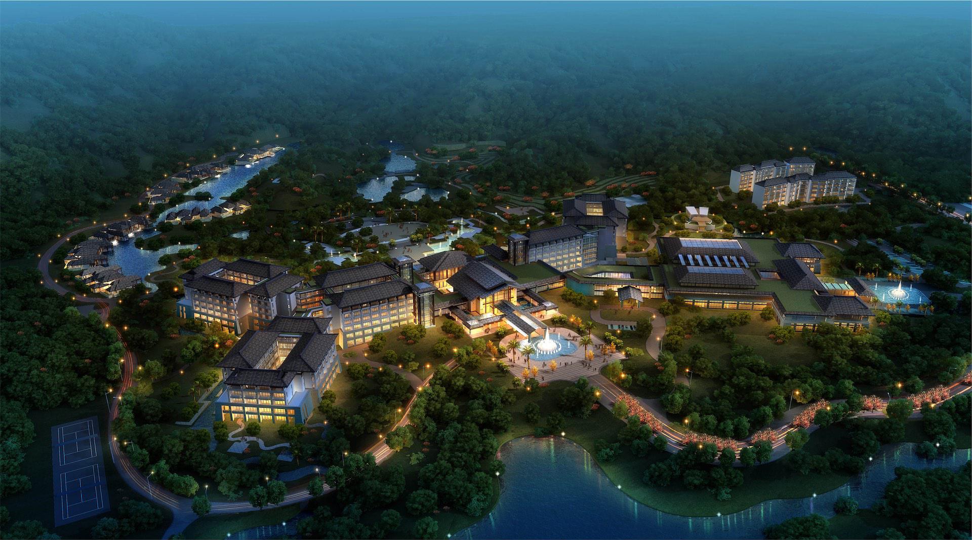 酒店主体面向自然山脉东西向舒展布局,北侧引入自然水系,建筑依水观山。内部采用庭院围合的形式,营造怡人尺度的庭院景观,步移景异。设计理念紧扣“人文”主题,根植地域建筑特色。外立面采用坡屋面造型,色彩古朴典雅。七字挑是当地民居檐口典型构件,通过檐口的细部设计,抽象地域特色的建筑符号,以体现当地建筑特色。