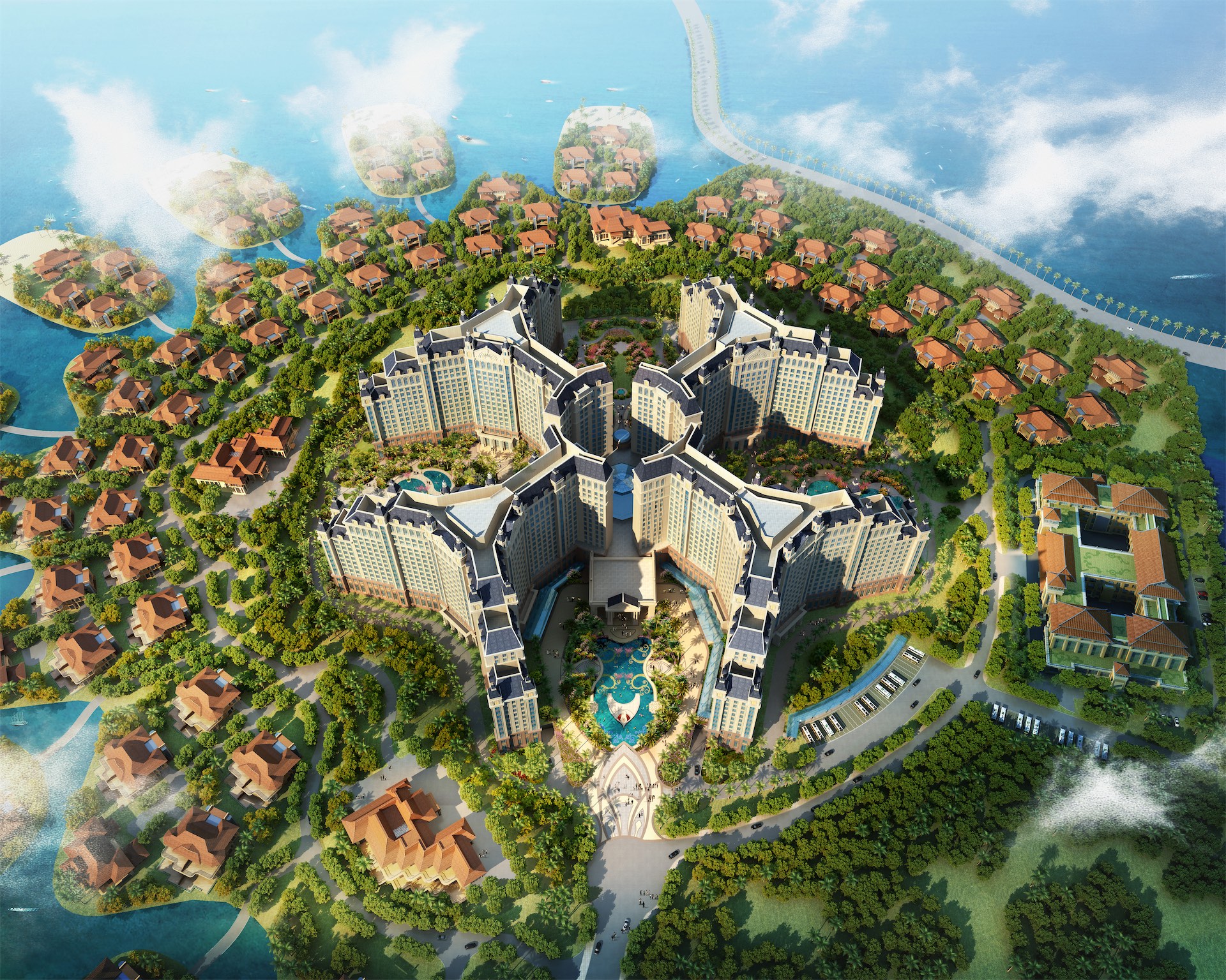 整个区域被葱郁的树木和浩瀚的海洋簇拥着,浓墨重彩回归于大自然,流溢着无限幽雅静谧之韵。七星级半岛酒店与欧式城堡度假酒店作为一个整体,总体规划设计中以“海花绽放”为设计主题,在整体布局上形成了中心花蕊(欧式城堡度假酒店)与周围花瓣(七星级半岛酒店)相融合的设计效果。