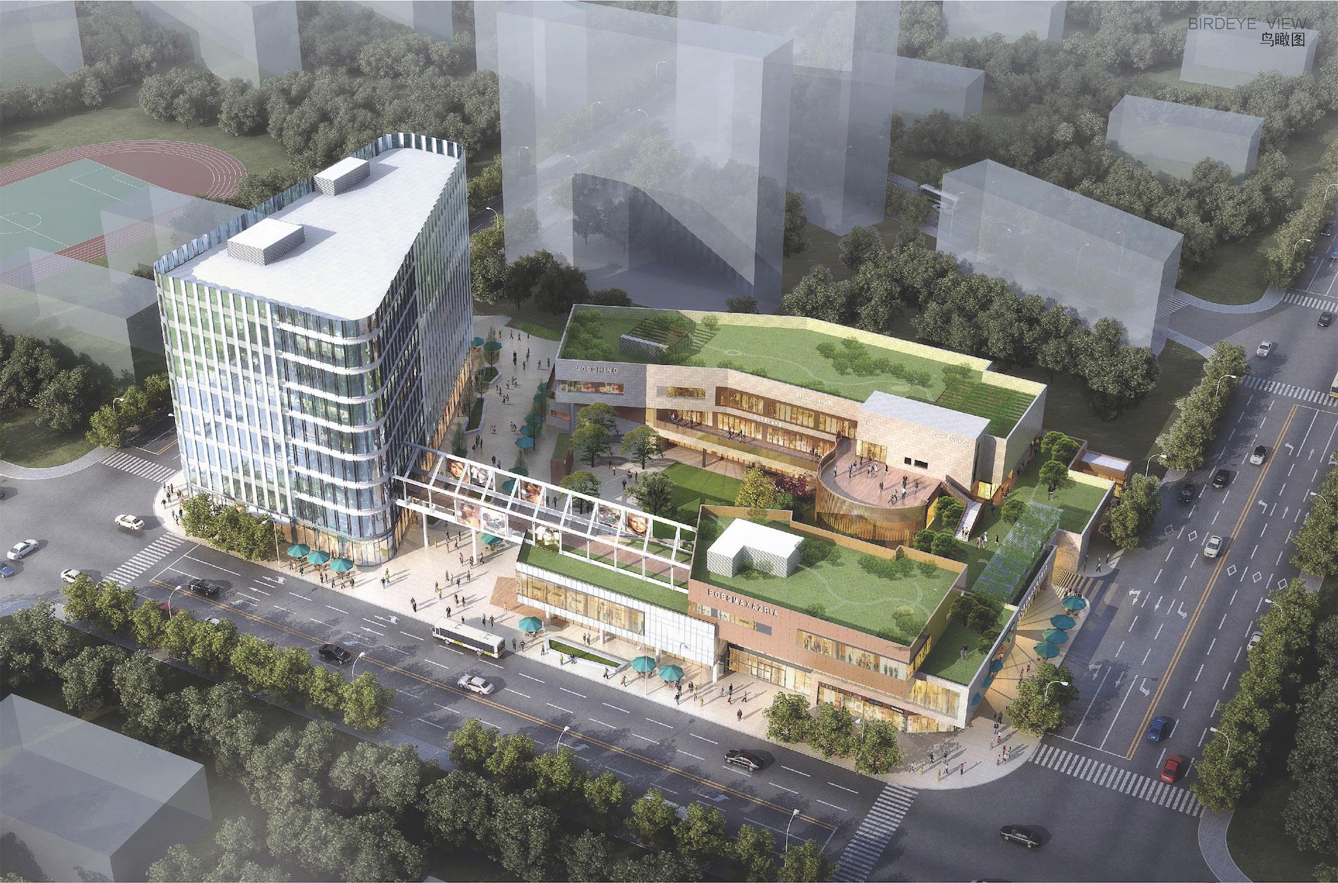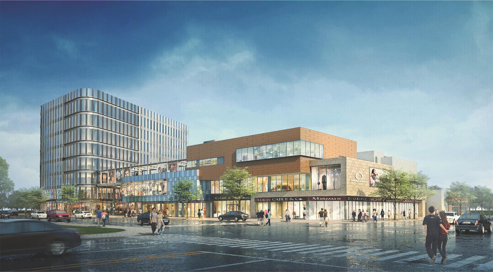 建筑多层区域立面以米色石材为主,局部穿插深褐色体块形成现代建筑的简约风格,辅以深色铝合金窗框,整体色彩细腻典雅。横向上运用深浅颜色对比,并以若干色差微妙的颜色相互组合,形成既协调又富有变化的立面效果。建筑高层区域采用银色金属材质及立面具有韵律感的开窗形式在纵向上形成节奏感,与多层区域建筑形成横竖对比,相互烘托,围合成良好的城市空间,并与对面街区空间相互呼应。项目中社区服务及商业部分采用预制装配式,总体实际装配建筑面积实施比例85.6%。