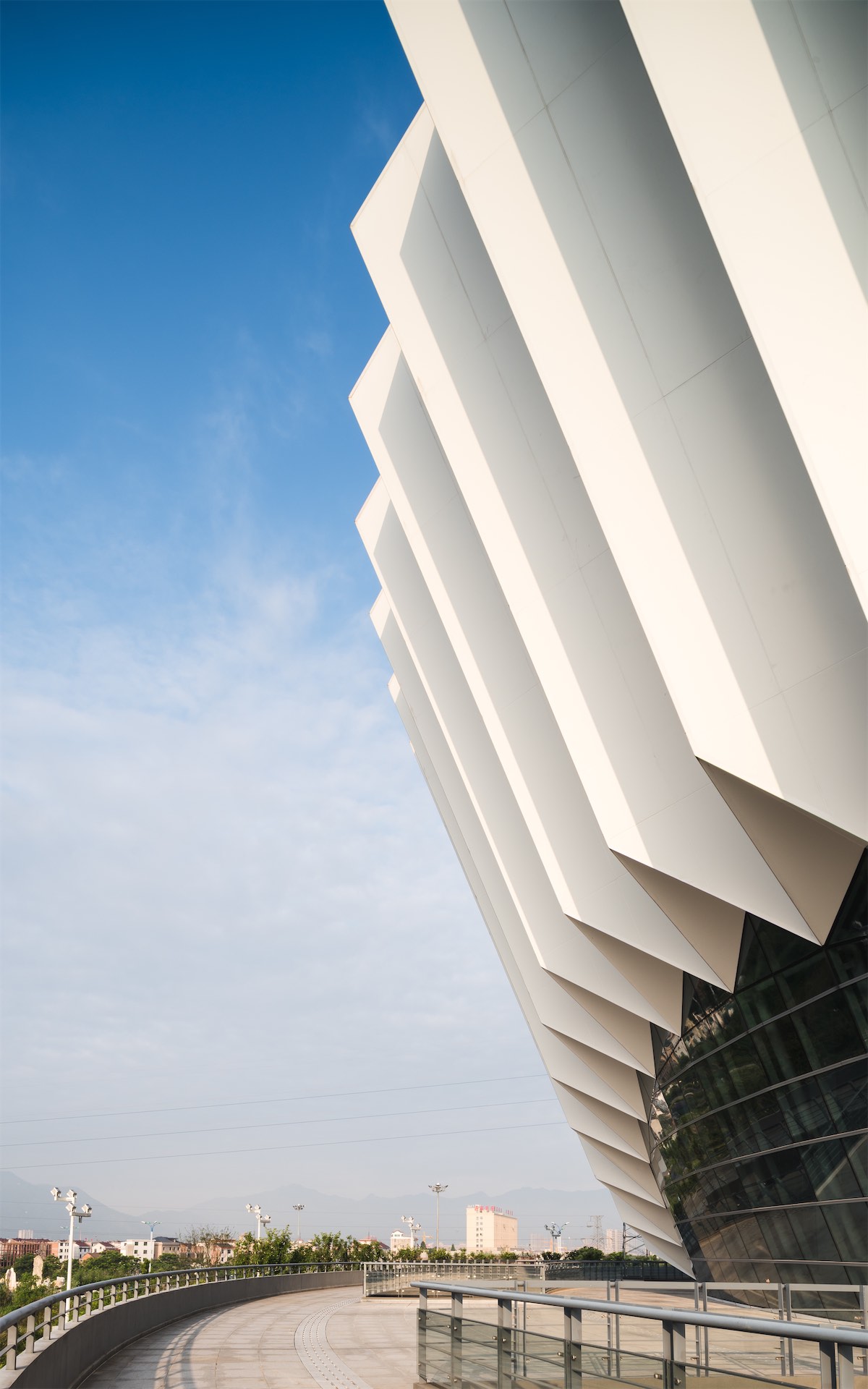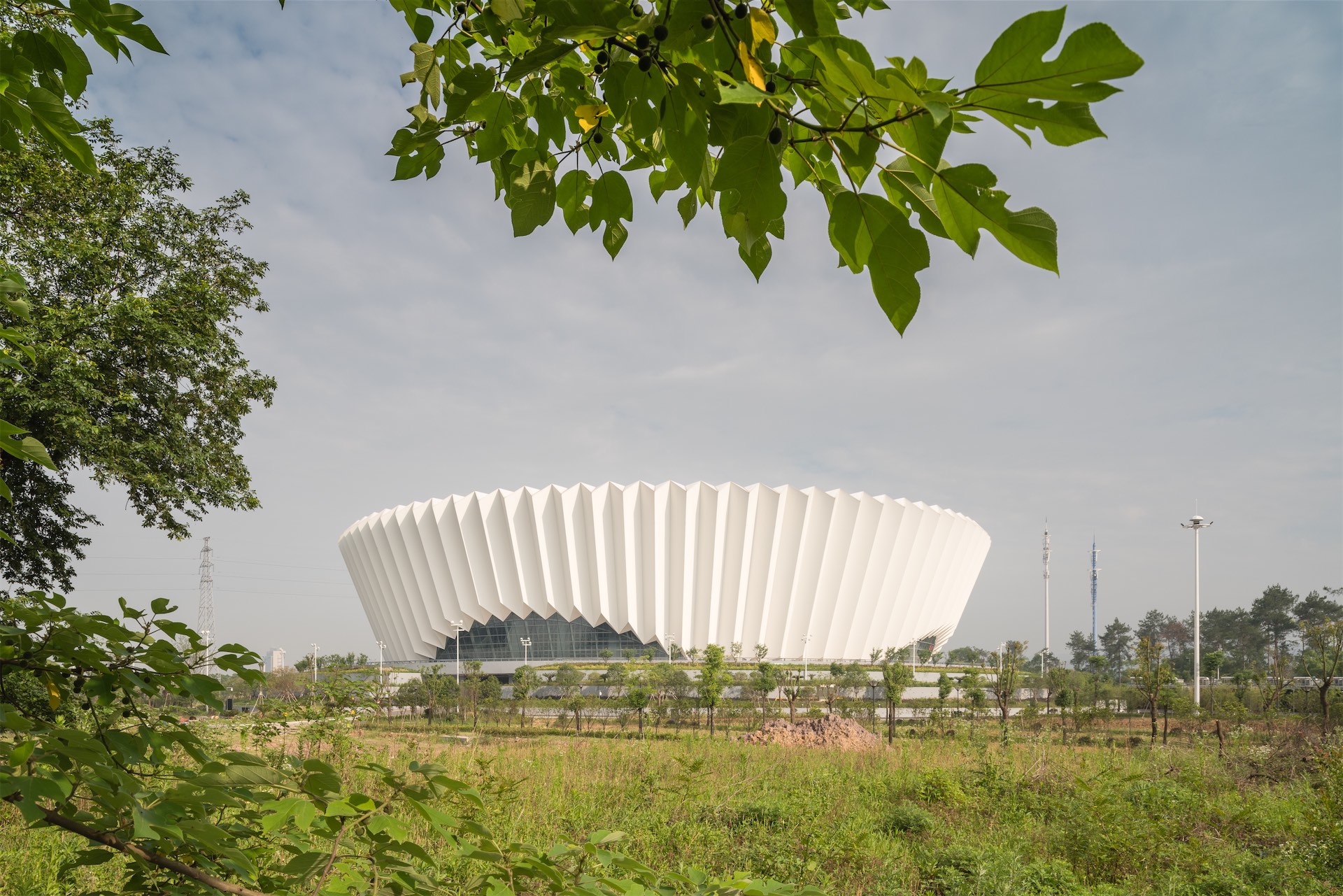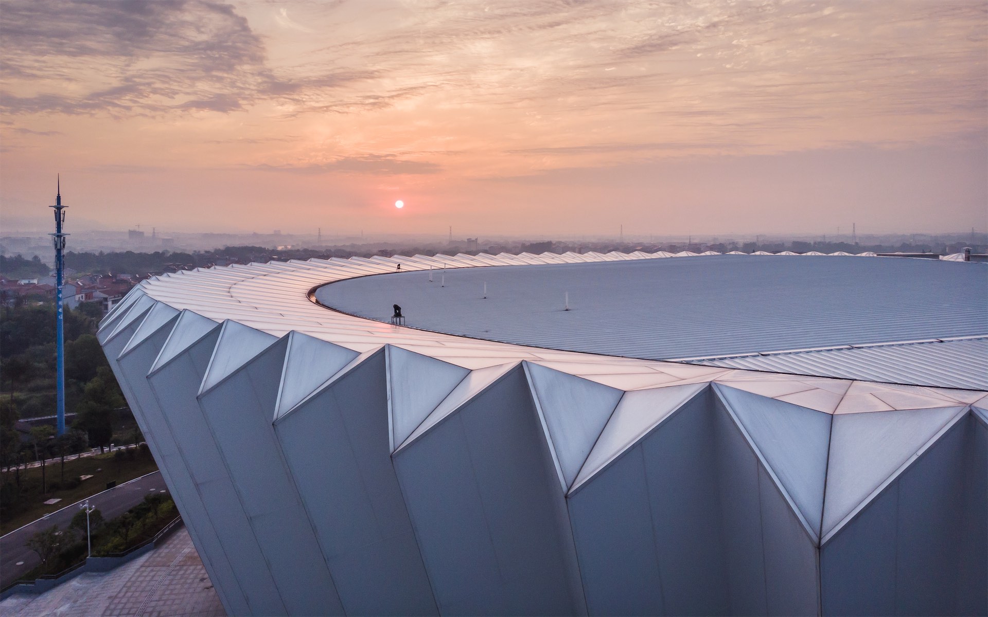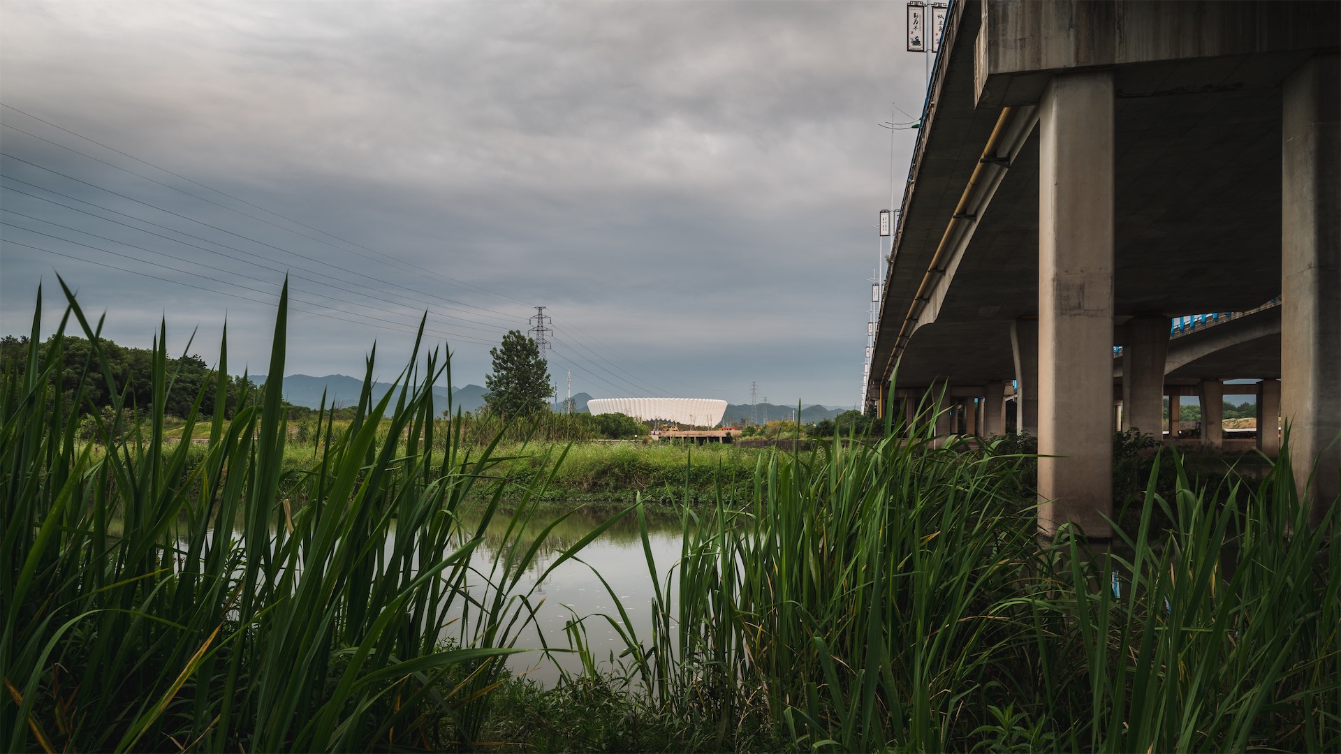 东阳市体育中心项目位于东阳江南岸,总体拟将新建的体育中心融入原有滨江景观规划体系内,使其成为浑然一体的滨江景观带。总平面布局为由建筑单体围合而成的滨江体育文化公园,覆盖面积为30公顷 ,其中包括体育场、体育馆、游泳馆的场馆区以及相关的室外训练场地和水体公园。