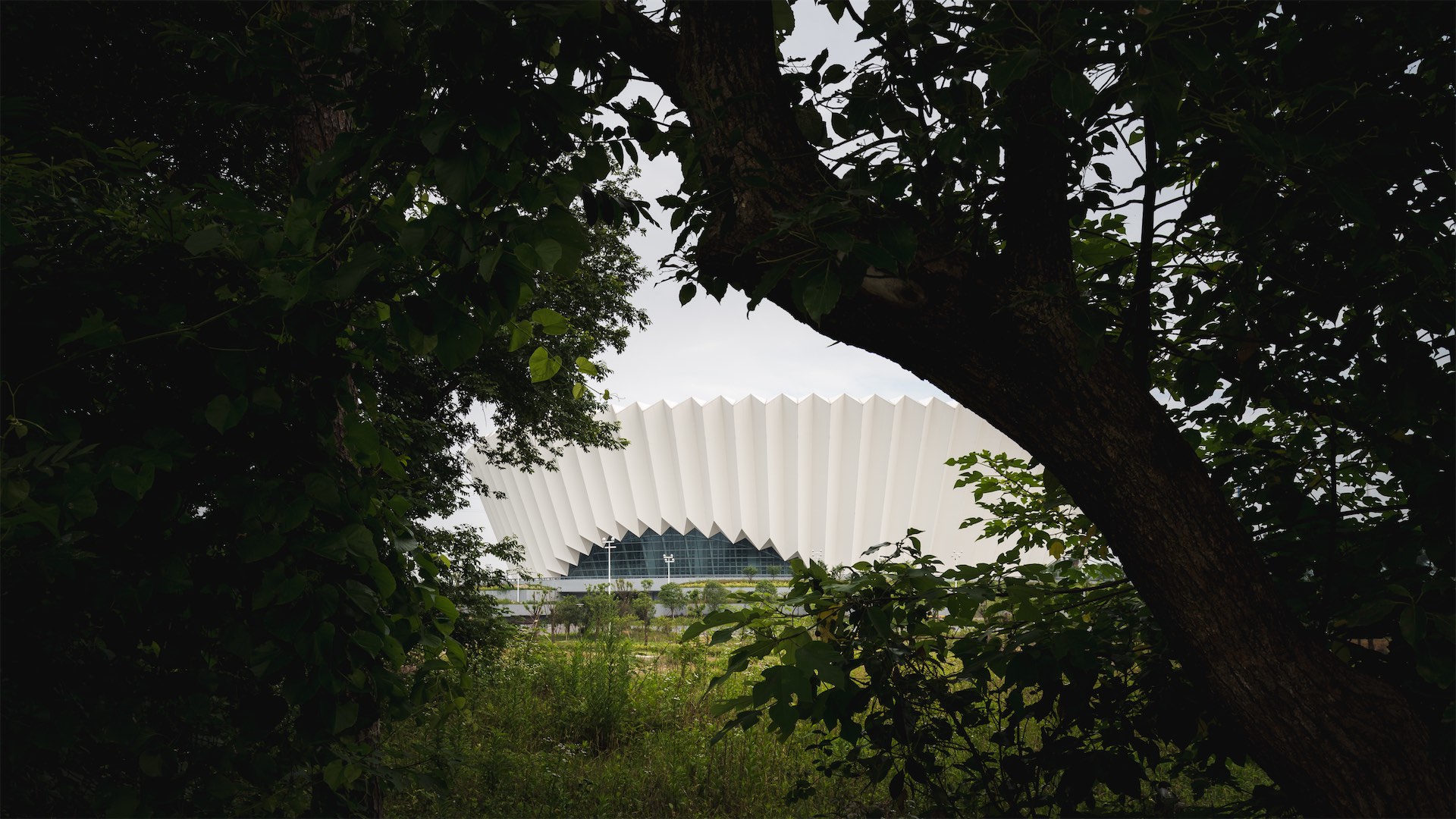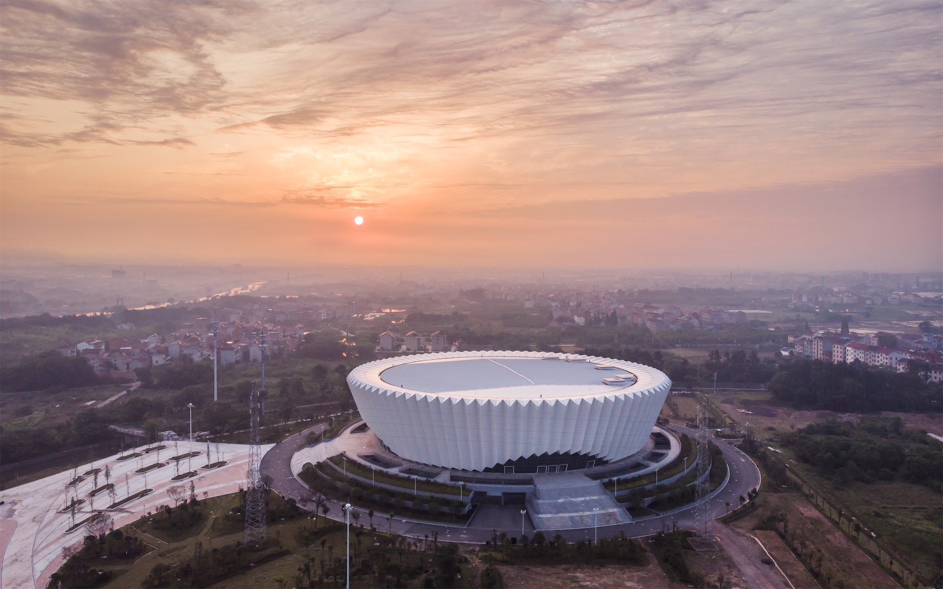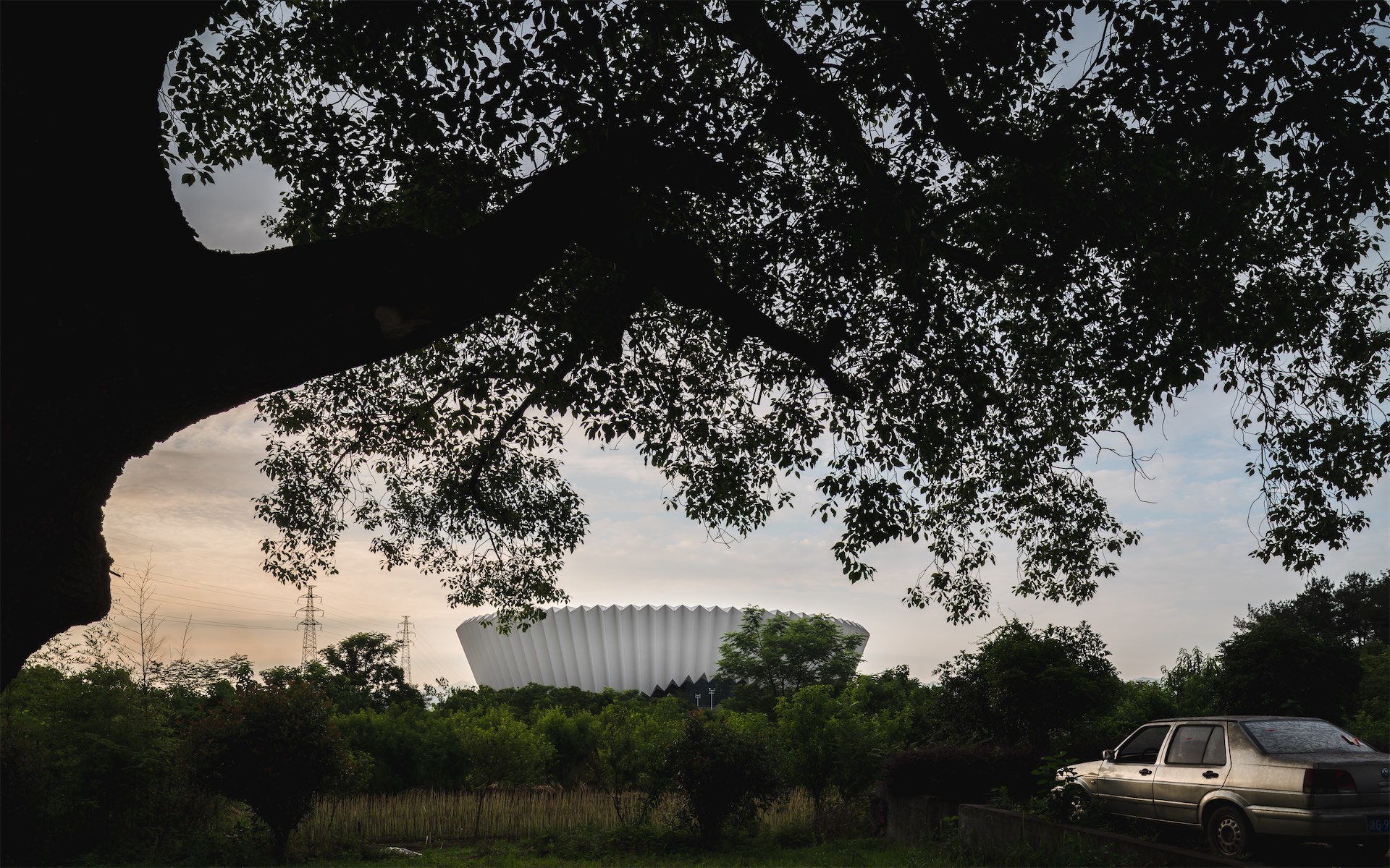 东阳市体育中心项目位于东阳江南岸,总体拟将新建的体育中心融入原有滨江景观规划体系内,使其成为浑然一体的滨江景观带。总平面布局为由建筑单体围合而成的滨江体育文化公园,覆盖面积为30公顷 ,其中包括体育场、体育馆、游泳馆的场馆区以及相关的室外训练场地和水体公园。