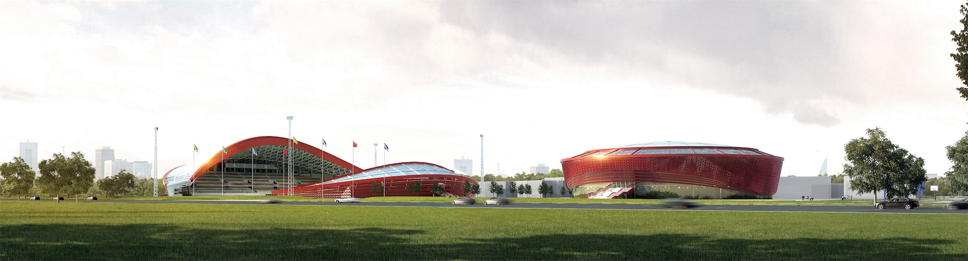 体育场馆根据其不同的大小和几何形体要求,通过一致的材料及结构原则将建筑体群构建为一个统一的组群。外立面采用镂空铝单板材料形成鳞状,远远看去鳞光闪闪,在不同的光影条件下呈现不同的建筑效果。