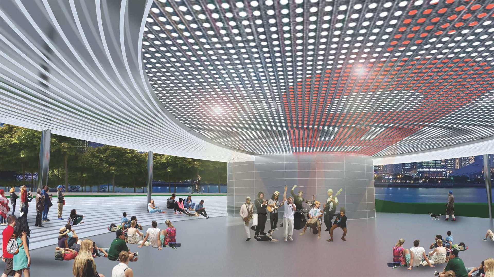 项目选择底层架空的概念为出发点,既可以保持公园步道连续完整的视野,减少对绿地植被的侵扰,也可以给使用球场的公众带来在绿树环绕中俯望滨江的独特体验。圆润有机的形体可以更好地融入周围的绿地景观,与一滴水、彩虹桥等周围建筑呼应,保持与现有天际线的和谐统一。极具标志性的飞碟状屋顶,动态地向浦江两岸投射信息,使建筑不再是凝固的容器,也成为城市与人互动的主体。同时,这个天幕也可为篮球比赛投影比分,为活动营造氛围,兼具功能性和艺术性。