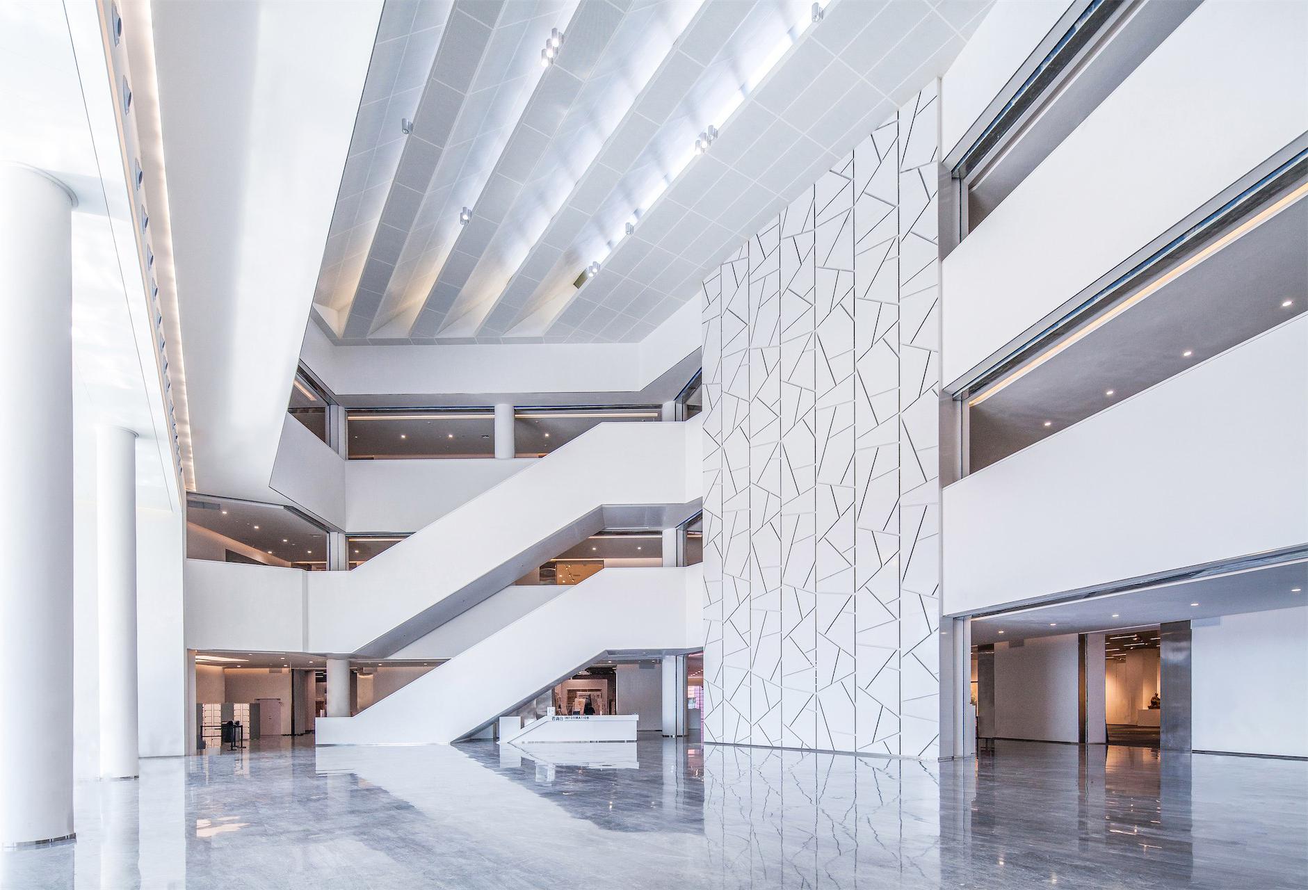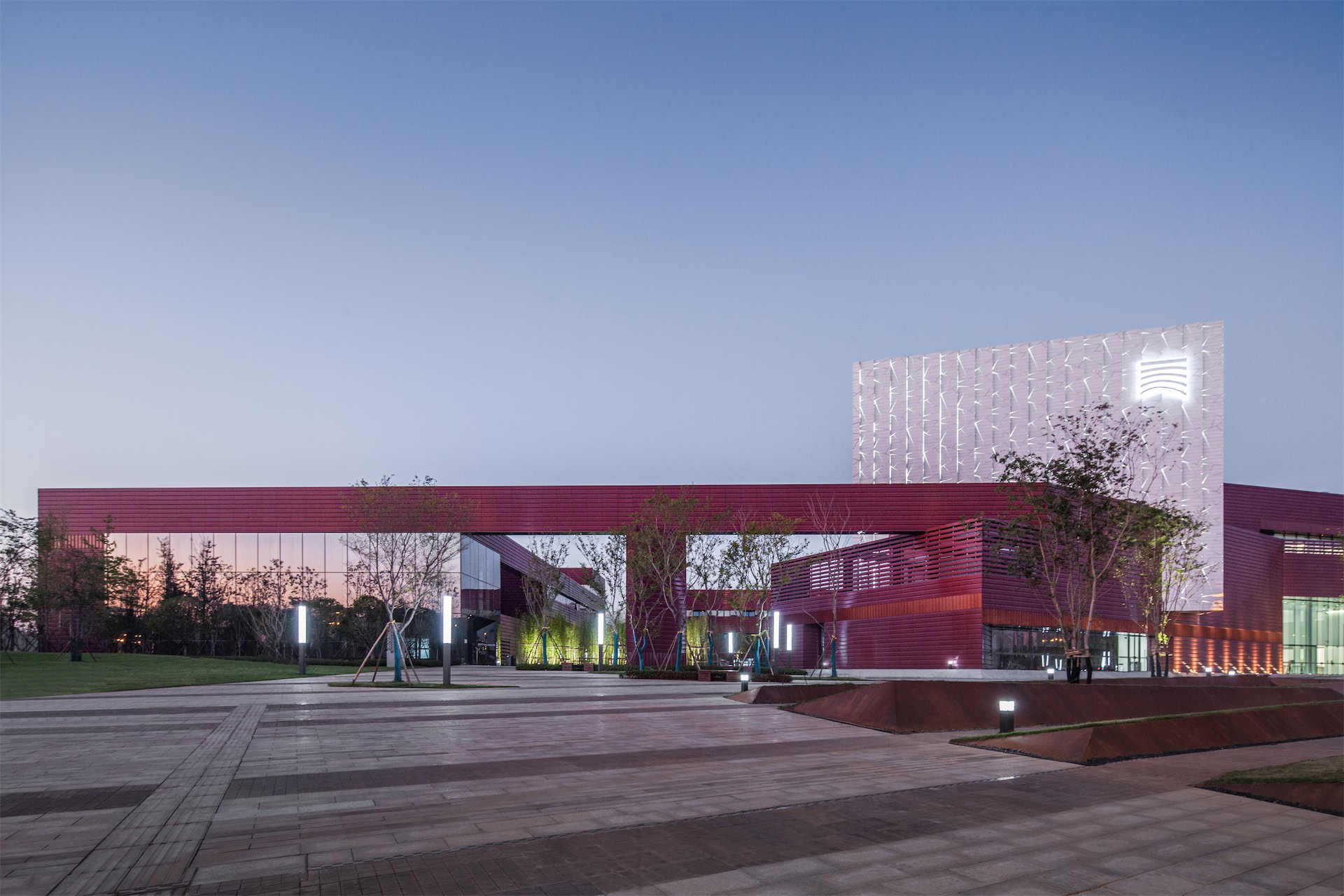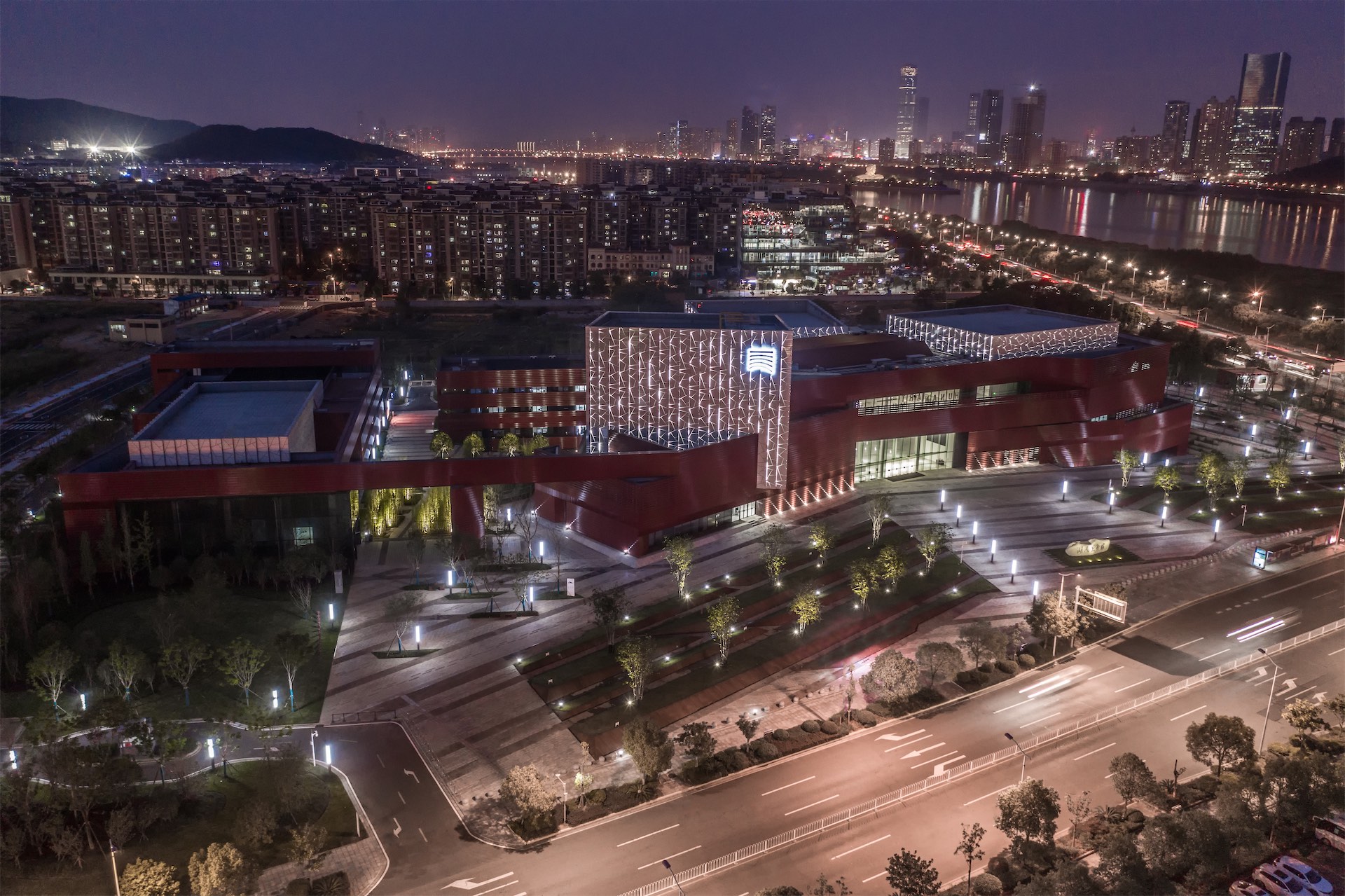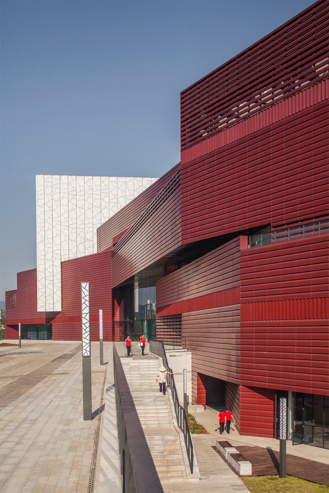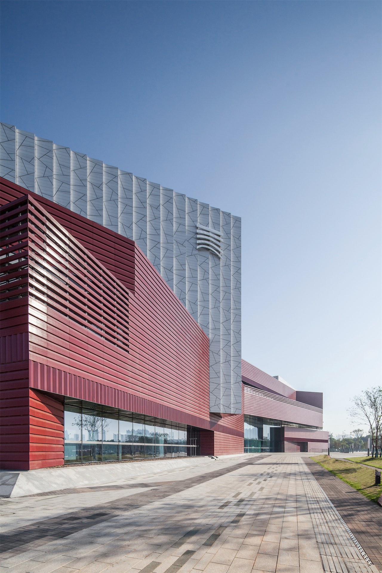 位于湘江西岸的省级美术馆,设计概念为“朱印湘畔”,将湖南深厚的红色文化底蕴和中国传统美术文化写意融合。 建筑红色的横向肌理和白色的冰裂纹饰面采用釉面陶板巧妙的拼贴起来,光影的变化形成独特的建筑氛围。