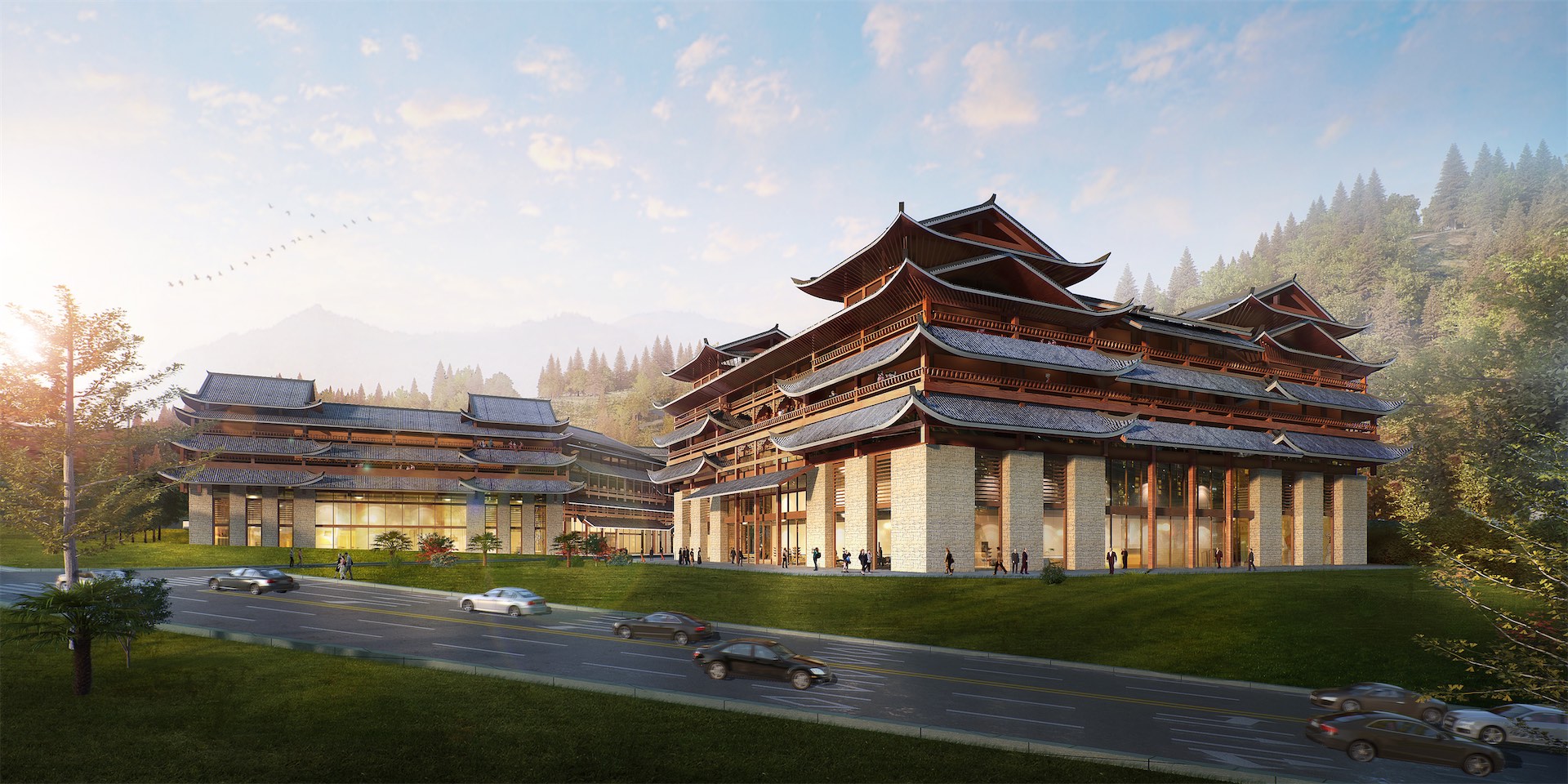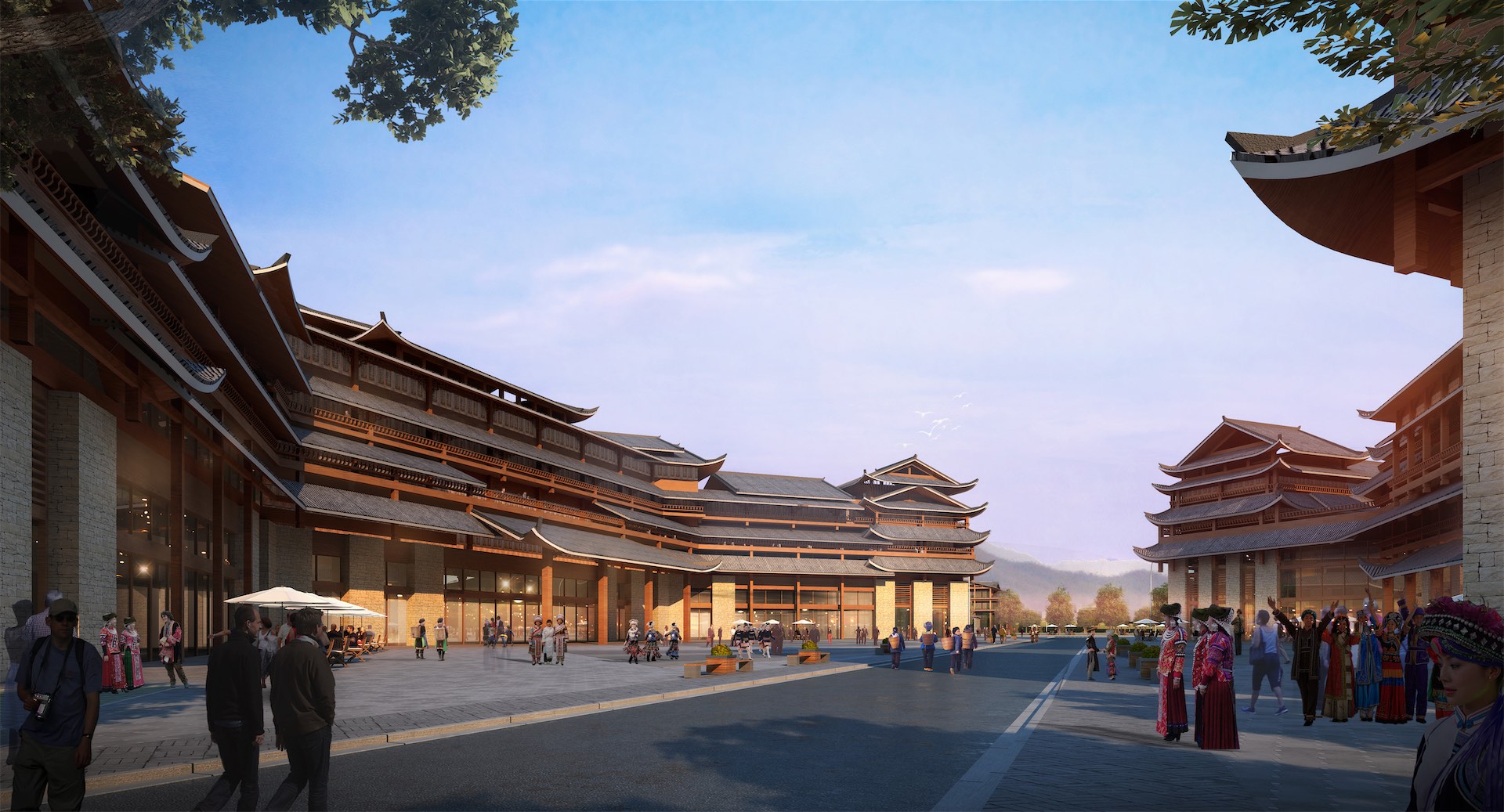 主体建筑造型强调对苗族传统建筑的呼应,选用苗族传统的吊脚楼和风雨桥作为造型立意,与蝴蝶的平面意向结合,形成片区标志性建筑。